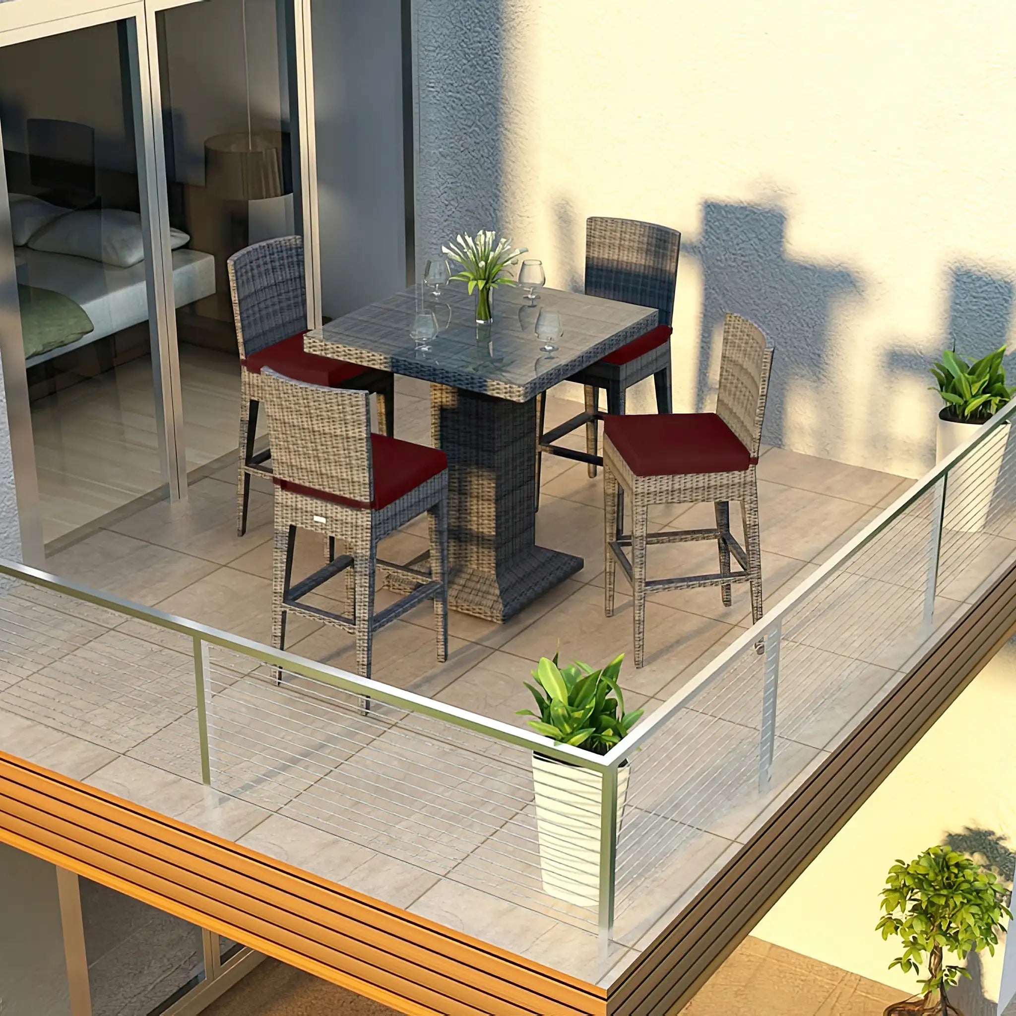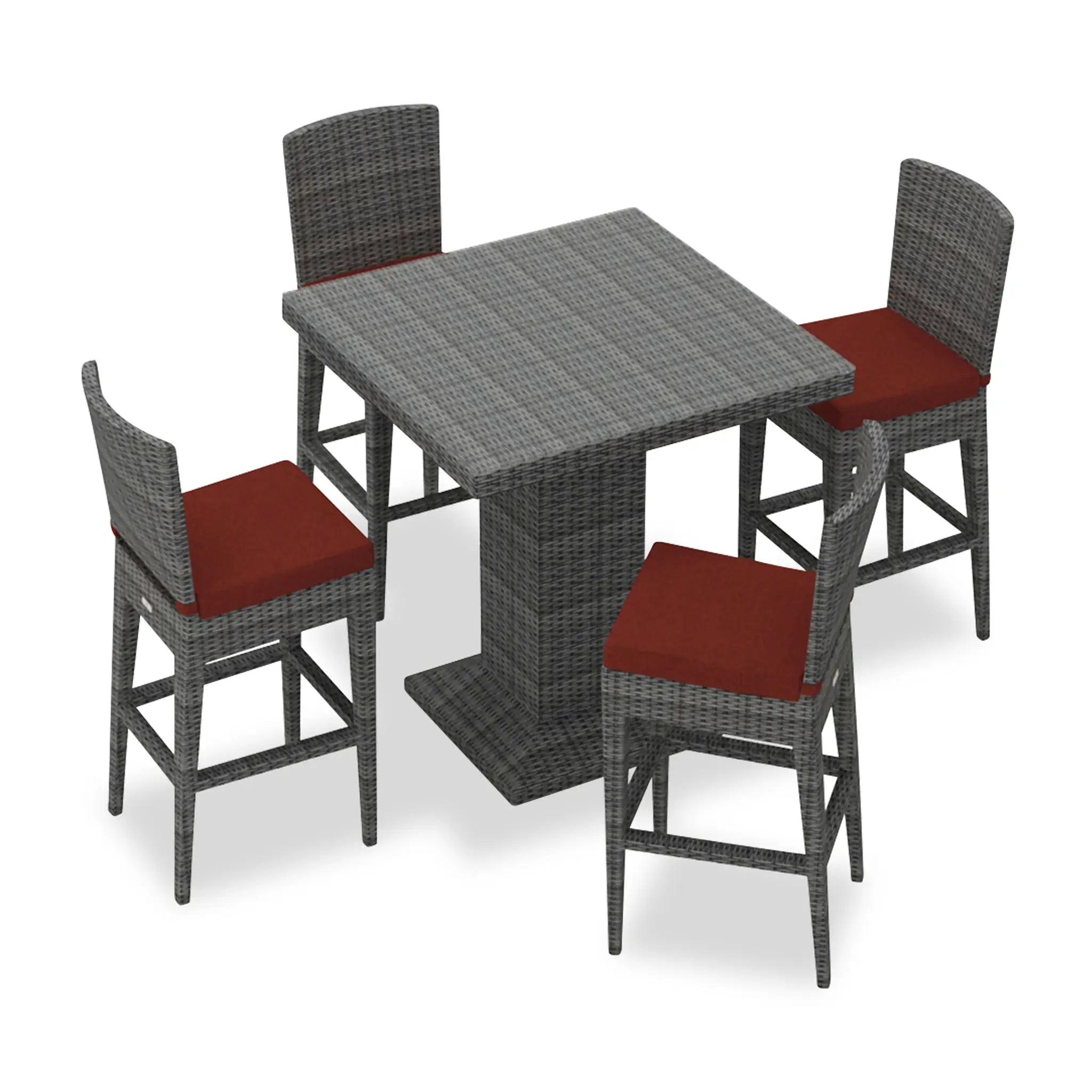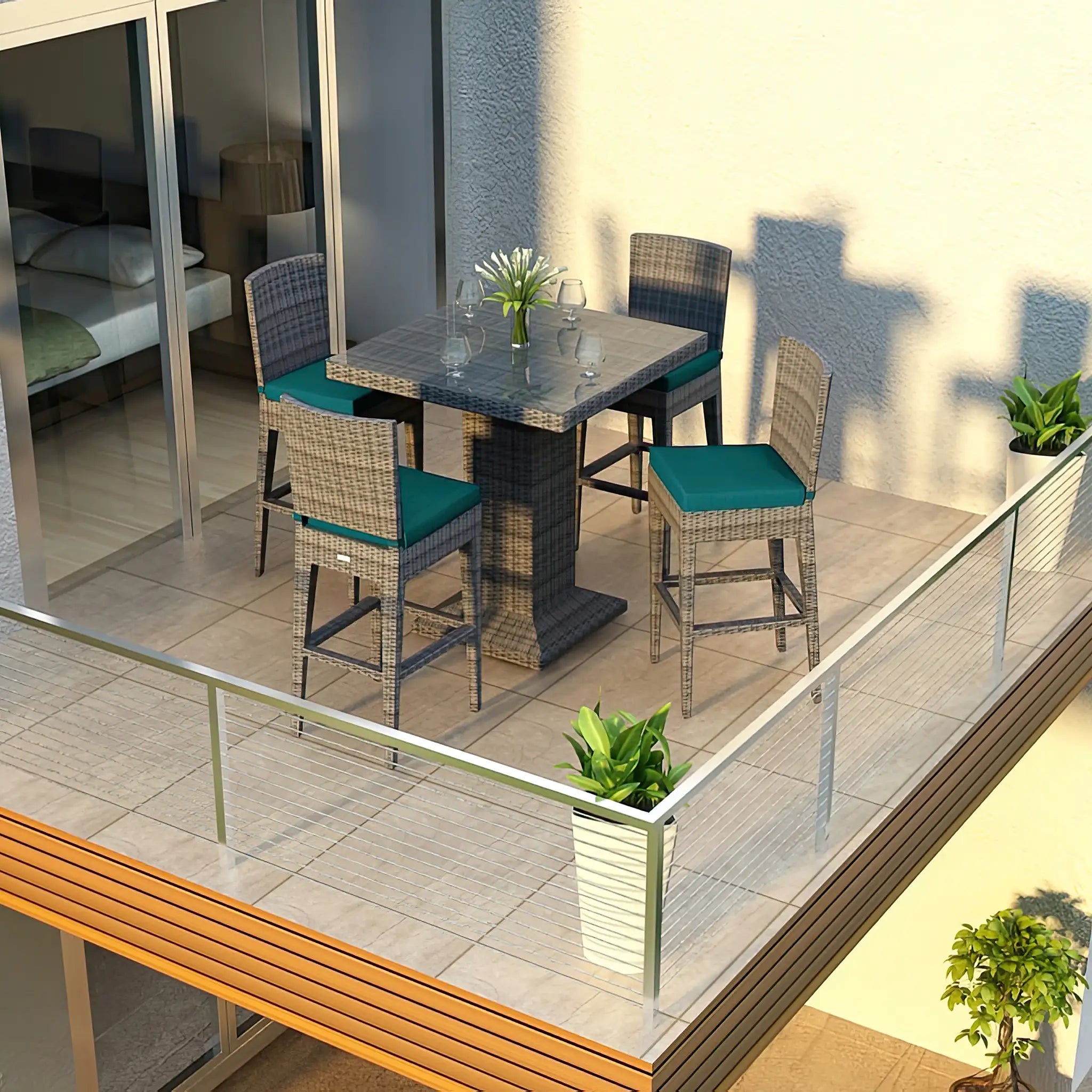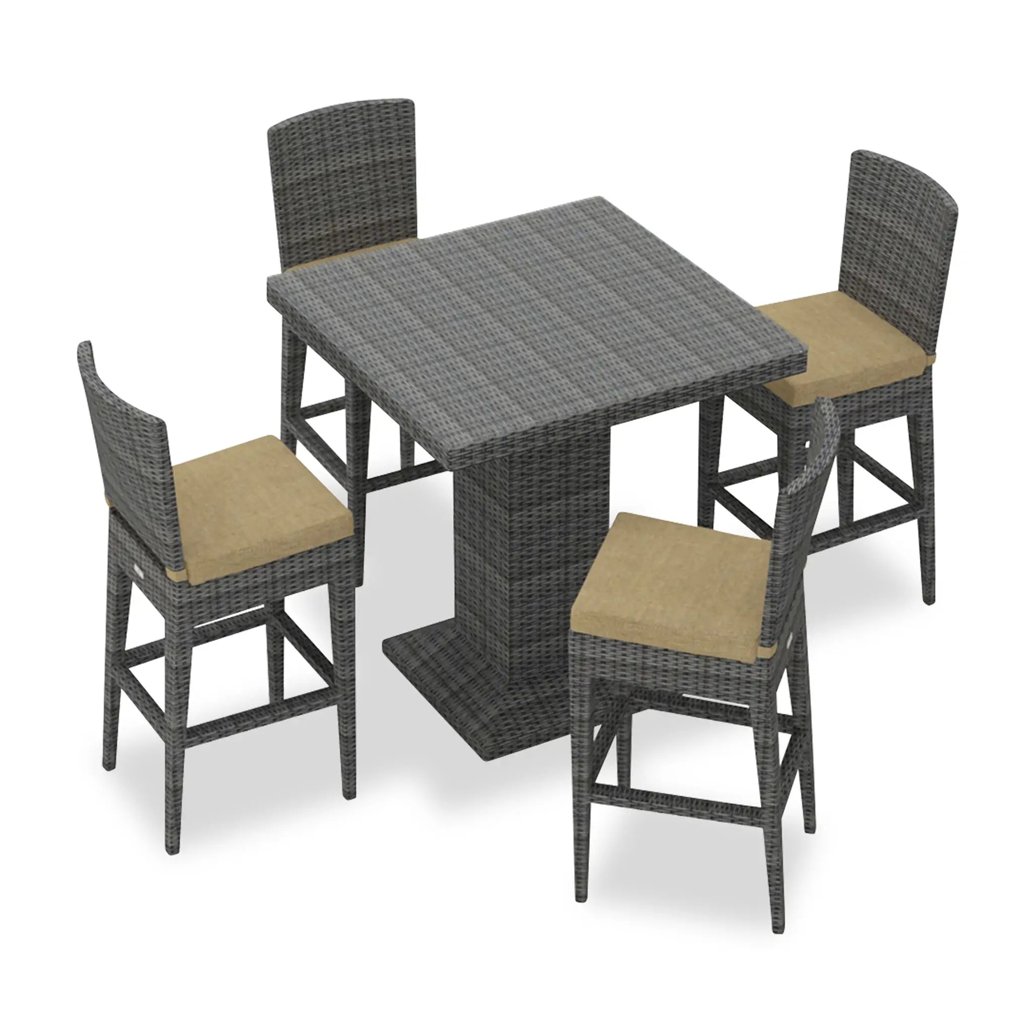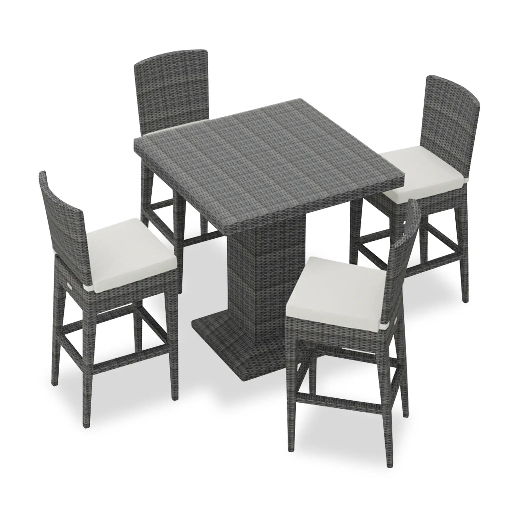 The Harmonia Living District 5 Piece Aluminum Bar Set offers a sleek and modern design, enhancing the aesthetic of any outdoor setting. Its clean, minimalist structure is built to withstand the elements, featuring fully-welded aluminum frames coated with a powder finish for lasting durability. This ensures that the set maintains its high performance throughout the seasons. The wicker is meticulously hand-woven from High-Density Polyethylene (HDPE), a material known for its resistance to cracking and fading. The HDPE wicker is infused with color, which helps to prevent fading over time, and finished in a beautifully textured Slate color that offers a natural, earthy look.