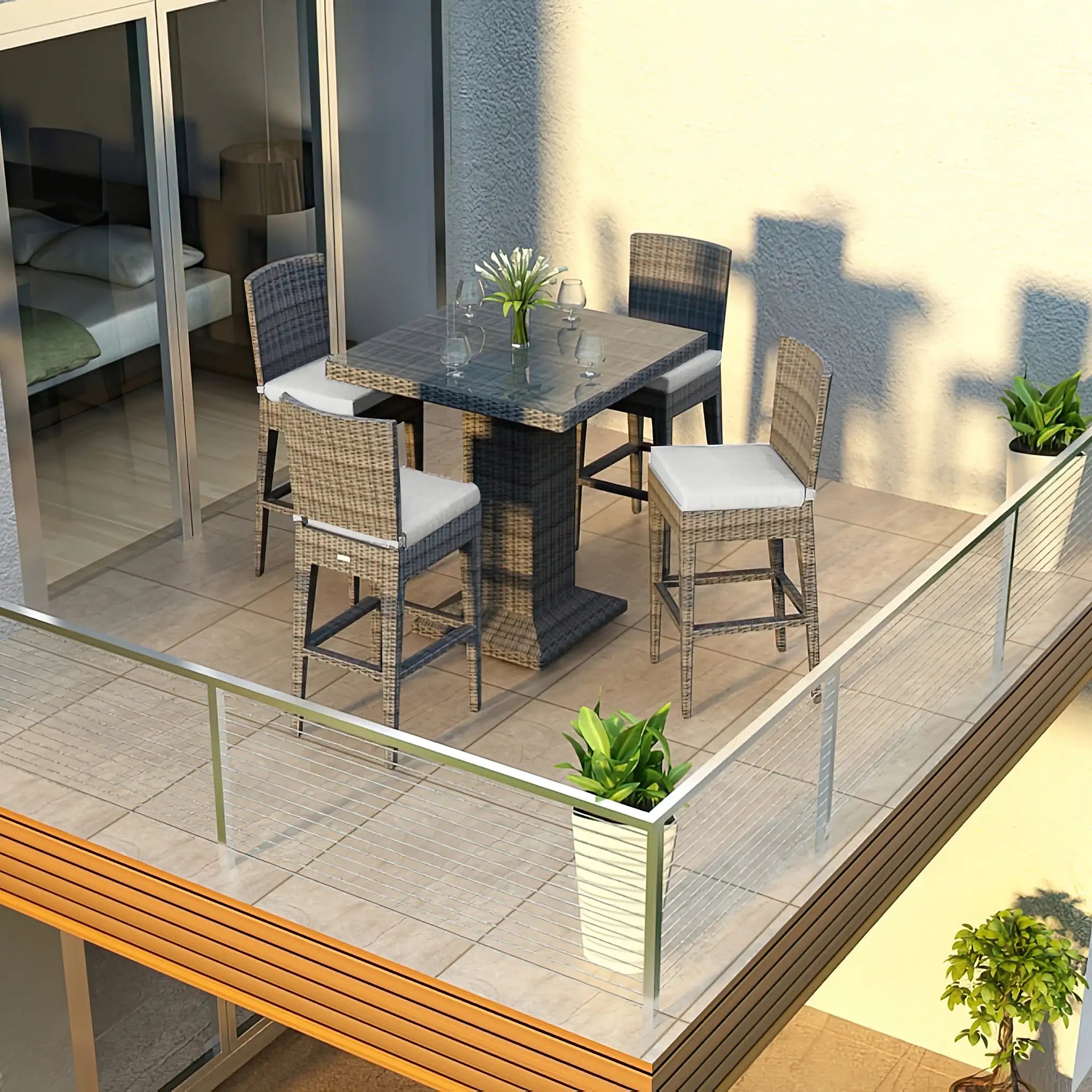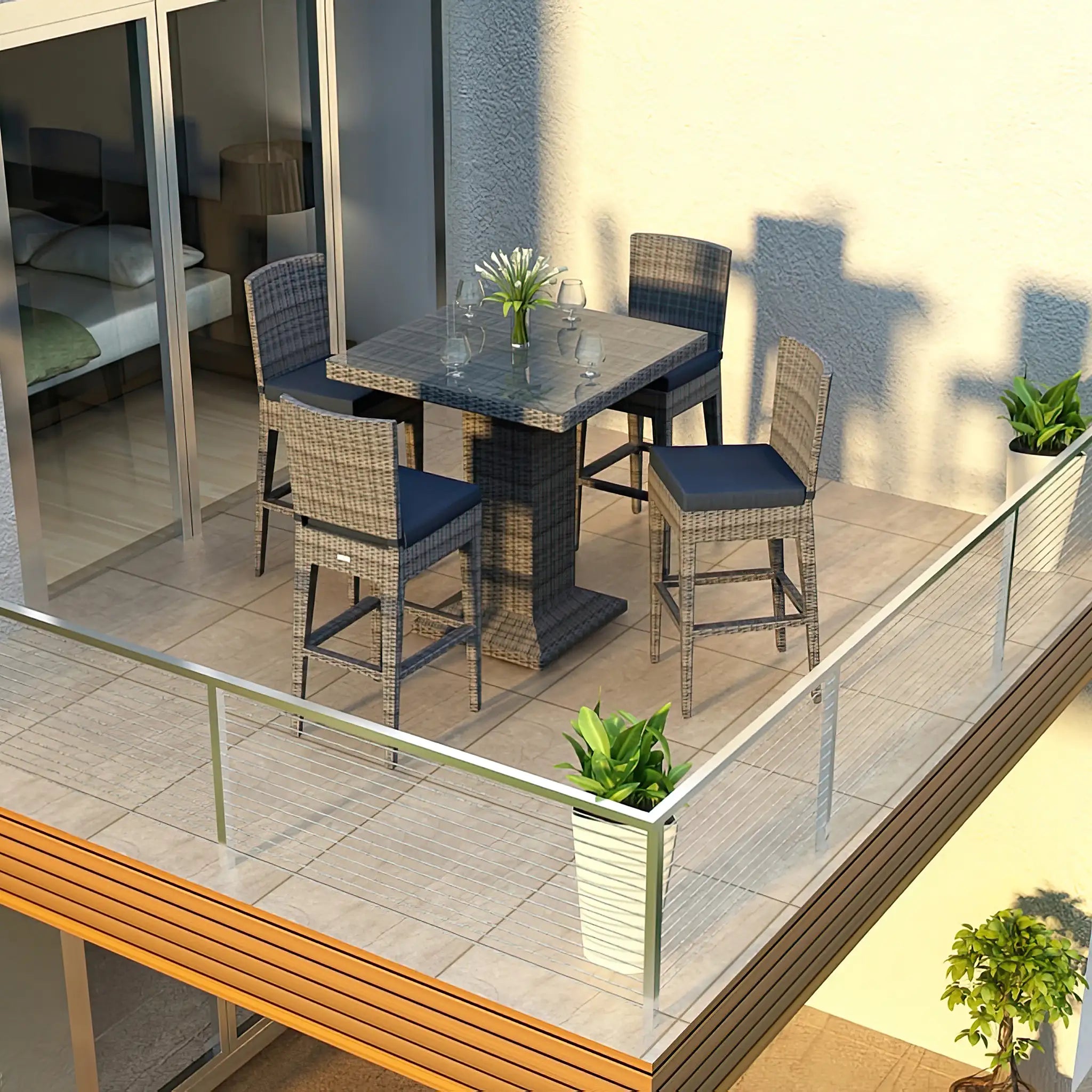 The table in this set is topped with tempered glass, known for its strength and durability, making it ideal for frequent use in outdoor environments. The glass provides a sleek, polished finish that complements the overall design of the set. Whether for a residential or commercial space, Harmonia Living delivers exceptional outdoor furnishings that combine style, durability, and practicality, making this bar set a perfect addition to any outdoor space.