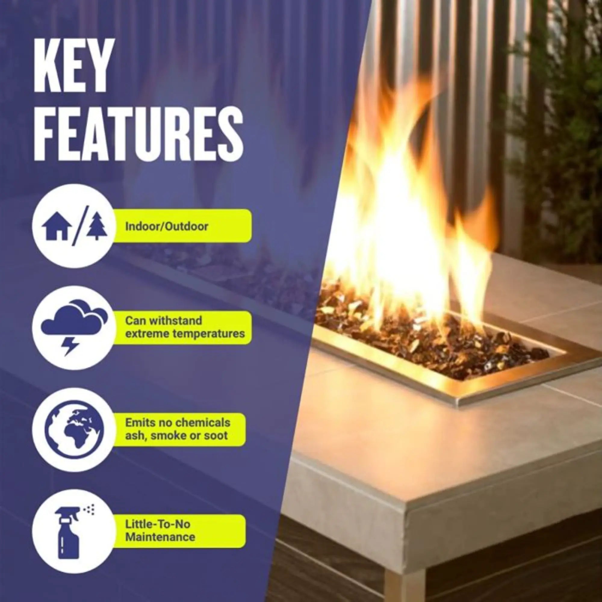 Crafted from tempered, tumbled glass, this fire media is built to withstand extreme temperatures without melting, fading, or emitting smoke. Each 1/2" piece is precision-cut and polished for smooth edges, ensuring safety during handling while offering a refined, jewel-like finish that won’t degrade over time.