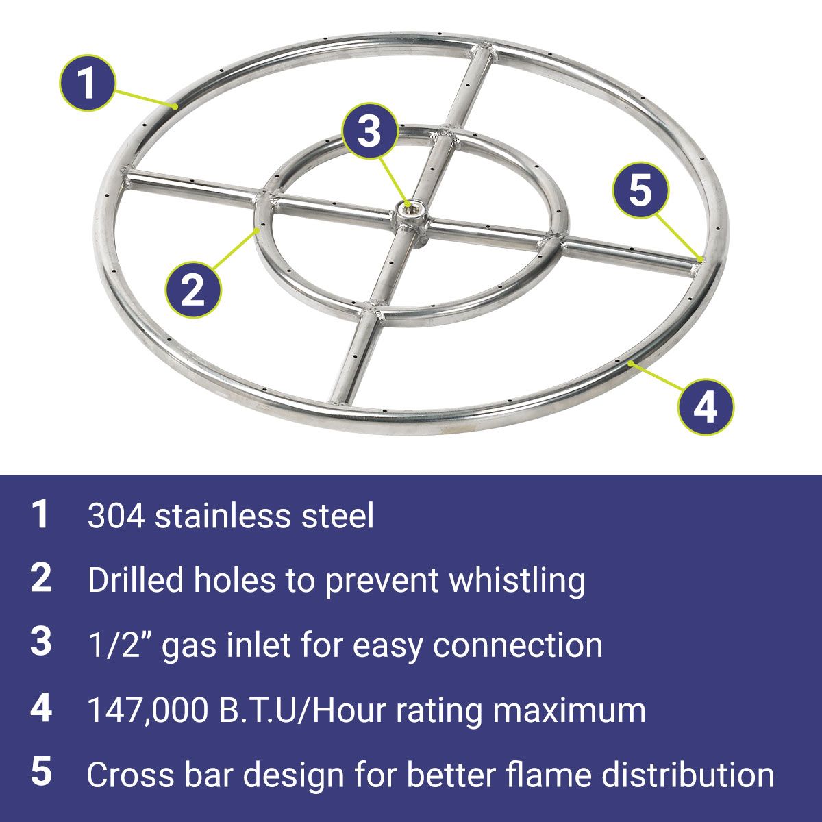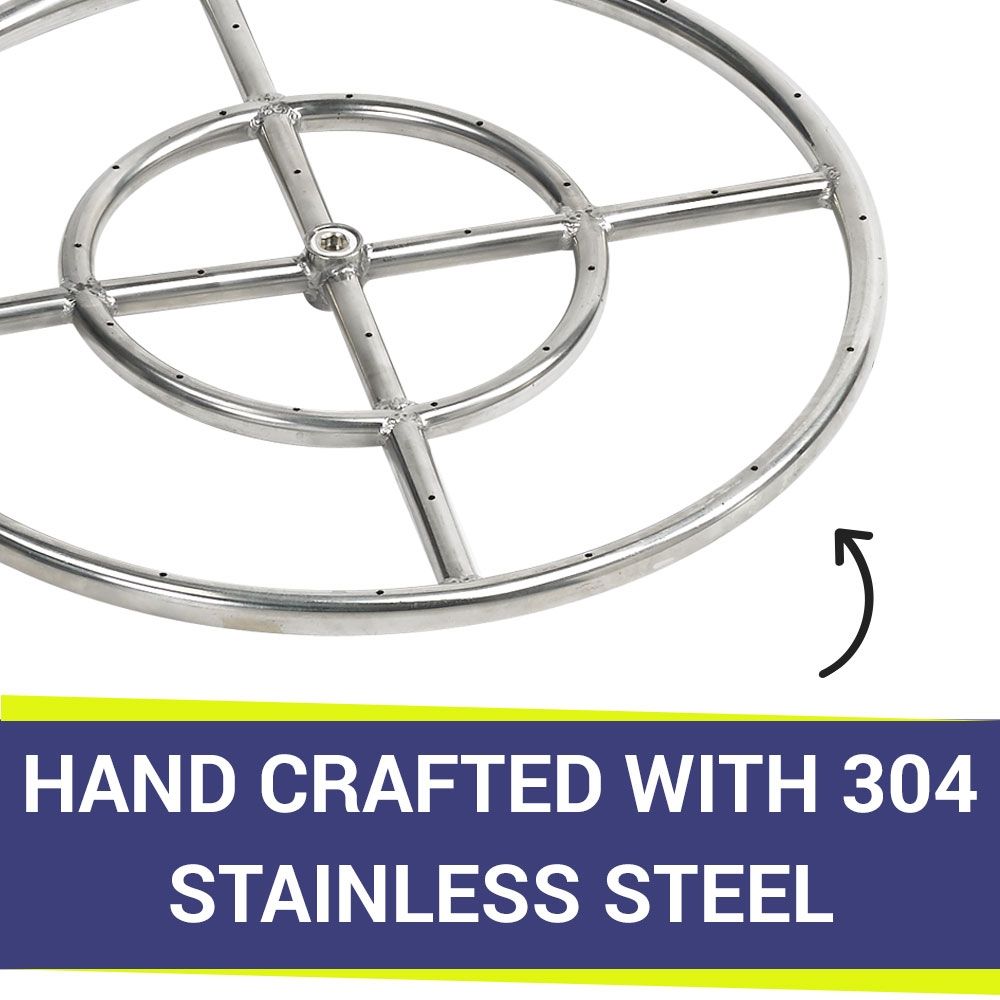 Constructed from 304 stainless steel, this fire ring is built to withstand high temperatures and harsh outdoor environments without rusting or corroding. Its welded center hub and strategically placed gas ports ensure balanced flame distribution, while its circular shape creates a natural, full-looking fire.