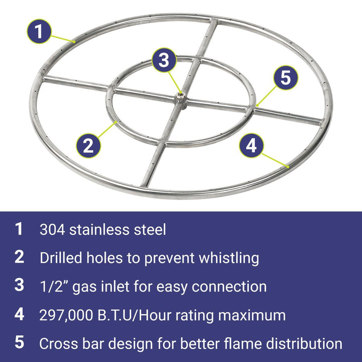 Constructed from 304 stainless steel, this fire ring is built to withstand high temperatures and harsh outdoor environments without rusting or corroding. Its welded center hub and strategically placed gas ports ensure balanced flame distribution, while its circular shape creates a natural, full-looking fire.