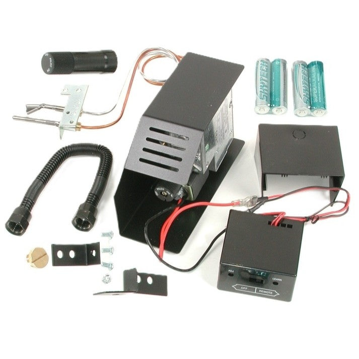 A premium safety pilot system designed for vented gas fireplaces, featuring a remote-ready receiver, thermocouple, ignition module, flexible gas tubing, and battery pack. Ensures convenient and secure control over gas log operation.