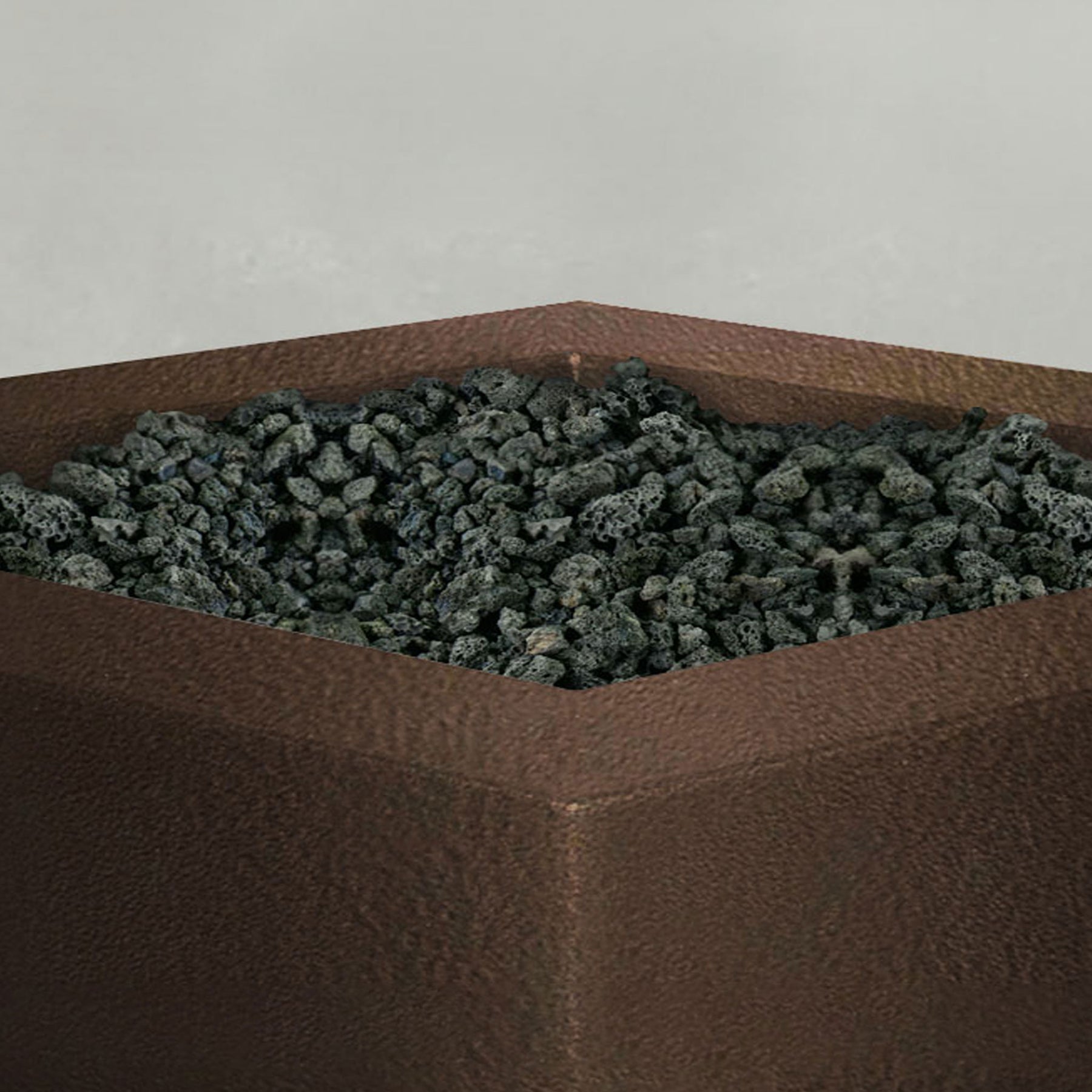A side view of the 36" Square Gravity Powder Coated Steel Fire Pit - Propane Gas Hardline - Flame Sense with Spark Ignition System - Bronze Hammertone by Starfire Designs - perfect for outdoor patio spaces. Natural gas or propane compatible, enhancing warmth and ambiance. Lava rocks included for added aesthetic.