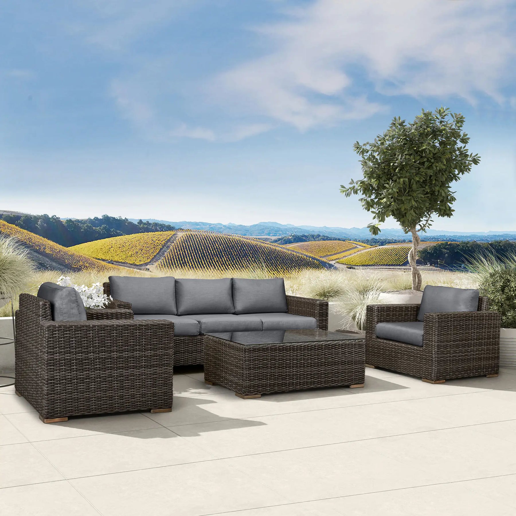 Built for long-lasting outdoor performance, the set features fully-welded aluminum frames that are powder-coated to resist rust and corrosion, ensuring year-round durability. The frames are wrapped in hand-woven High-Density Polyethylene (HDPE) wicker, a premium material known for its exceptional strength and weather resistance. Unlike traditional wicker, HDPE is crack-resistant and infused with color, preventing fading over time. Finished in a richly textured Driftwood hue, the wicker provides a natural aesthetic while maintaining superior durability.