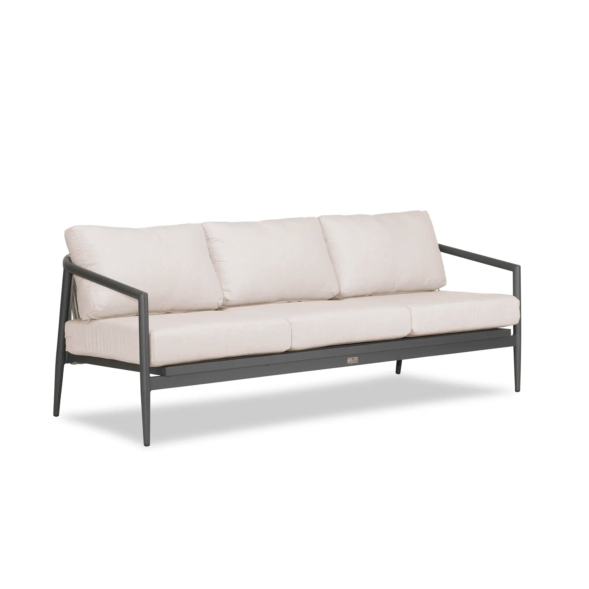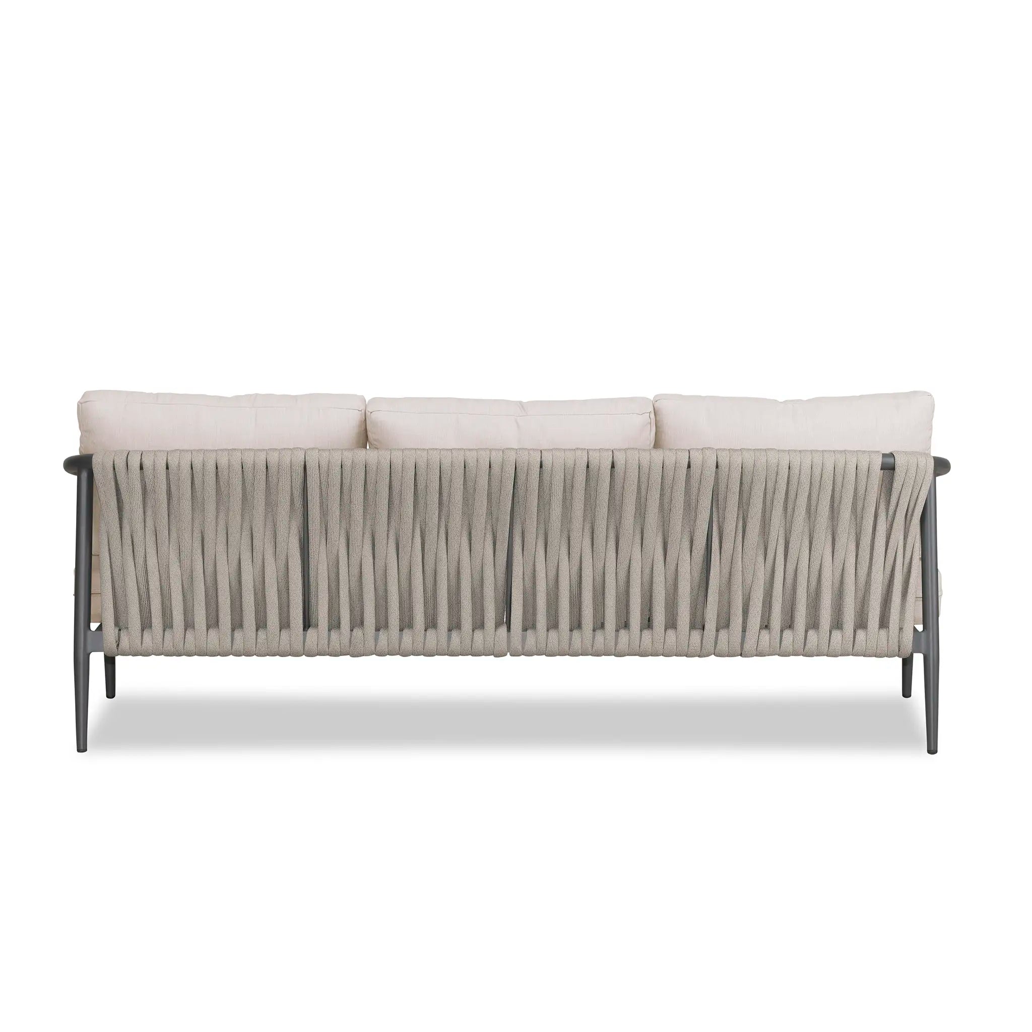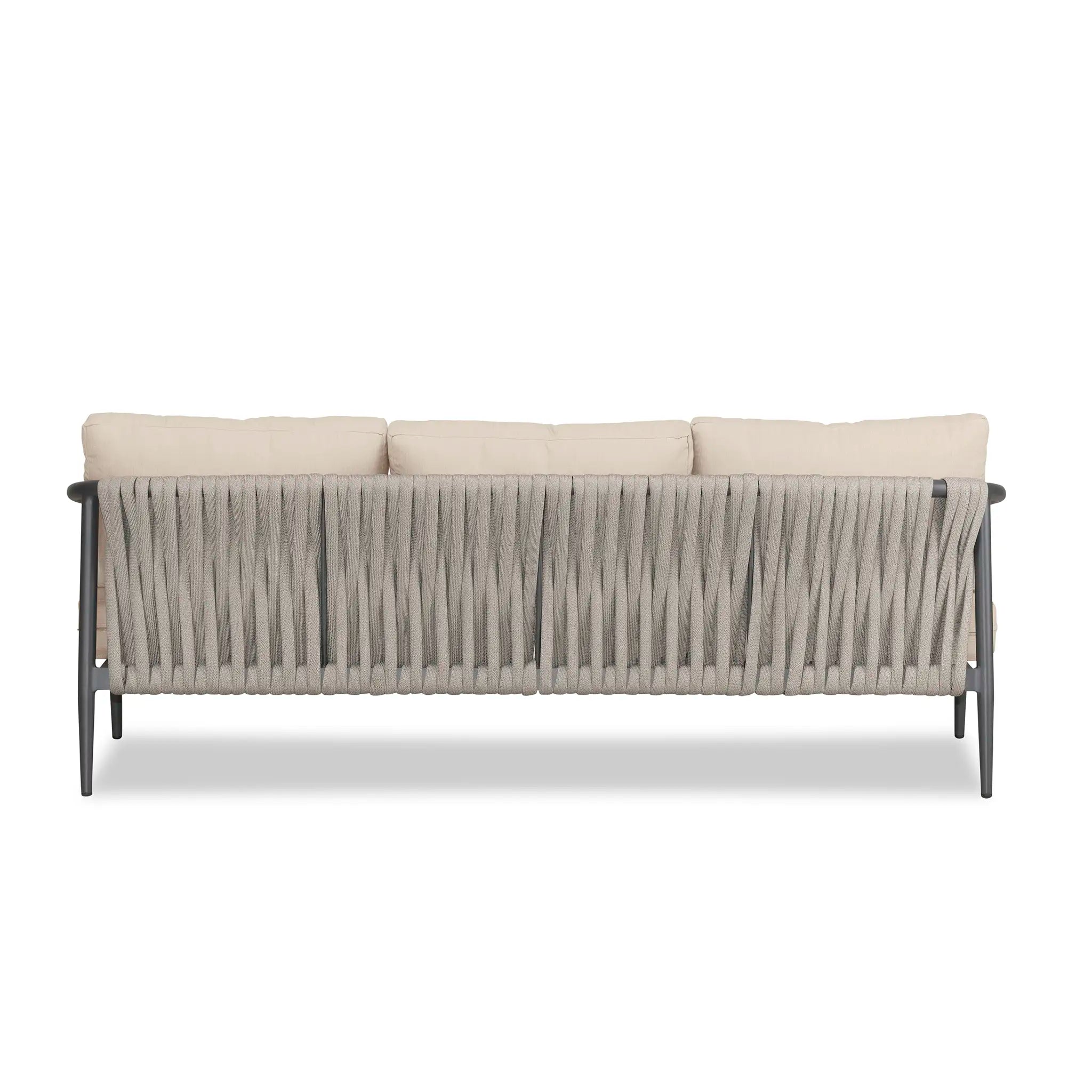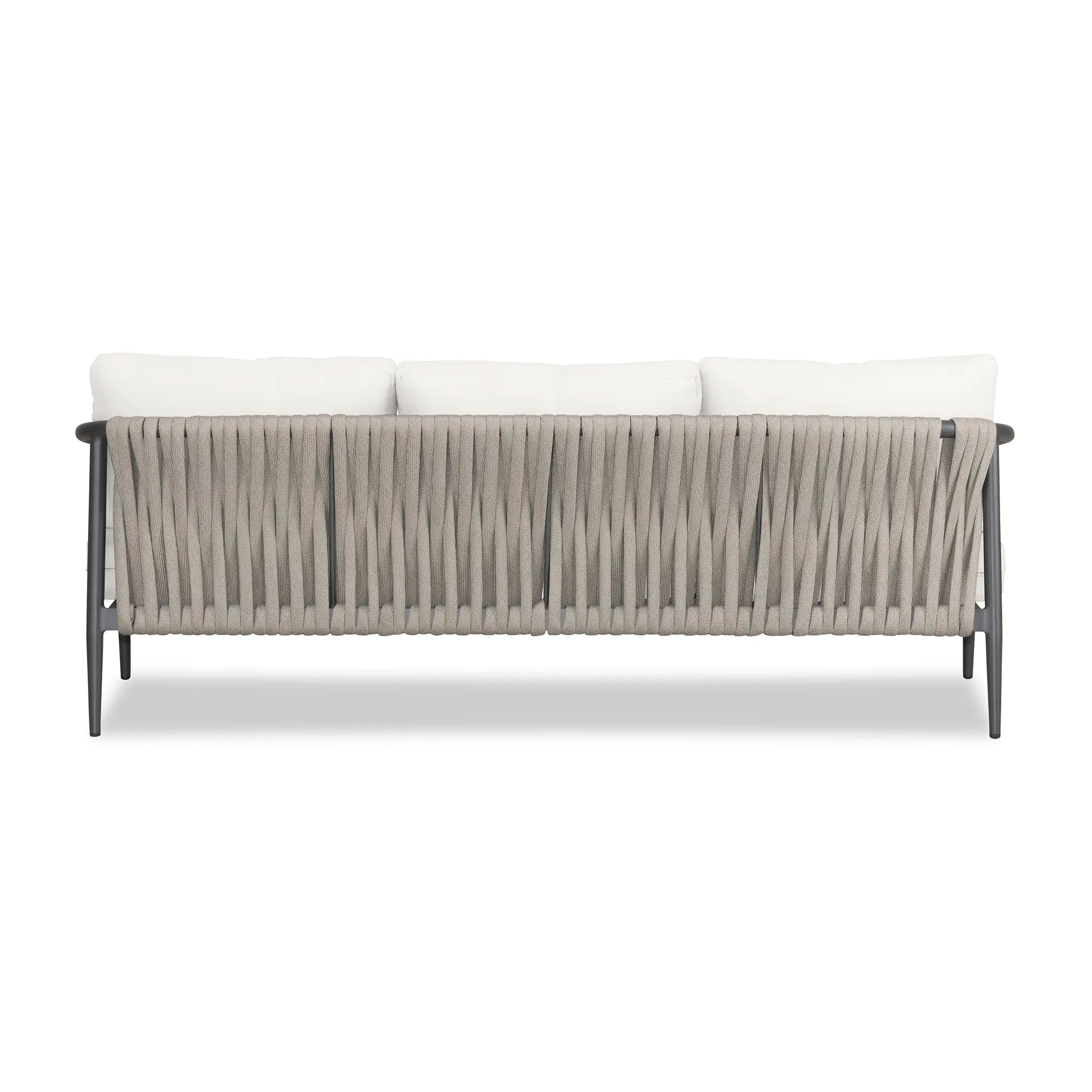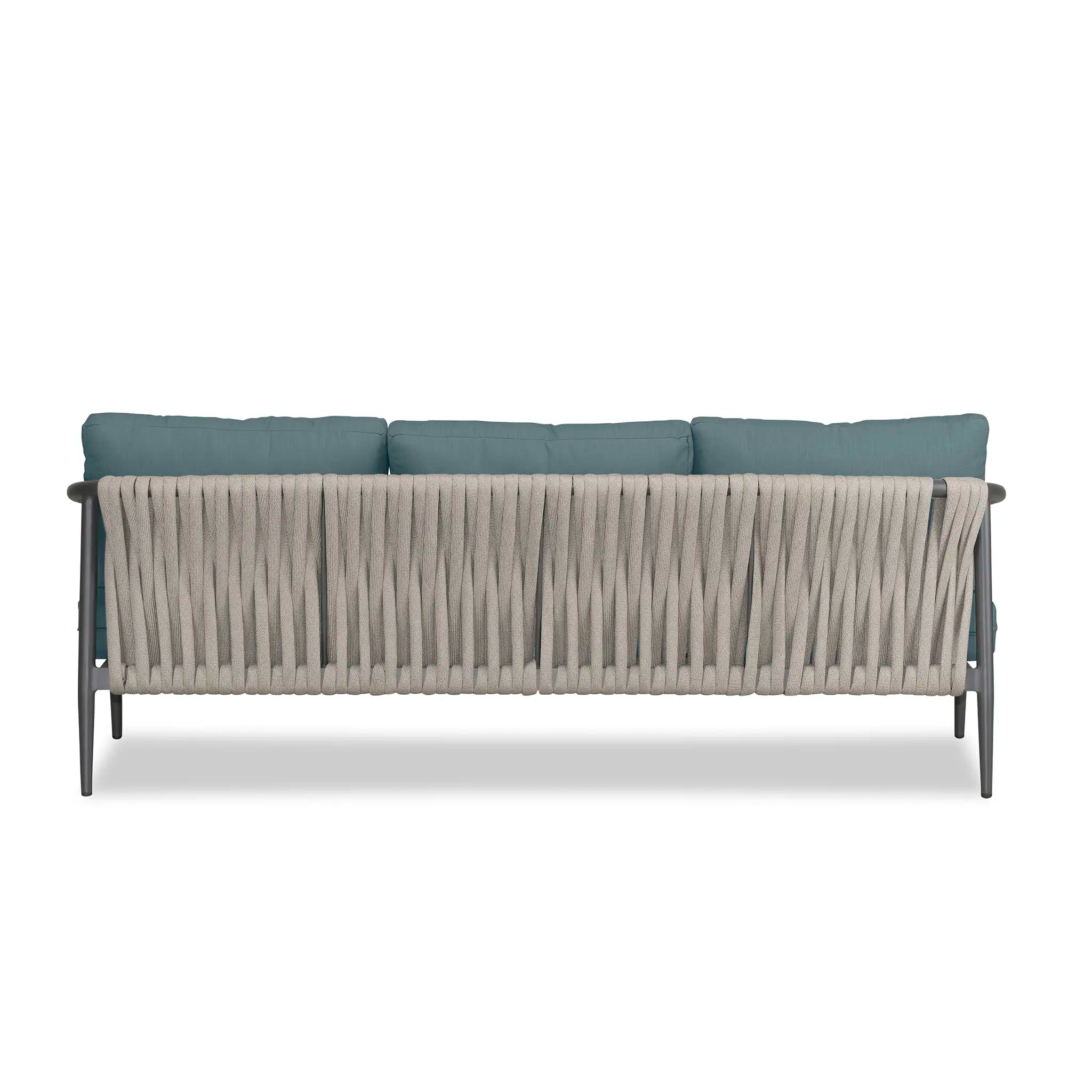 With a mixture of elegant materials, the Harmonia Living Olio Aluminum Sofa - Slate/Pebble Gray is a Mid-Century Modern design brought to life with Olefin rope. Accented with tapered legs, subtle curves, and an intertwining roped back, the sophisticated silhouette of the Olio collection is a true work of art. Designed with efficiency in mind, it features a compact footprint while still offering full-sized deep seating comfort.