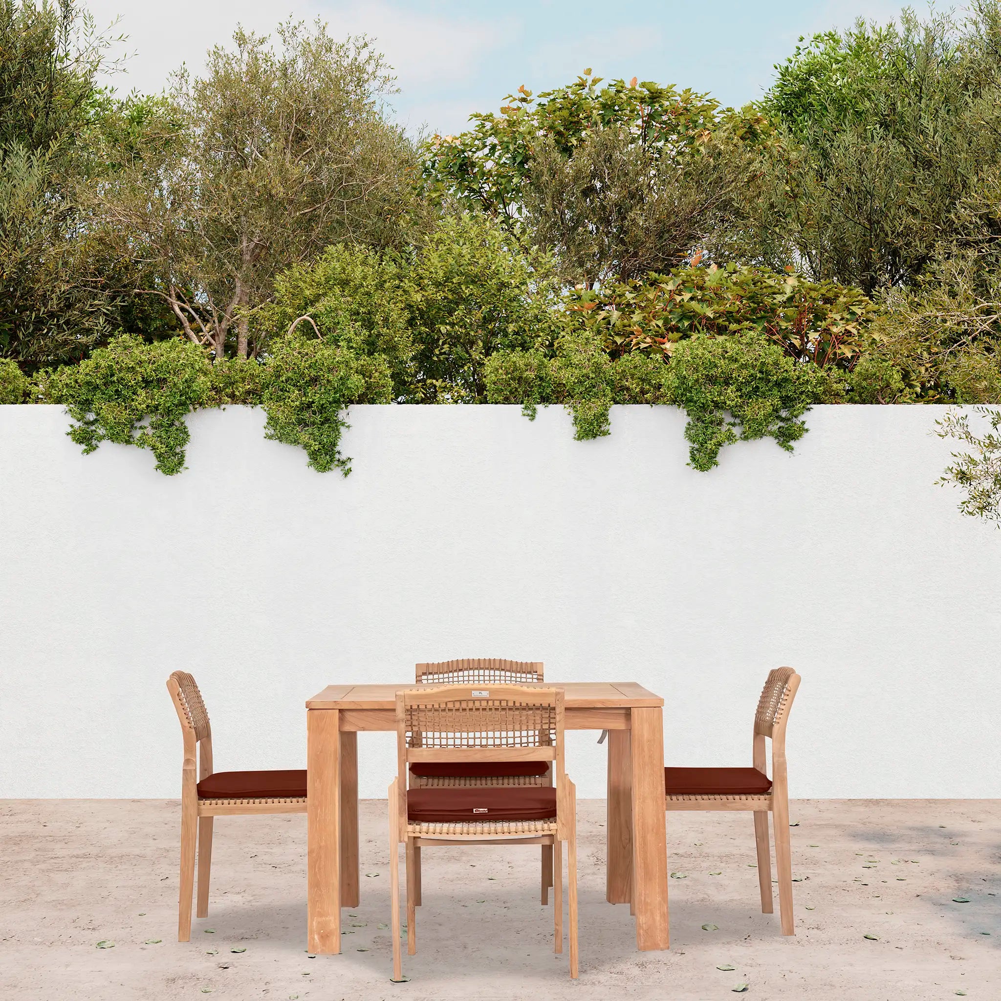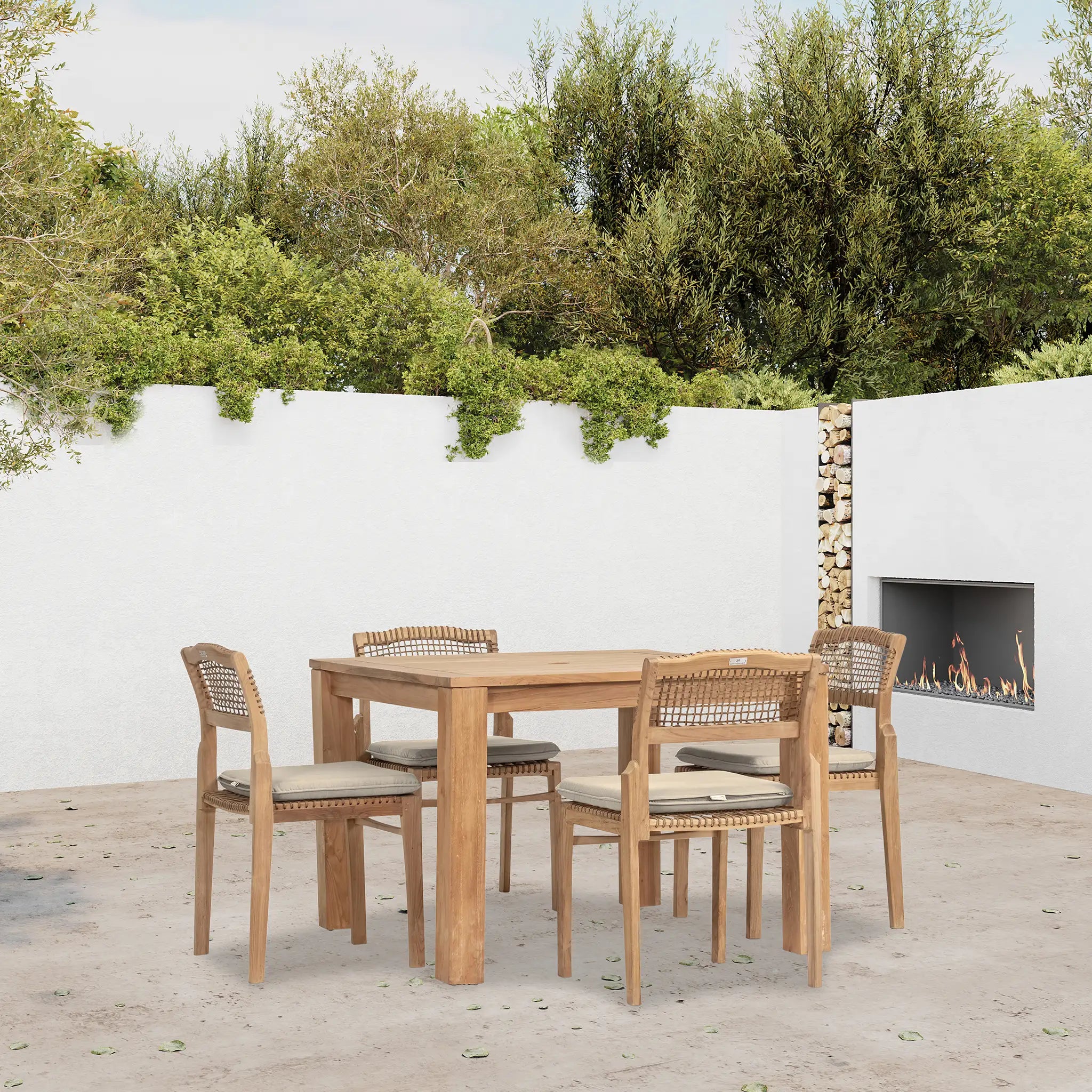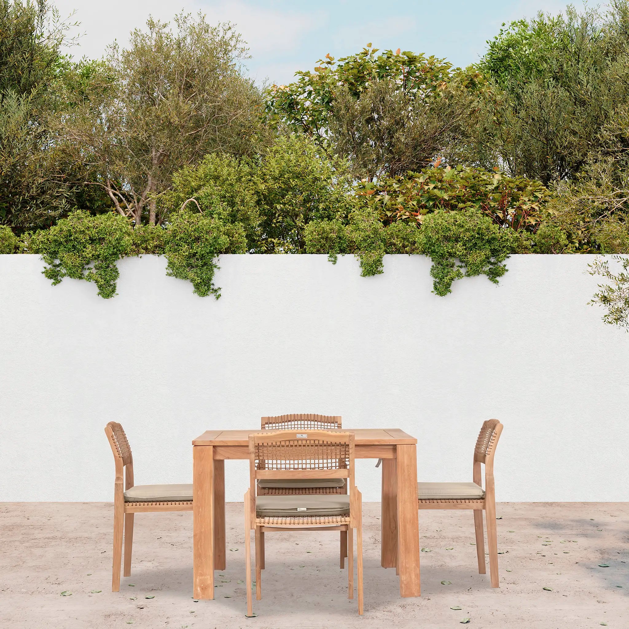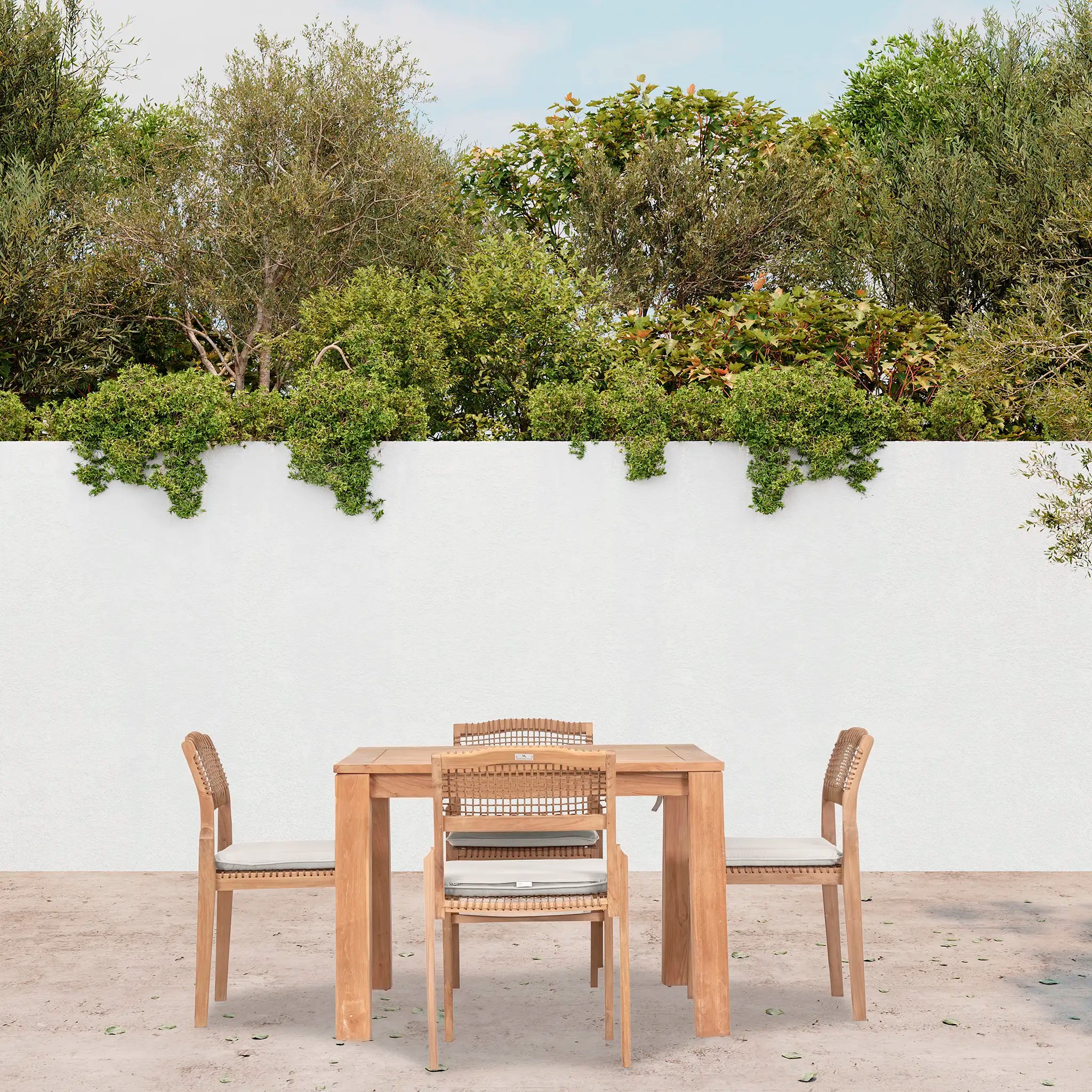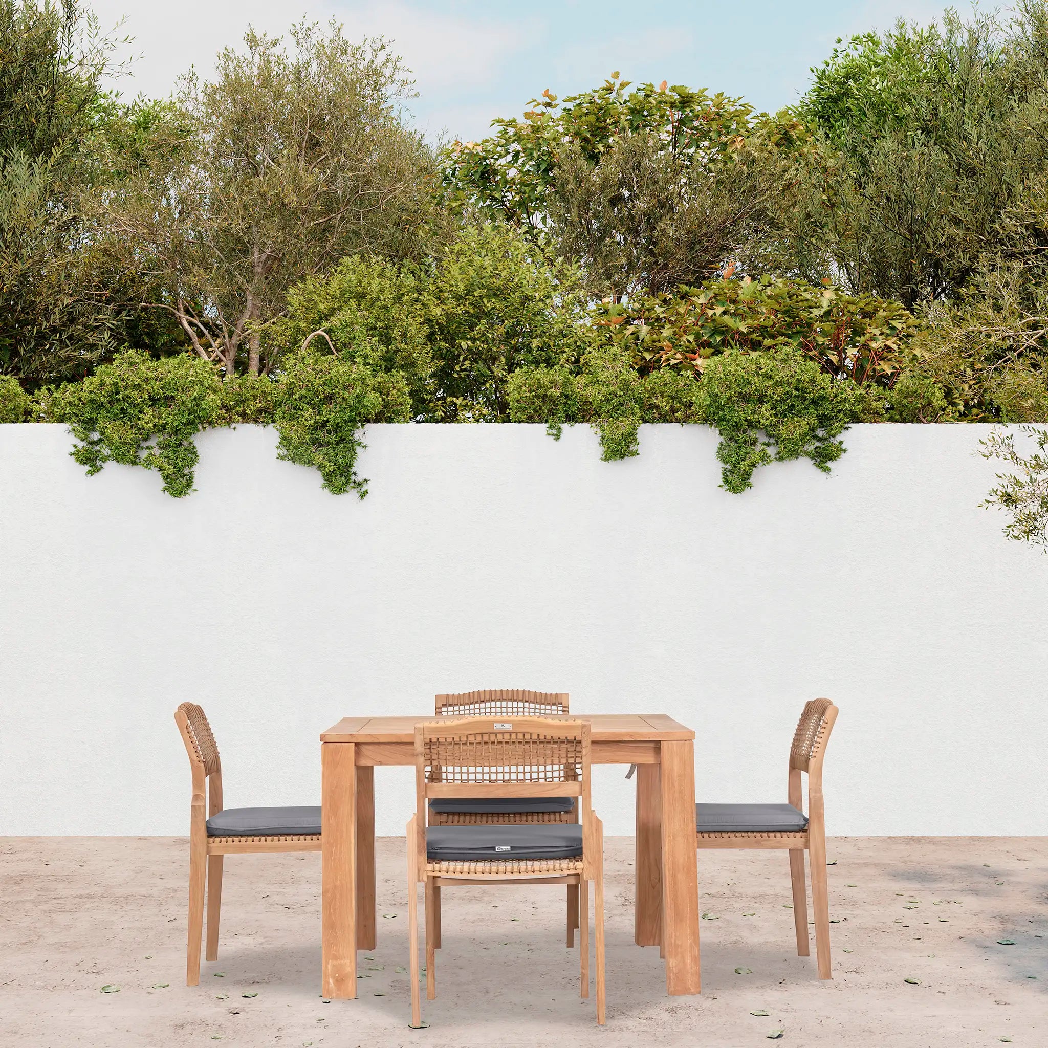 The Harmonia Living Sands 5 Piece Dining Set is a stunning fusion of mixed materials and architectural accents, offering a refined yet practical addition to any outdoor dining space. Designed with both style and durability in mind, this thoughtfully crafted set seamlessly blends the warmth of Grade A teak wood with the contemporary charm of handwoven HDPE wicker. Whether enhancing a cozy backyard retreat or an upscale commercial patio, the Sands collection delivers long-lasting beauty and functionality in a range of climates and environments.