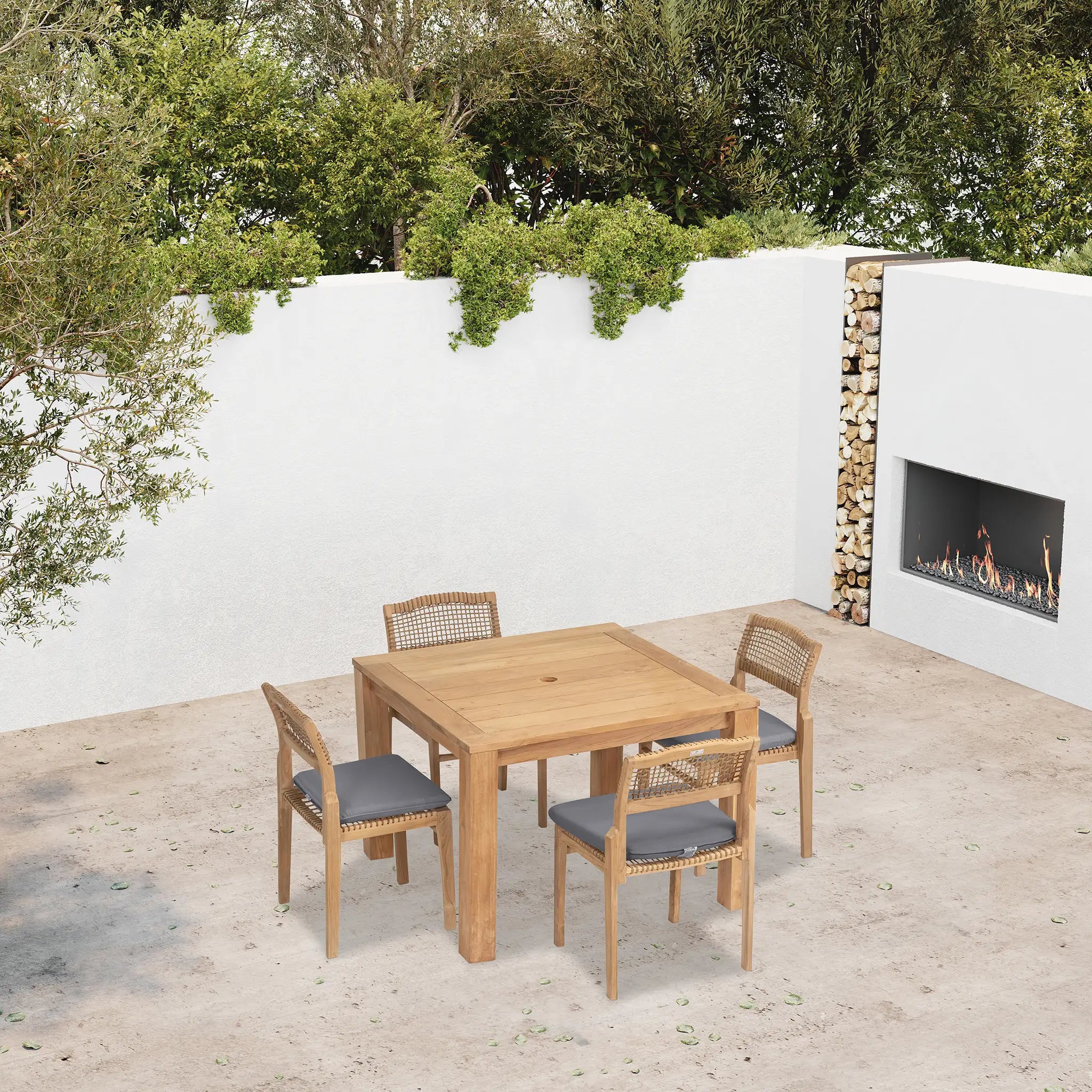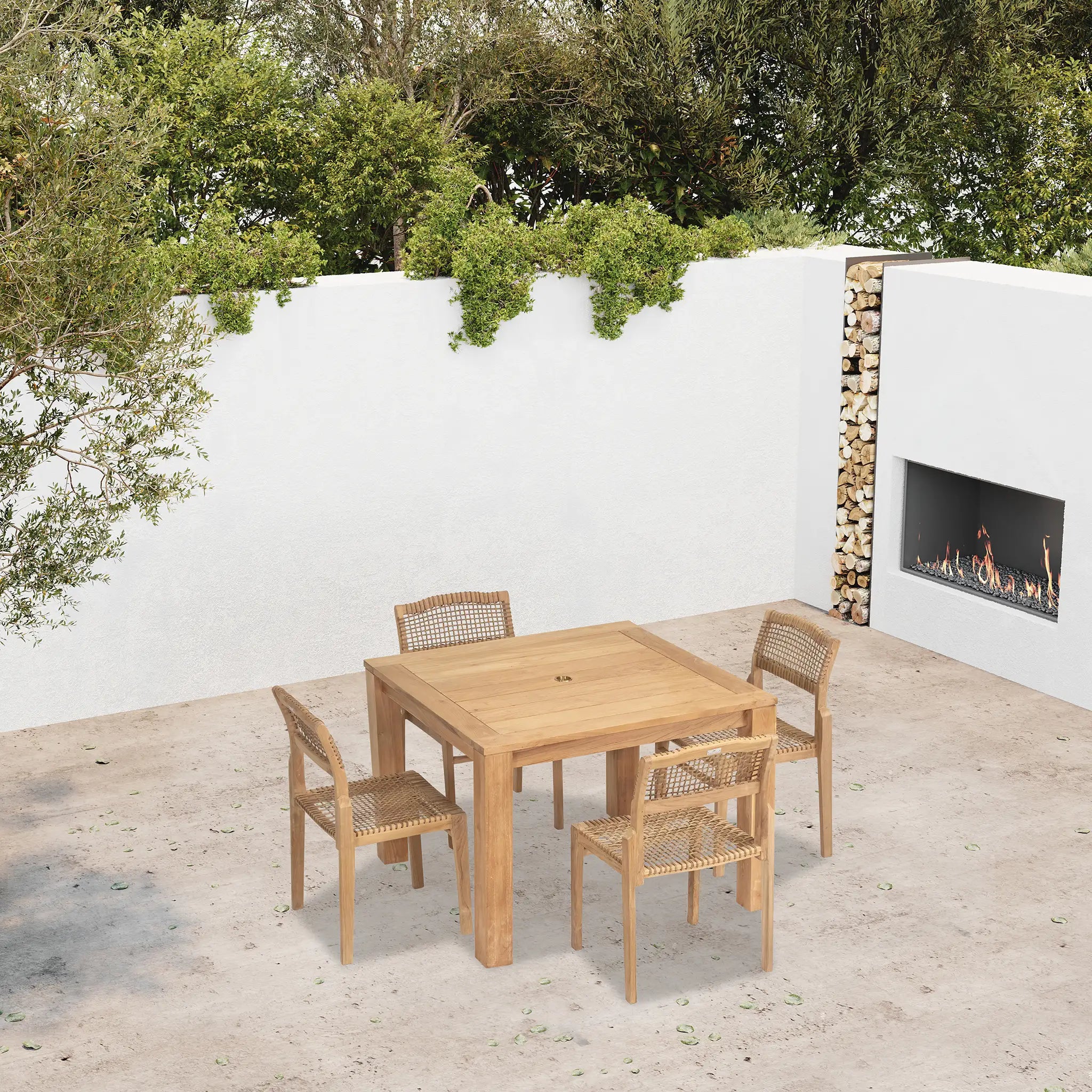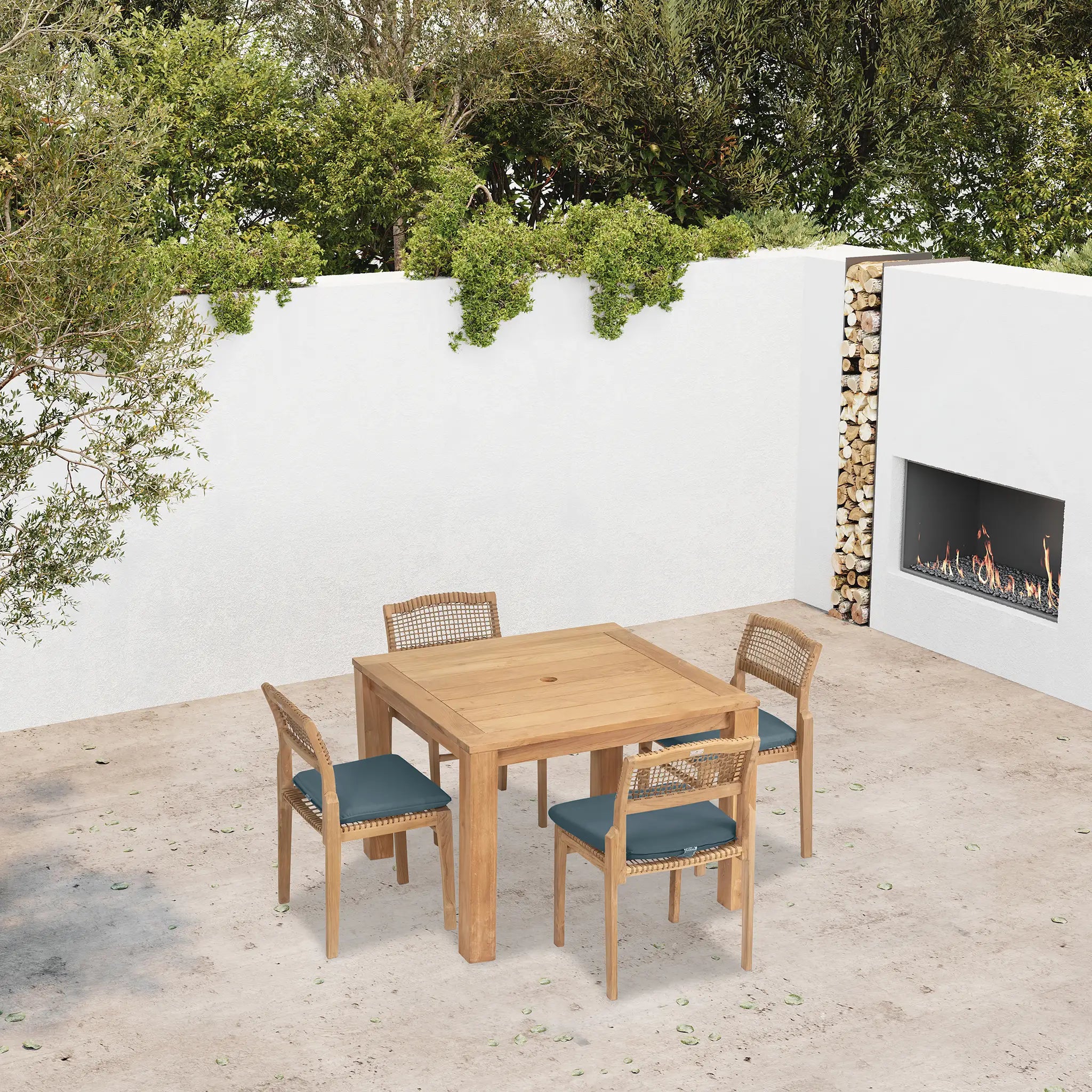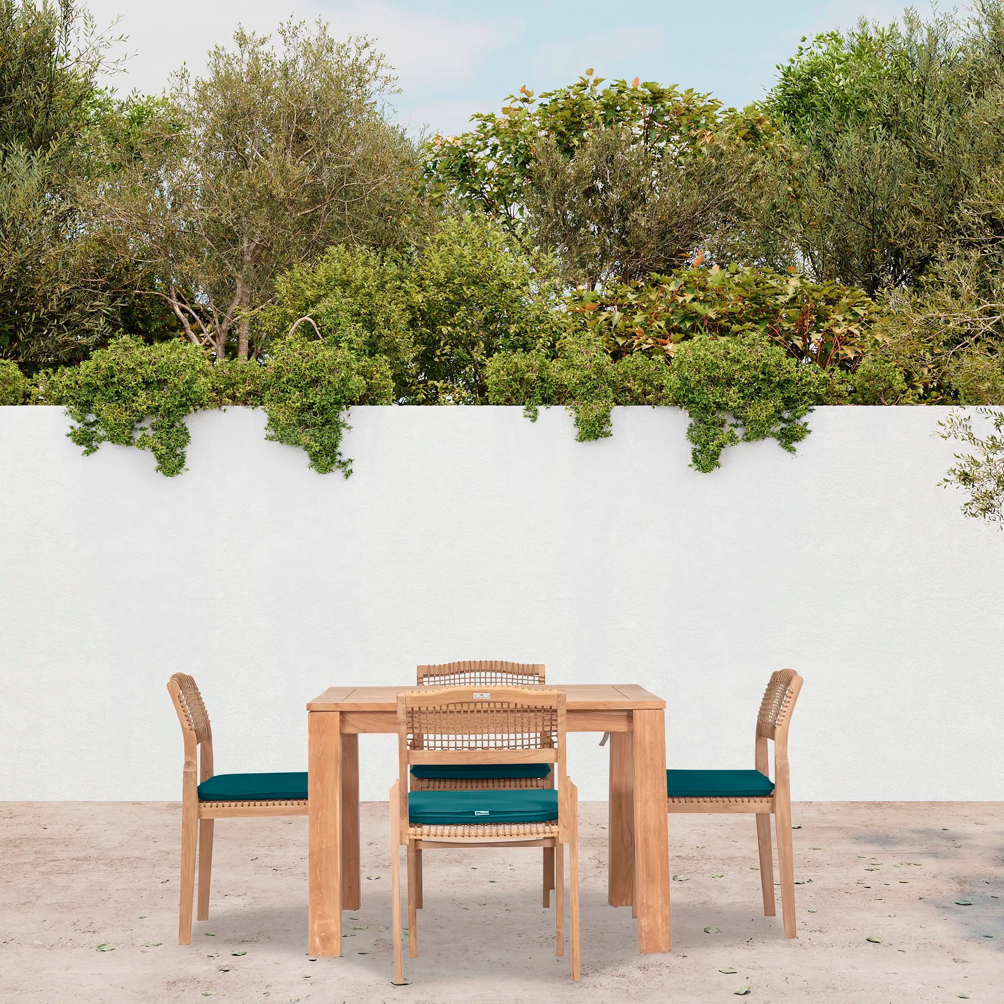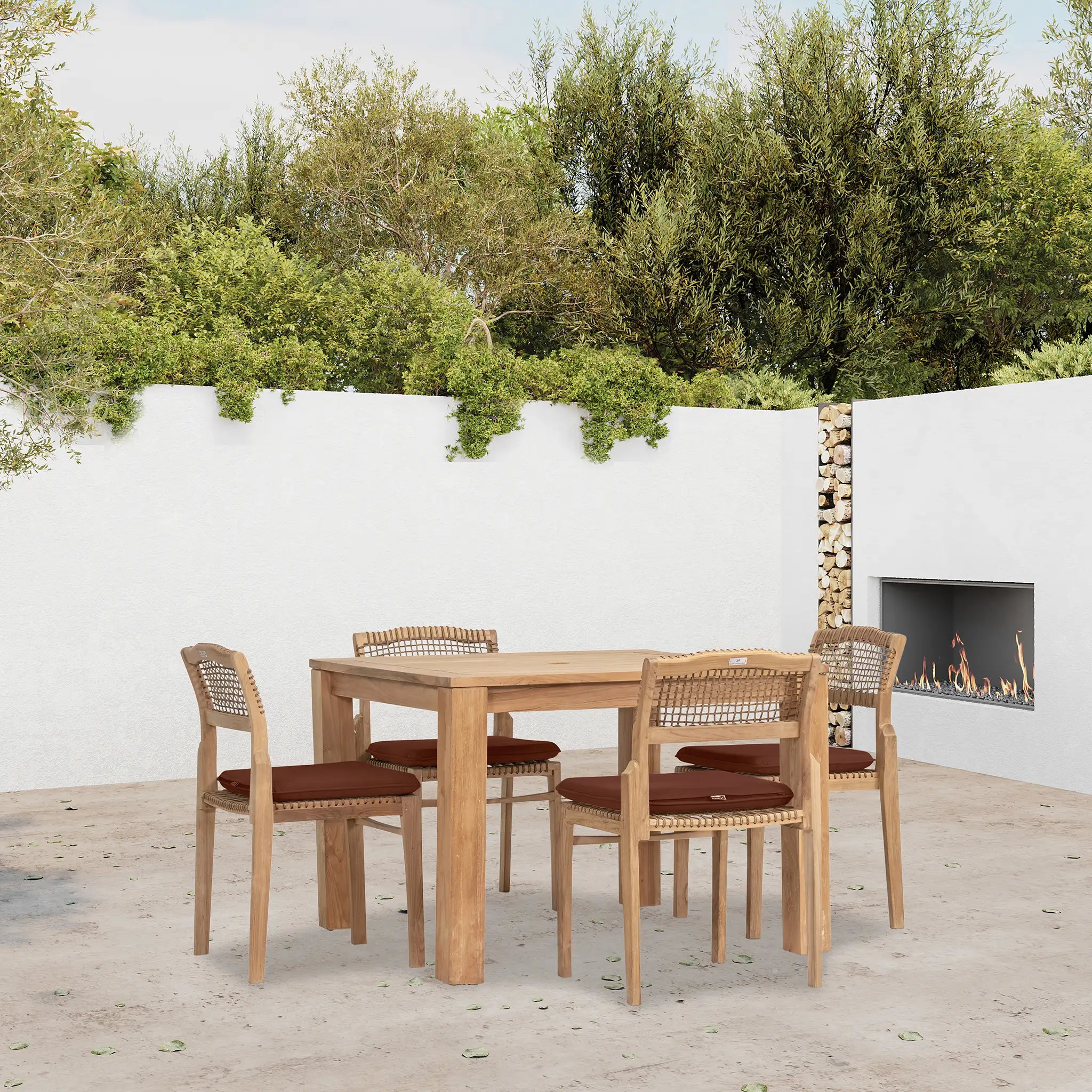 The Harmonia Living Sands 5 Piece Dining Set is a stunning fusion of mixed materials and architectural accents, offering a refined yet practical addition to any outdoor dining space. Designed with both style and durability in mind, this thoughtfully crafted set seamlessly blends the warmth of Grade A teak wood with the contemporary charm of handwoven HDPE wicker. Whether enhancing a cozy backyard retreat or an upscale commercial patio, the Sands collection delivers long-lasting beauty and functionality in a range of climates and environments.
