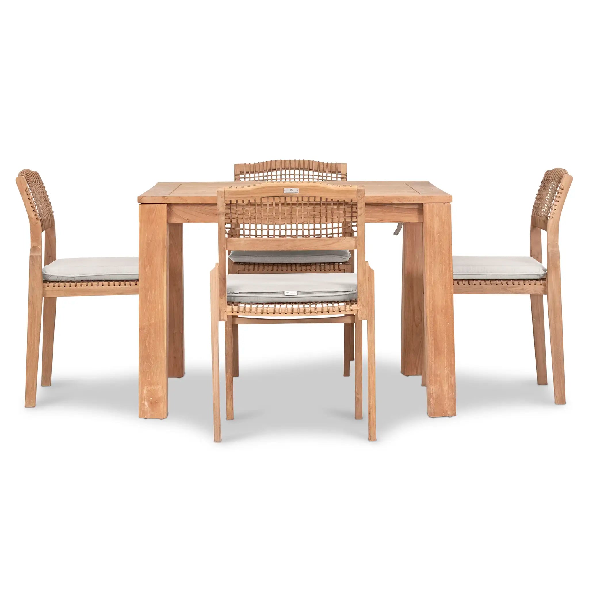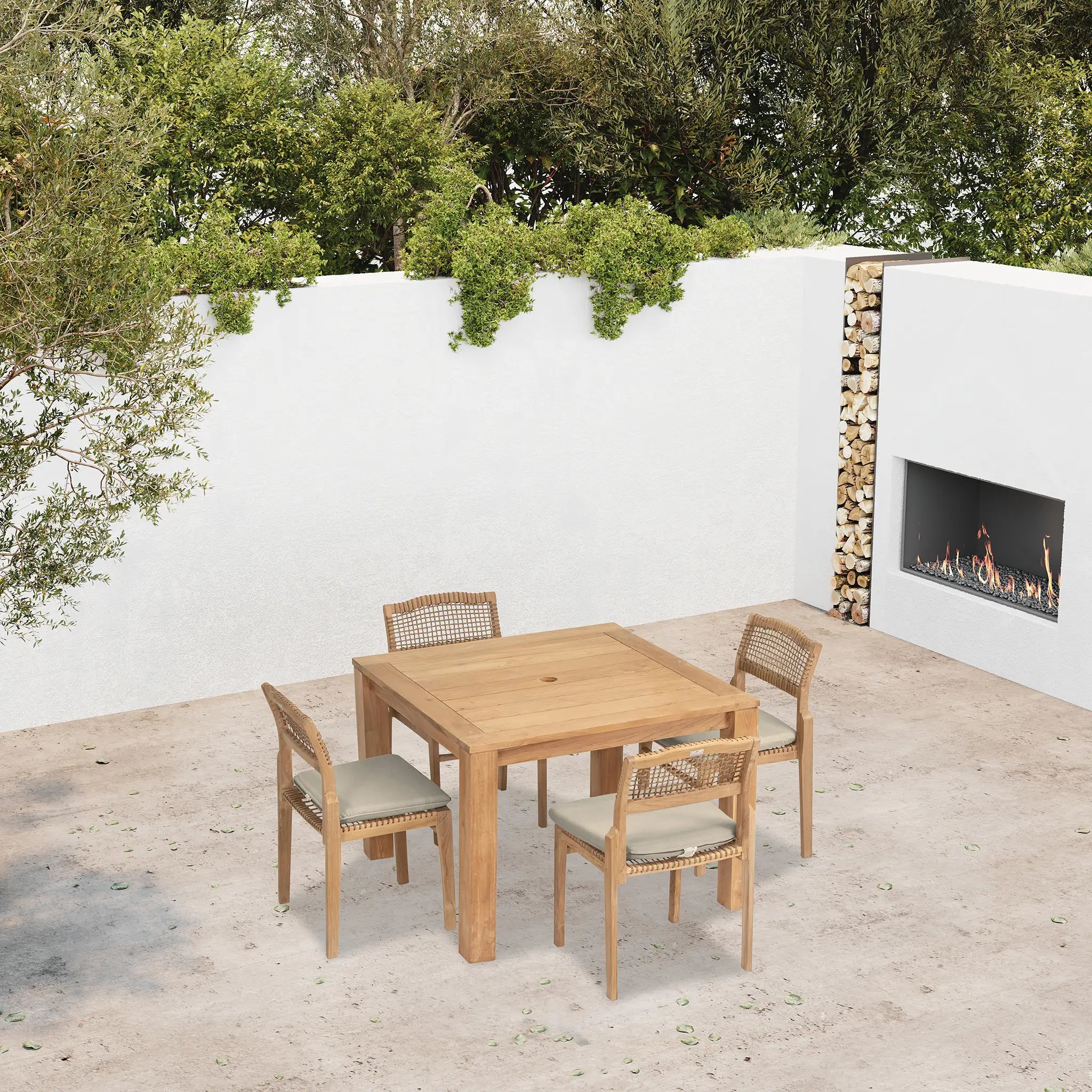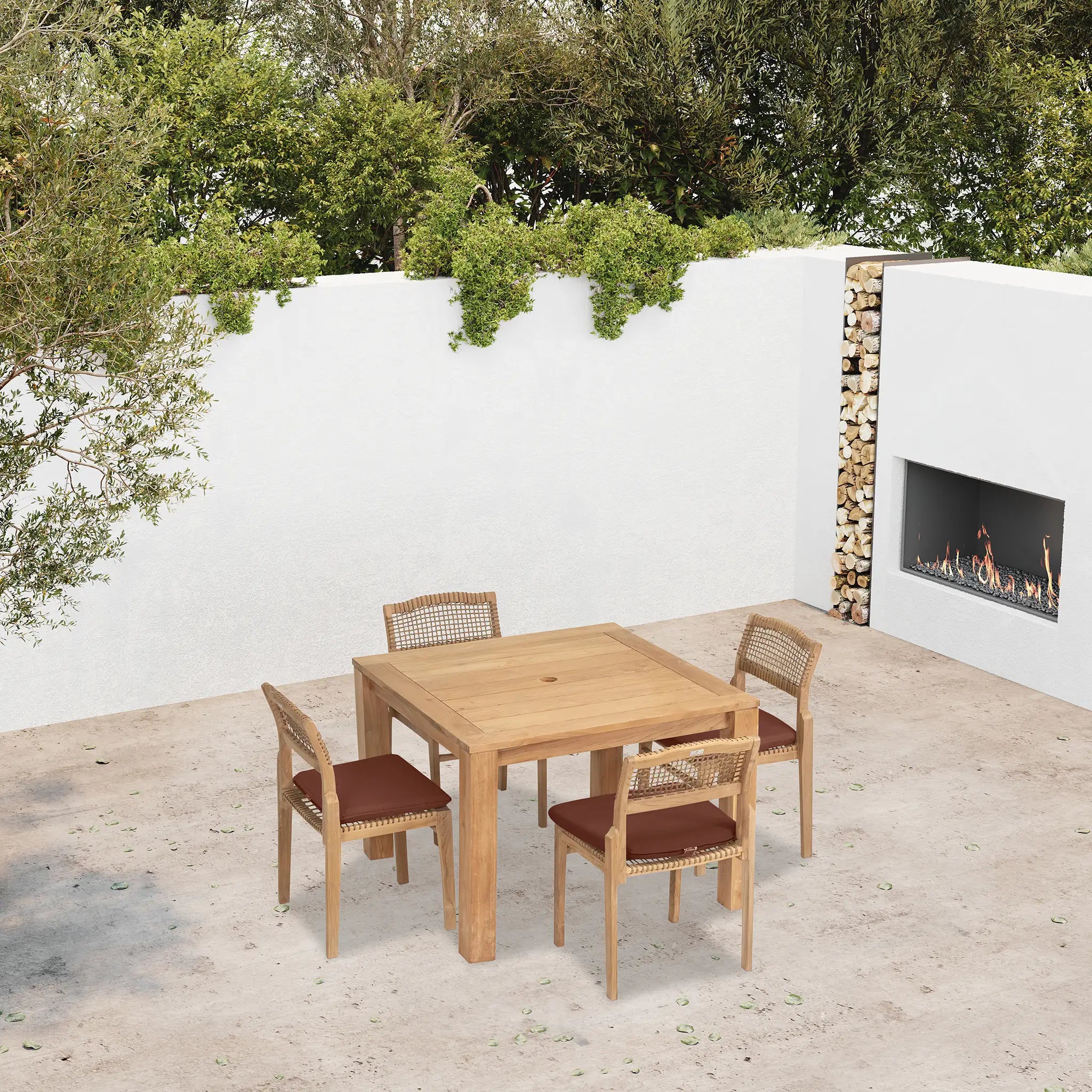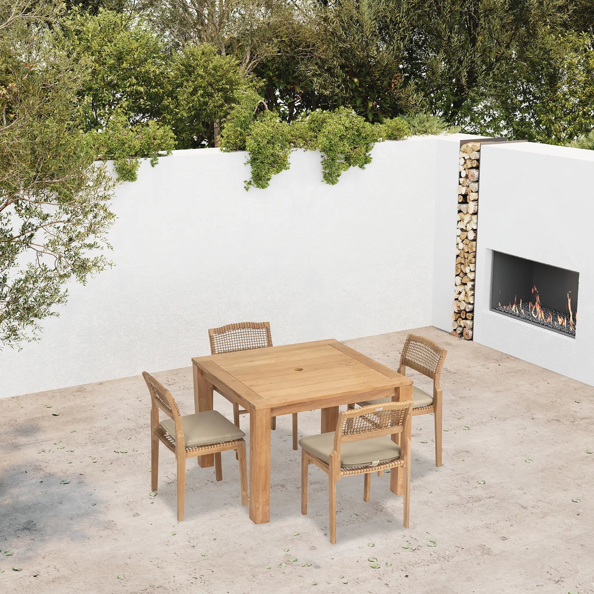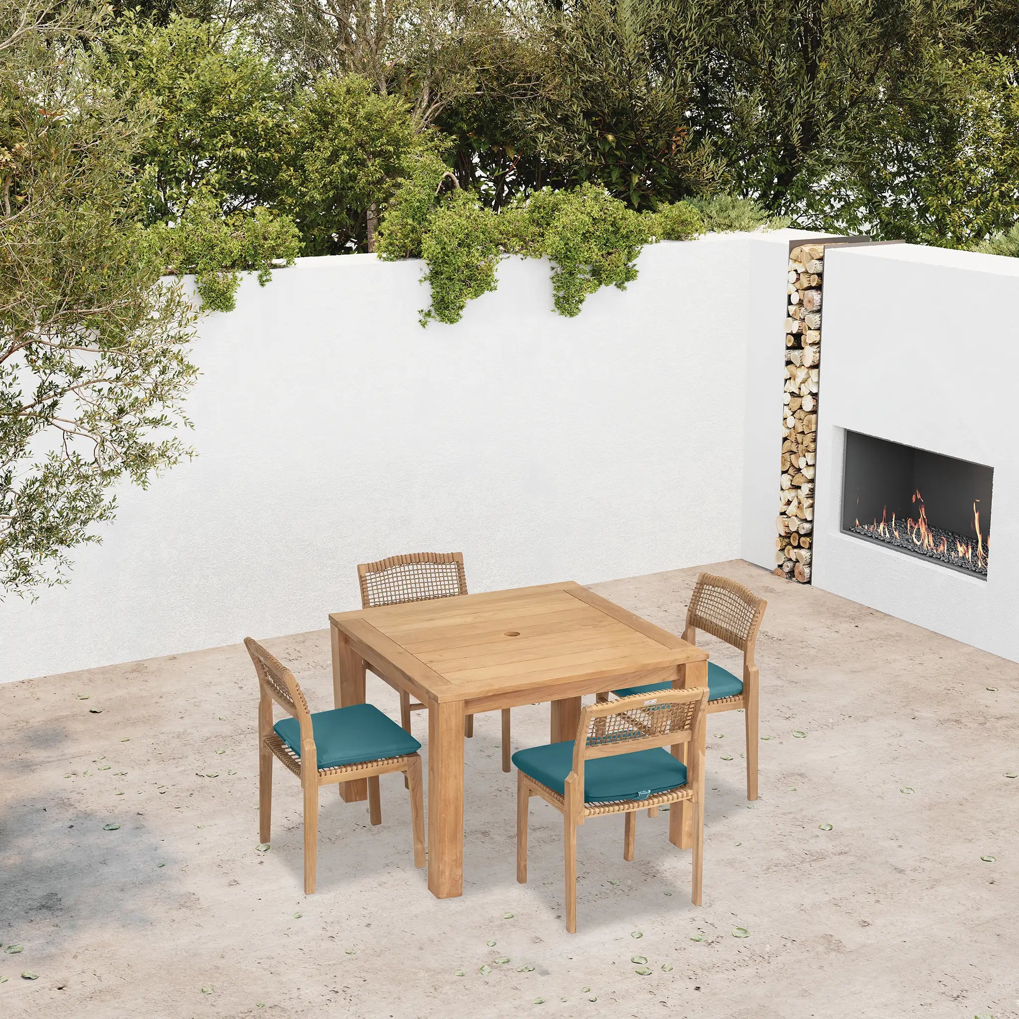 The Harmonia Living Sands 5 Piece Dining Set is a stunning fusion of mixed materials and architectural accents, offering a refined yet practical addition to any outdoor dining space. Designed with both style and durability in mind, this thoughtfully crafted set seamlessly blends the warmth of Grade A teak wood with the contemporary charm of handwoven HDPE wicker. Whether enhancing a cozy backyard retreat or an upscale commercial patio, the Sands collection delivers long-lasting beauty and functionality in a range of climates and environments.