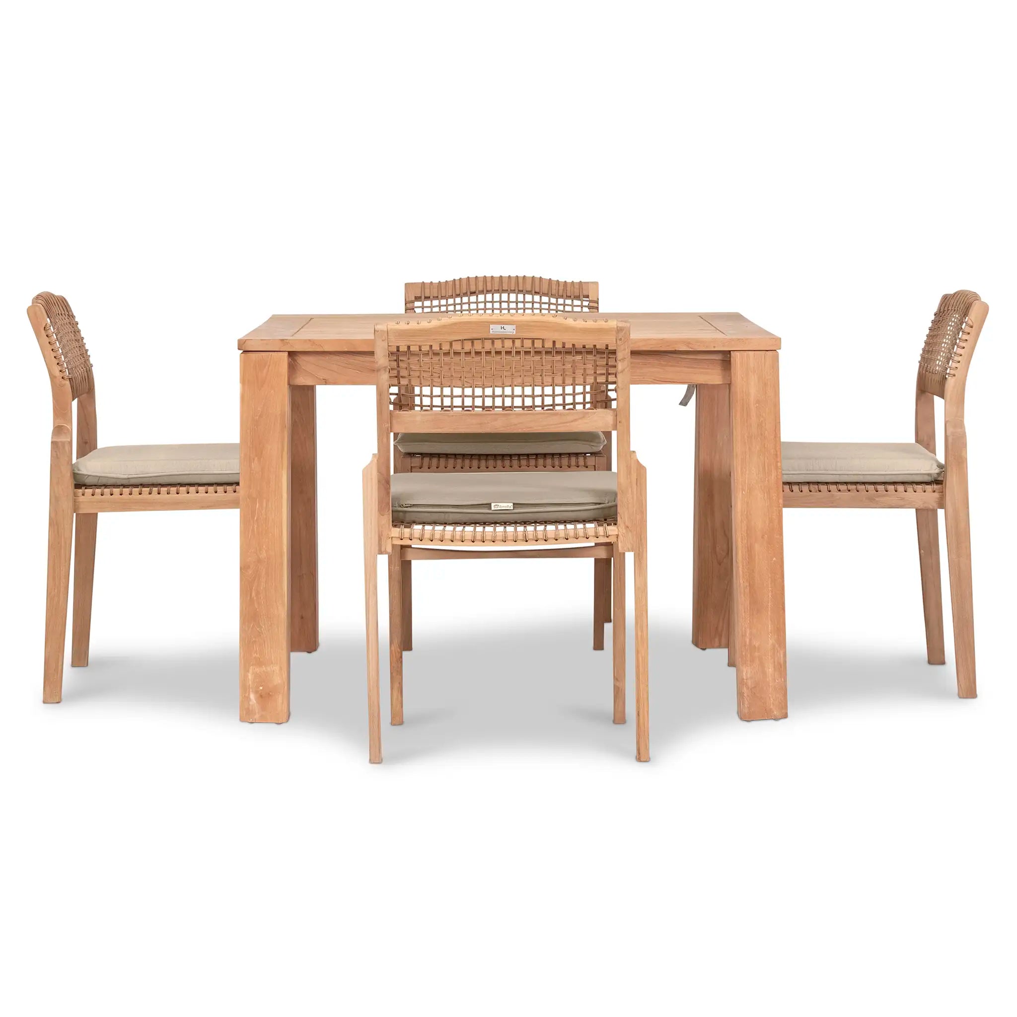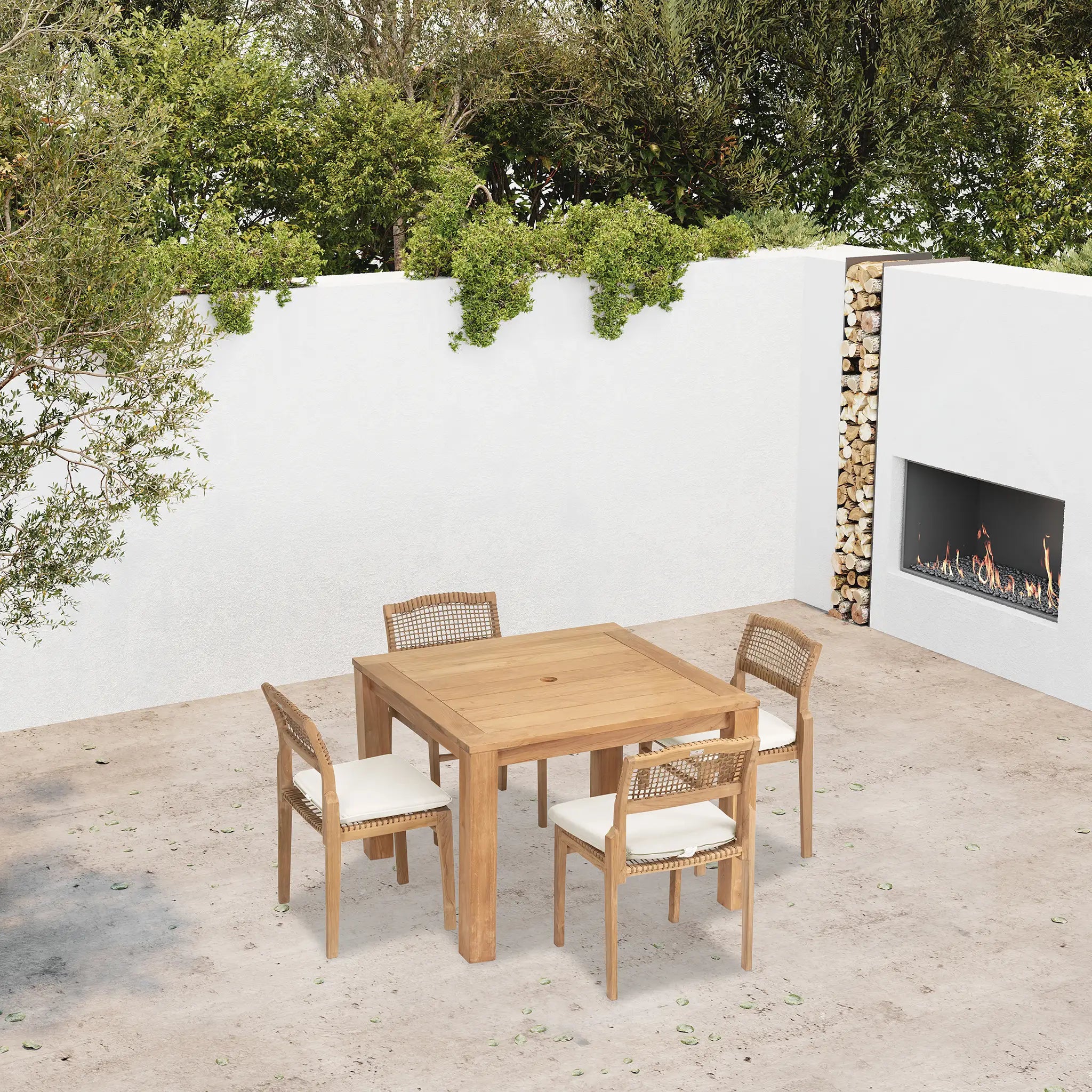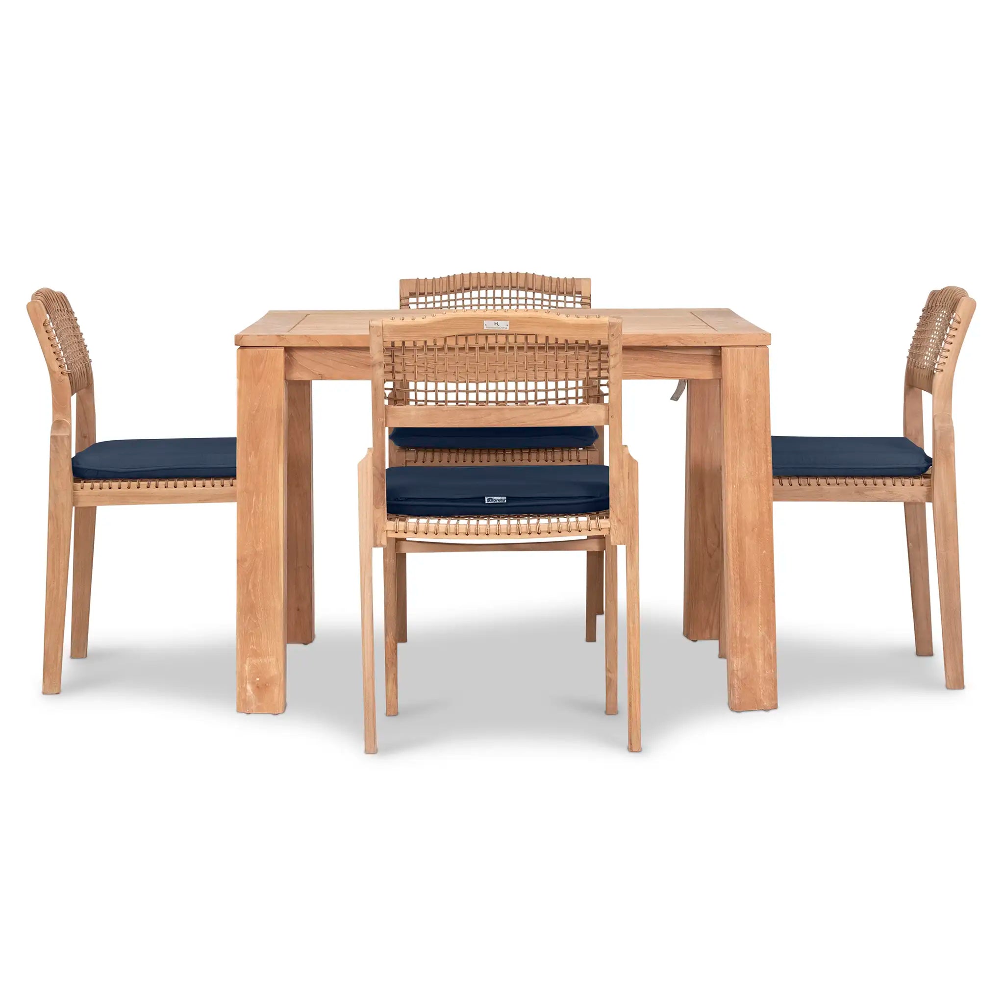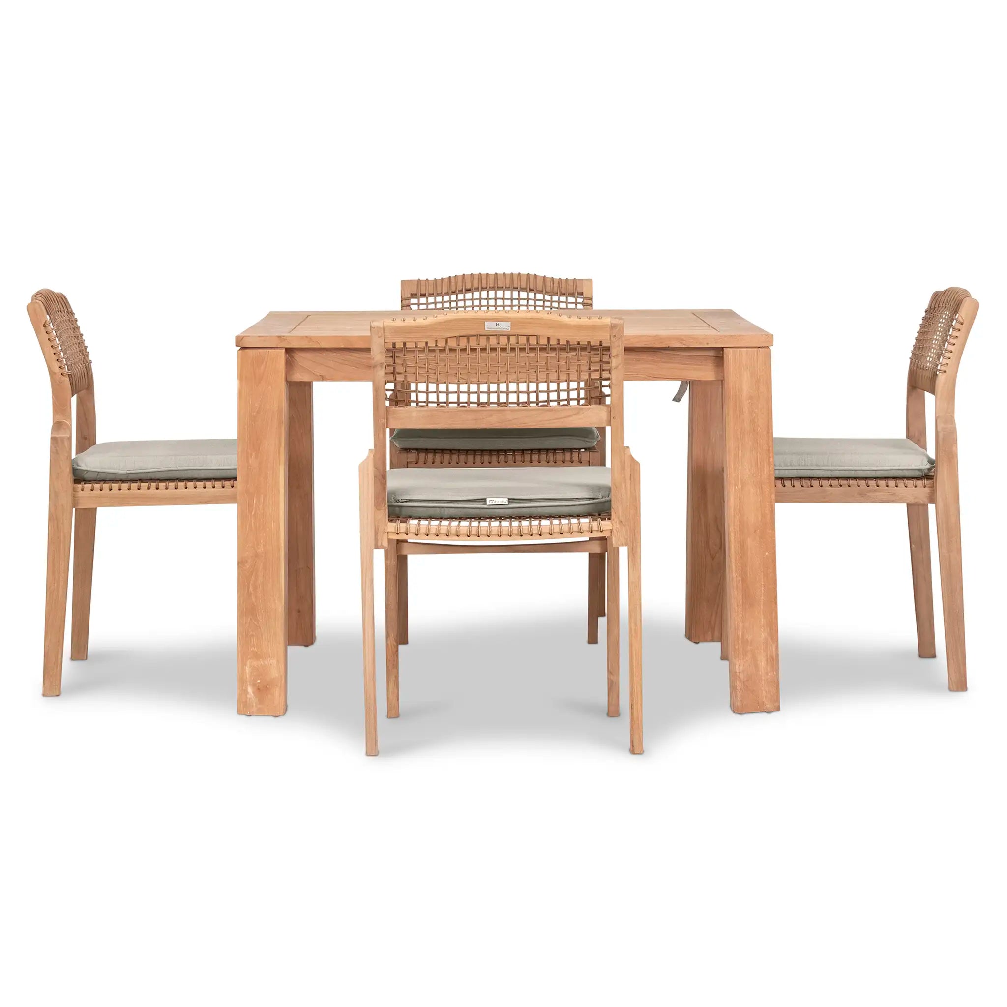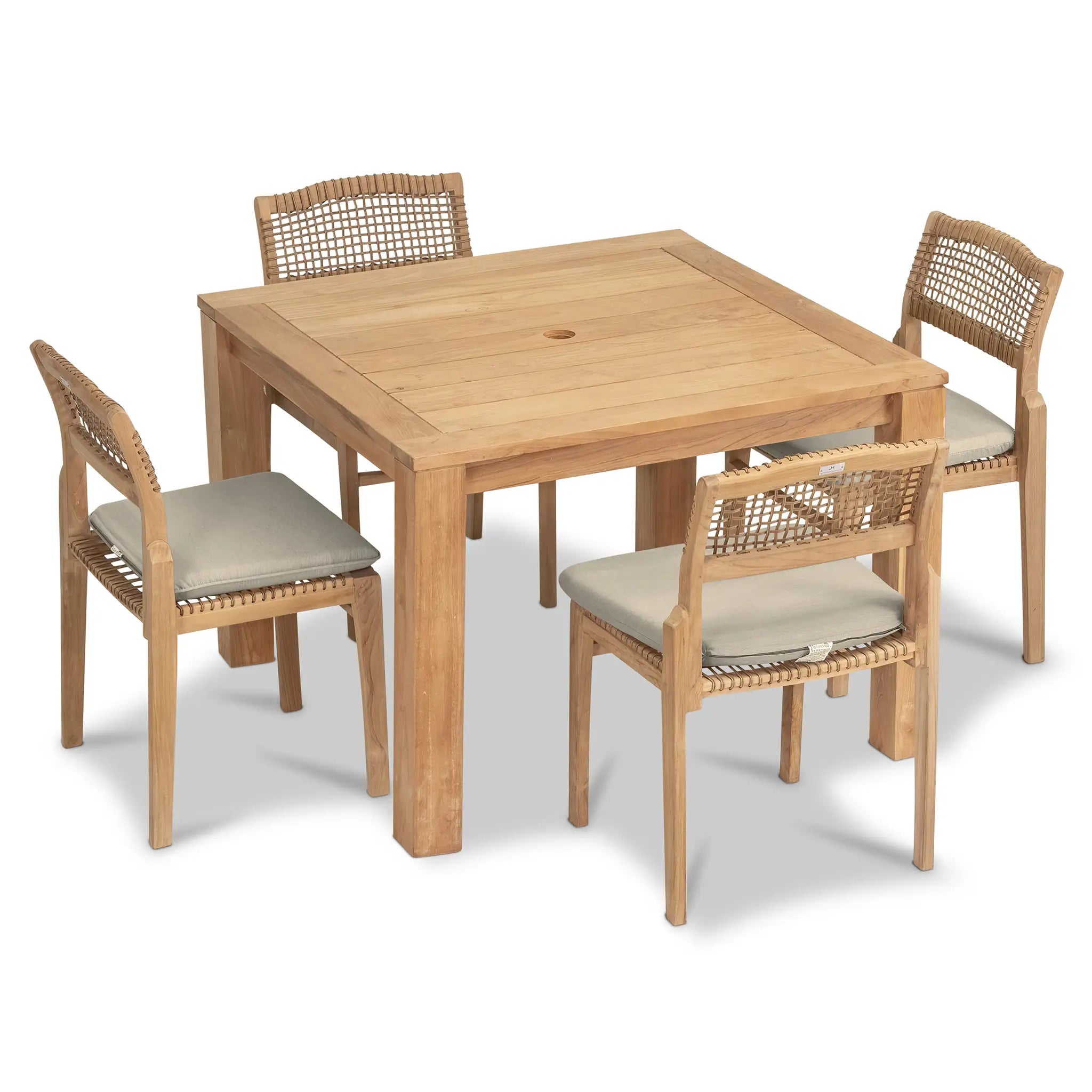 The Harmonia Living Sands 5 Piece Dining Set is a stunning fusion of mixed materials and architectural accents, offering a refined yet practical addition to any outdoor dining space. Designed with both style and durability in mind, this thoughtfully crafted set seamlessly blends the warmth of Grade A teak wood with the contemporary charm of handwoven HDPE wicker. Whether enhancing a cozy backyard retreat or an upscale commercial patio, the Sands collection delivers long-lasting beauty and functionality in a range of climates and environments.