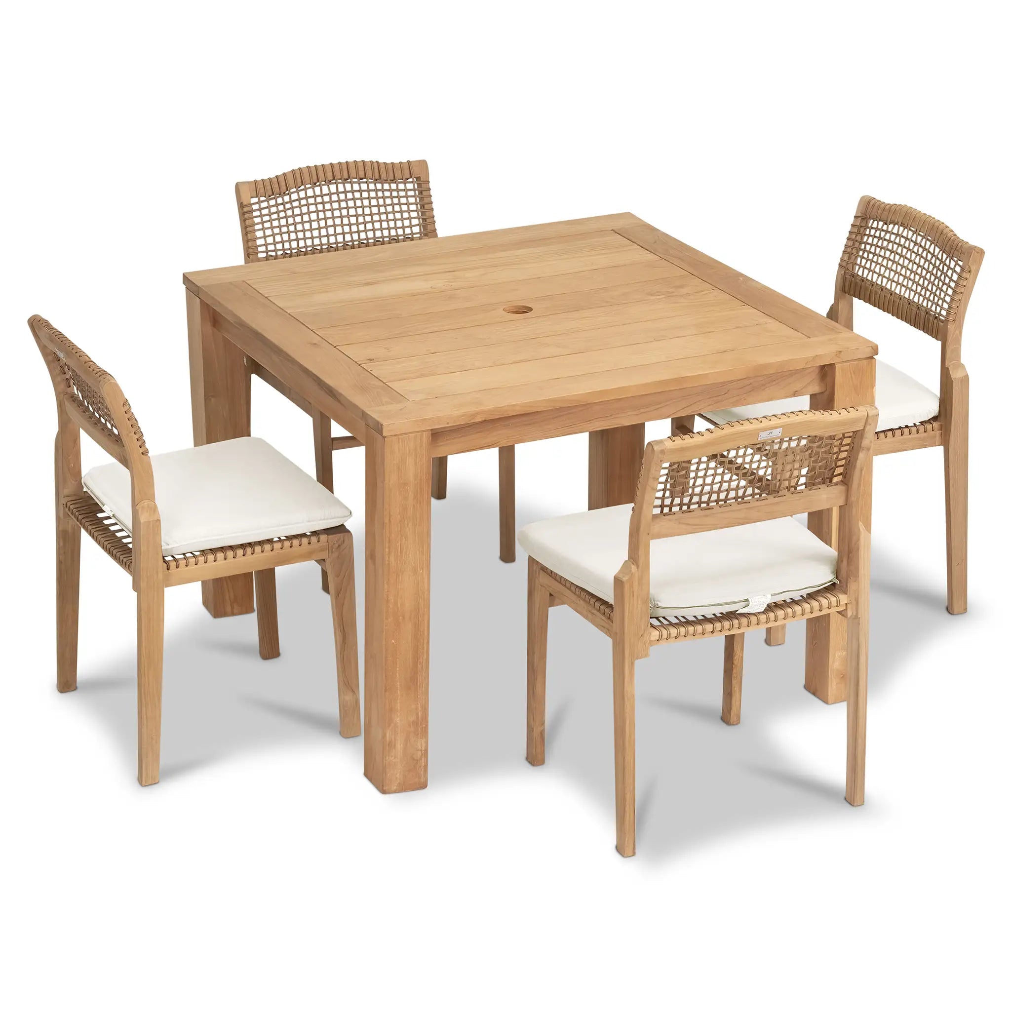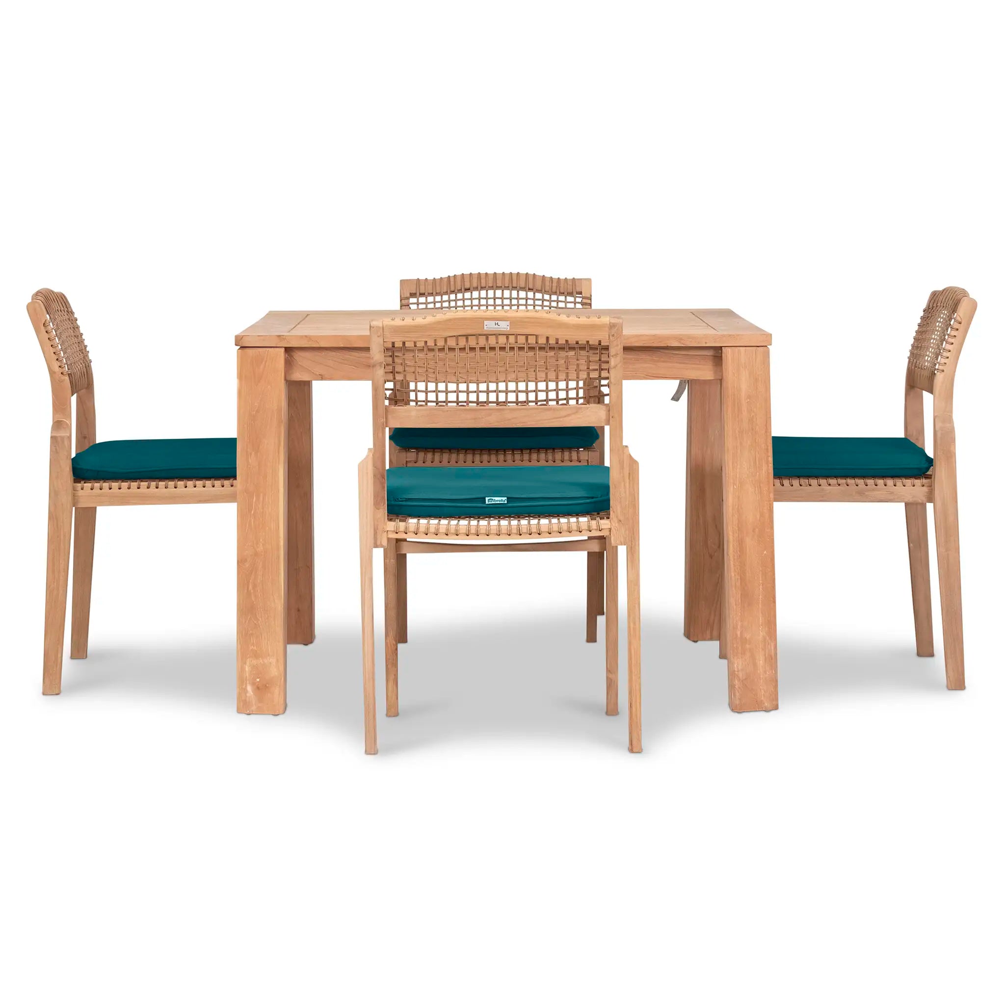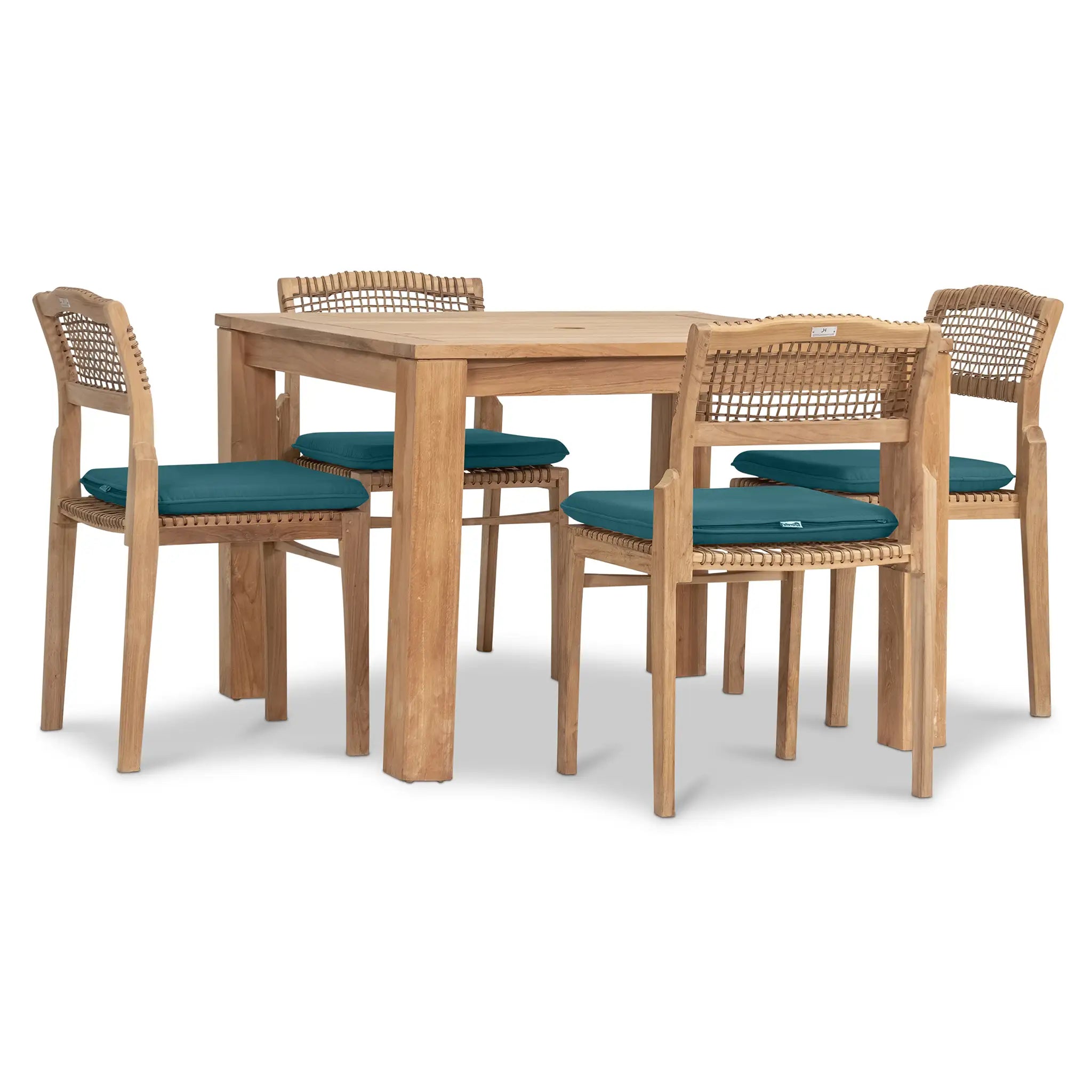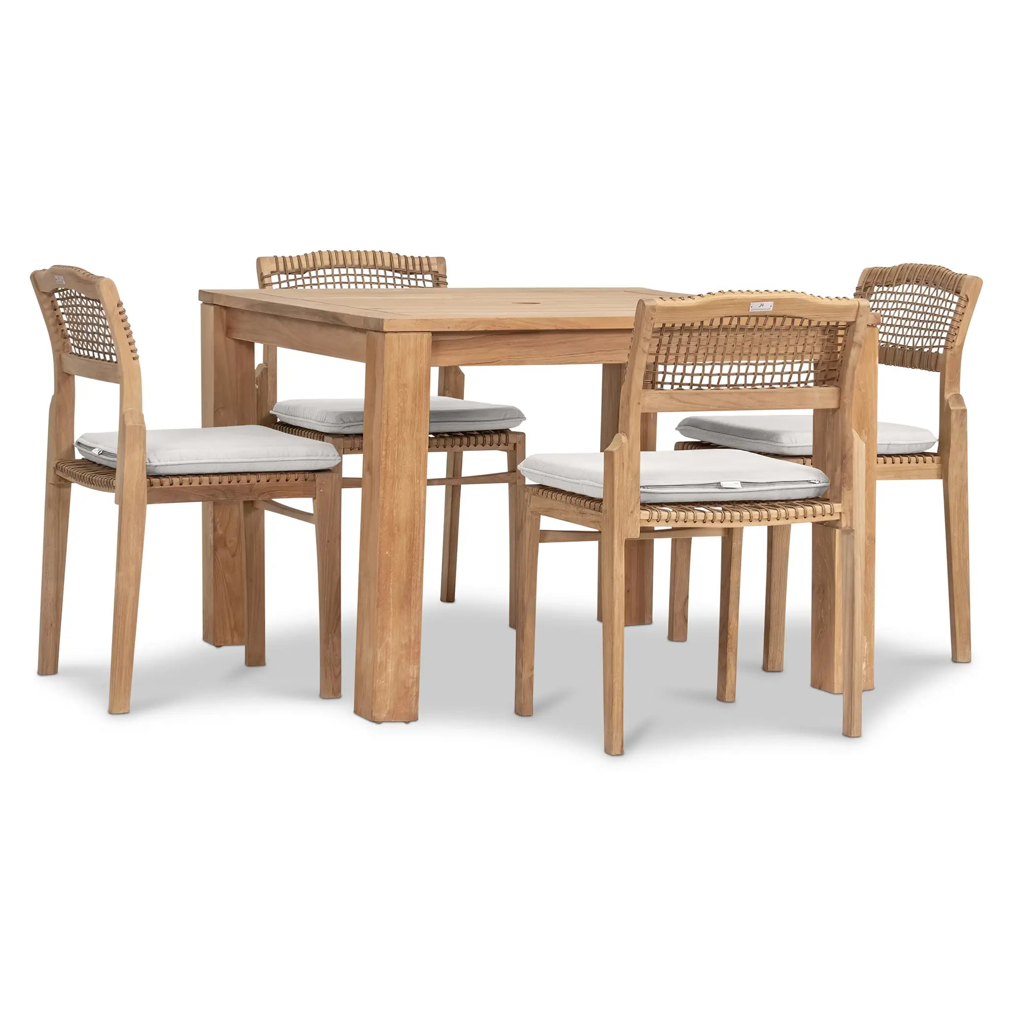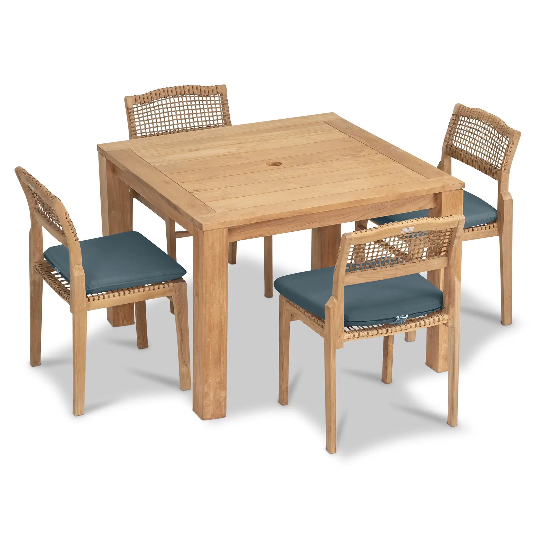 The Harmonia Living Sands 5 Piece Dining Set is a stunning fusion of mixed materials and architectural accents, offering a refined yet practical addition to any outdoor dining space. Designed with both style and durability in mind, this thoughtfully crafted set seamlessly blends the warmth of Grade A teak wood with the contemporary charm of handwoven HDPE wicker. Whether enhancing a cozy backyard retreat or an upscale commercial patio, the Sands collection delivers long-lasting beauty and functionality in a range of climates and environments.