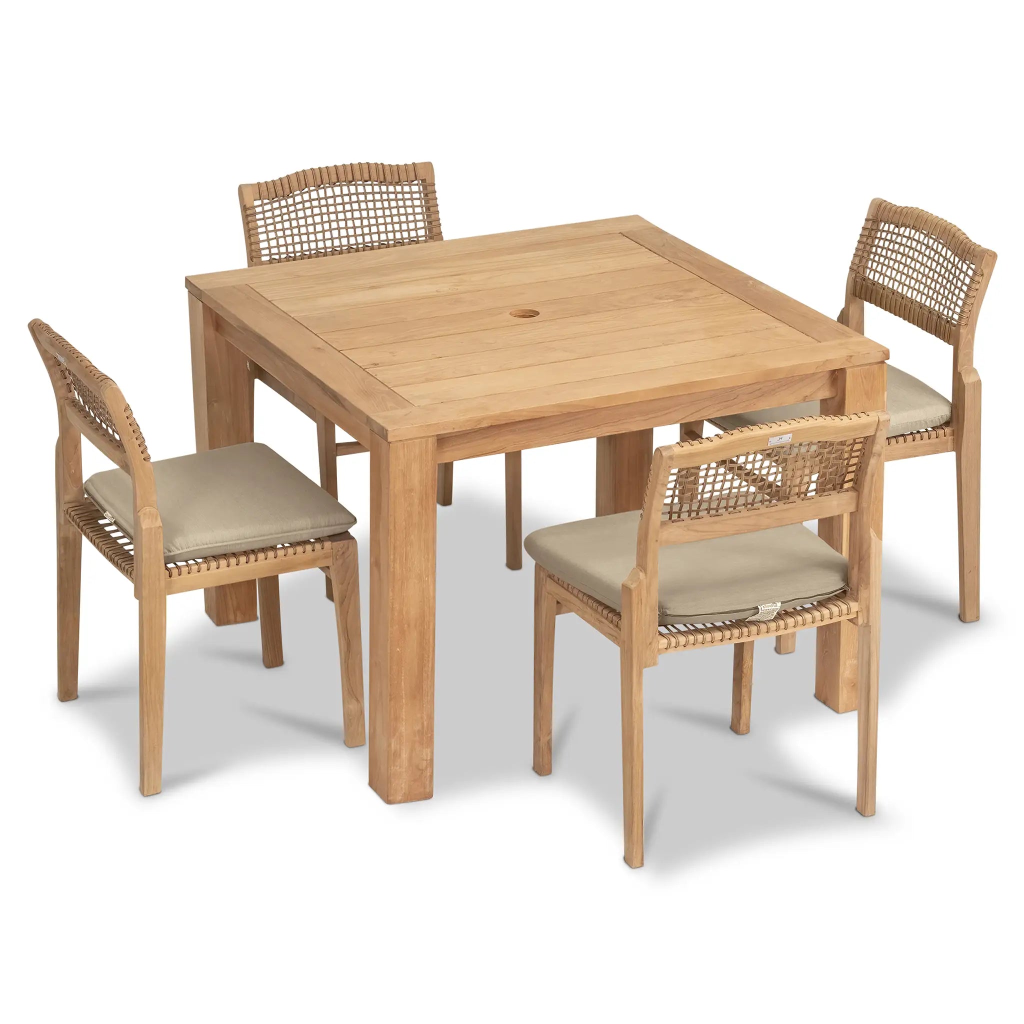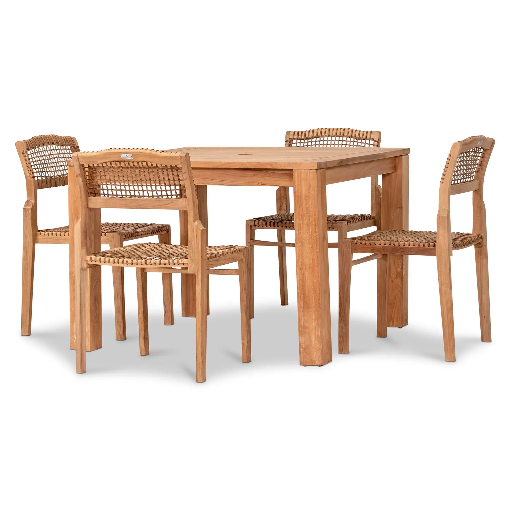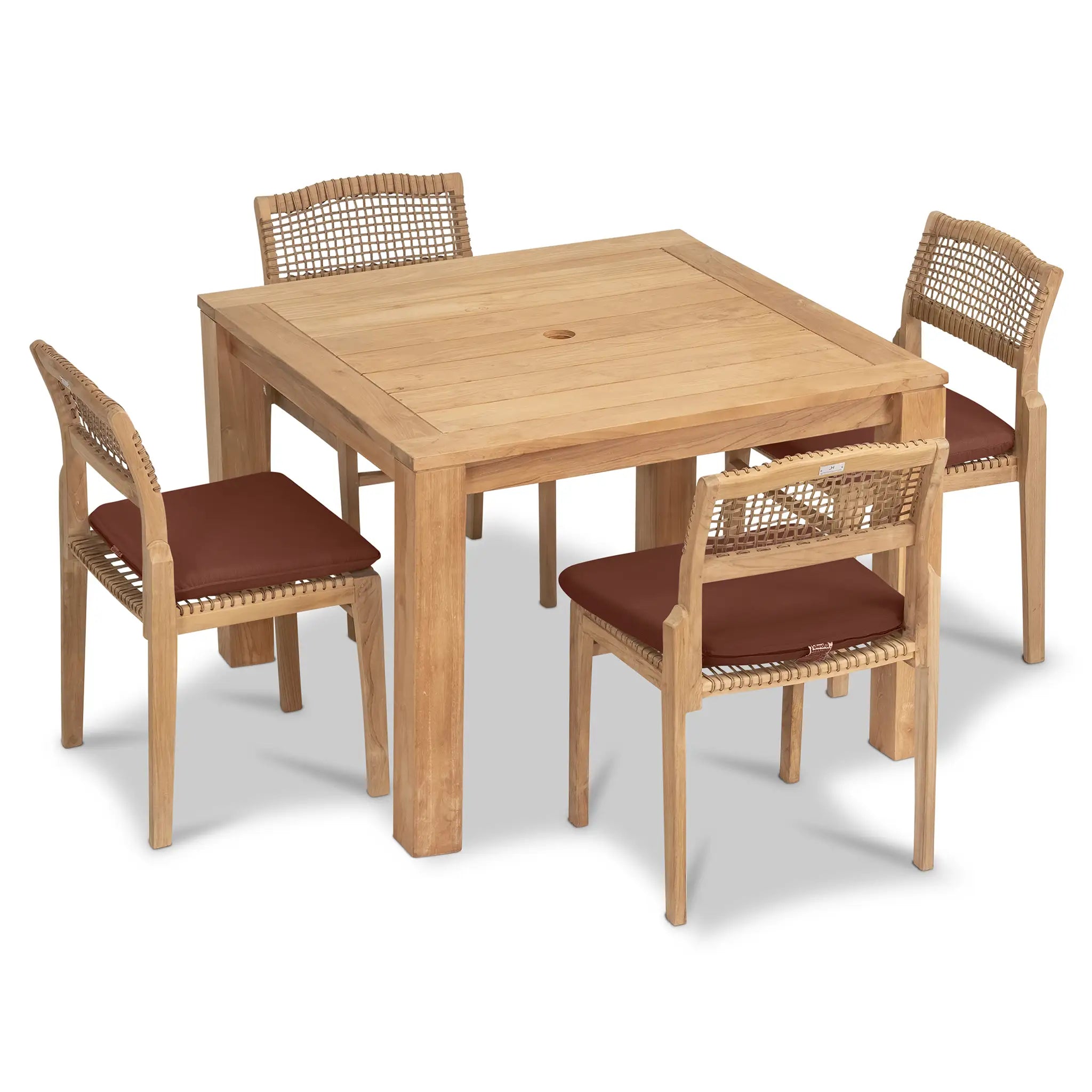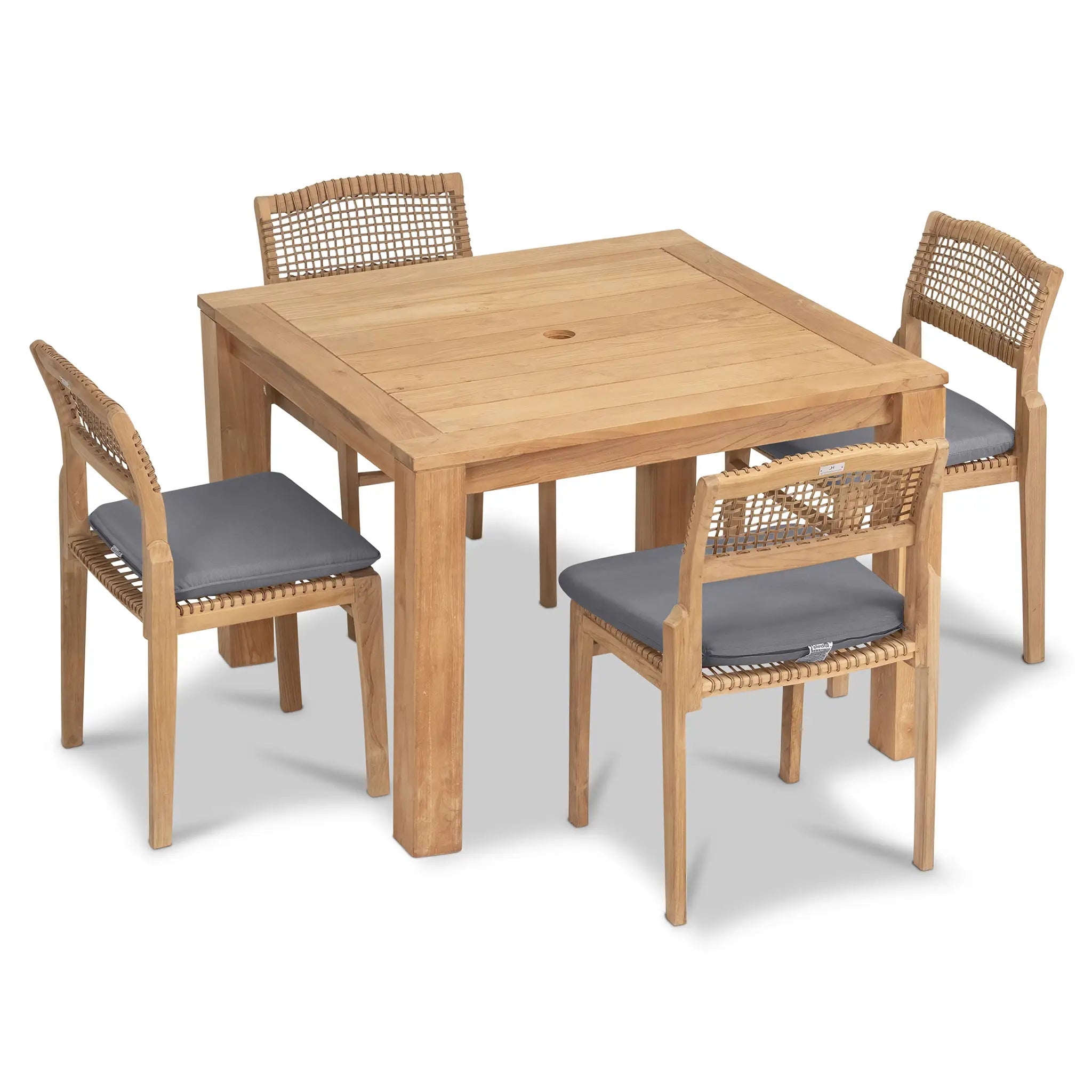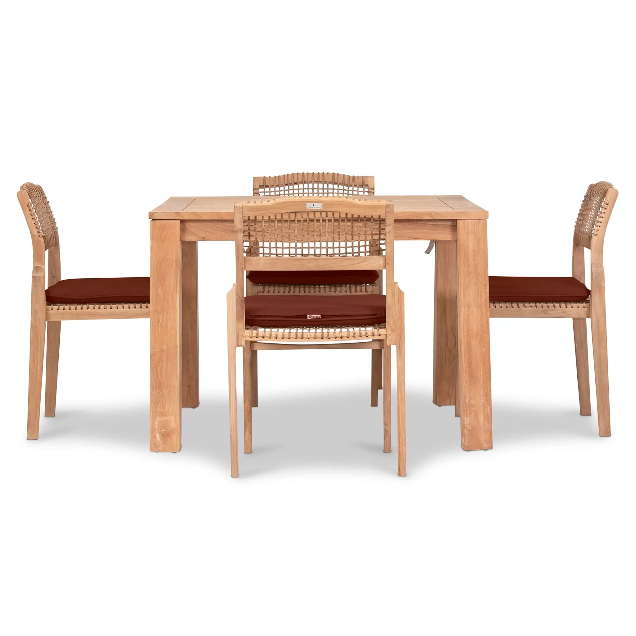 The Harmonia Living Sands 5 Piece Dining Set is a stunning fusion of mixed materials and architectural accents, offering a refined yet practical addition to any outdoor dining space. Designed with both style and durability in mind, this thoughtfully crafted set seamlessly blends the warmth of Grade A teak wood with the contemporary charm of handwoven HDPE wicker. Whether enhancing a cozy backyard retreat or an upscale commercial patio, the Sands collection delivers long-lasting beauty and functionality in a range of climates and environments.