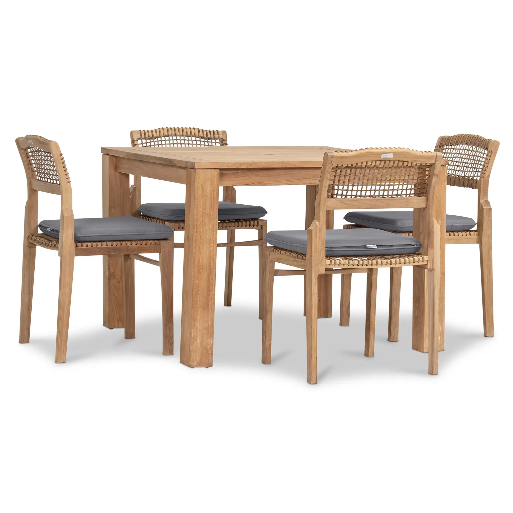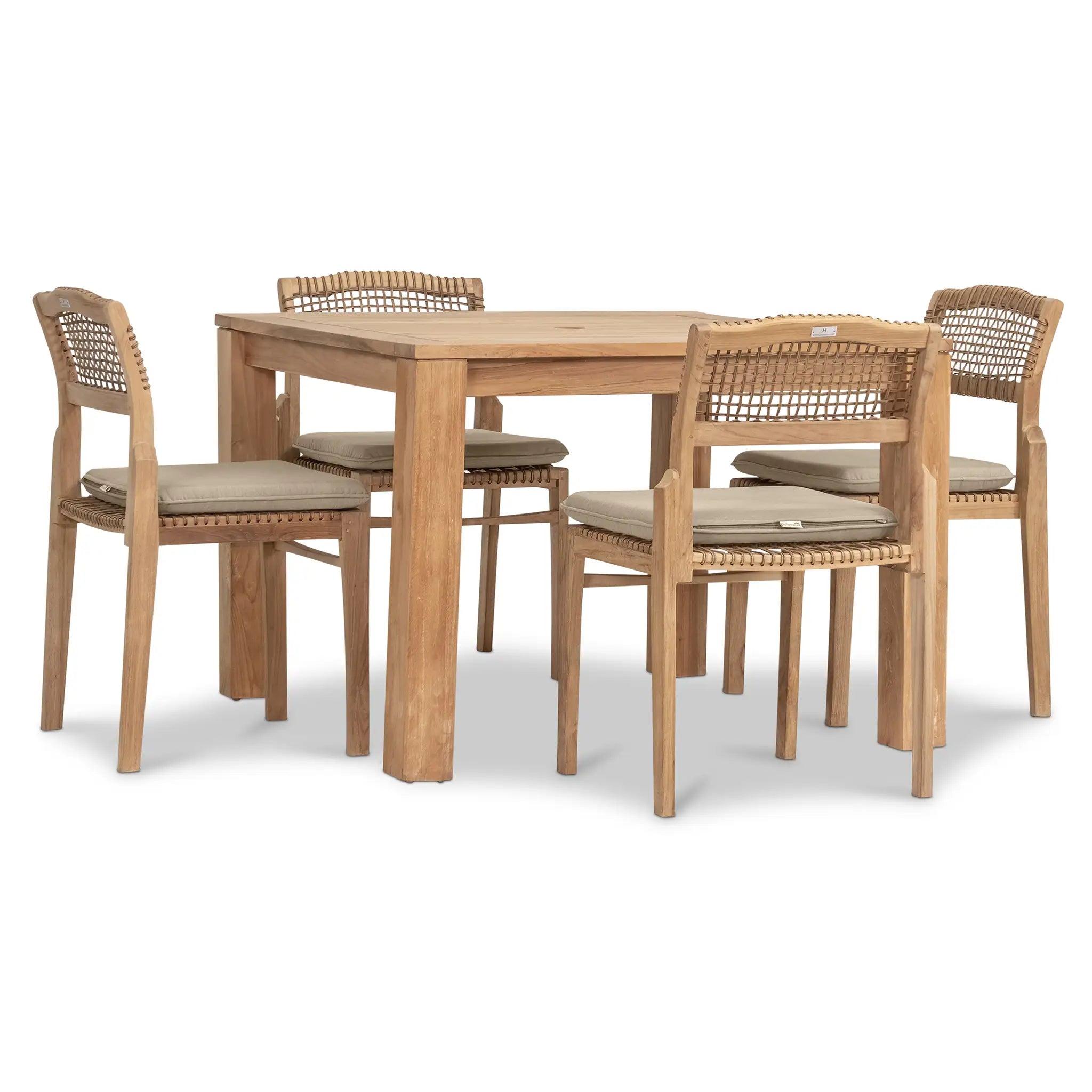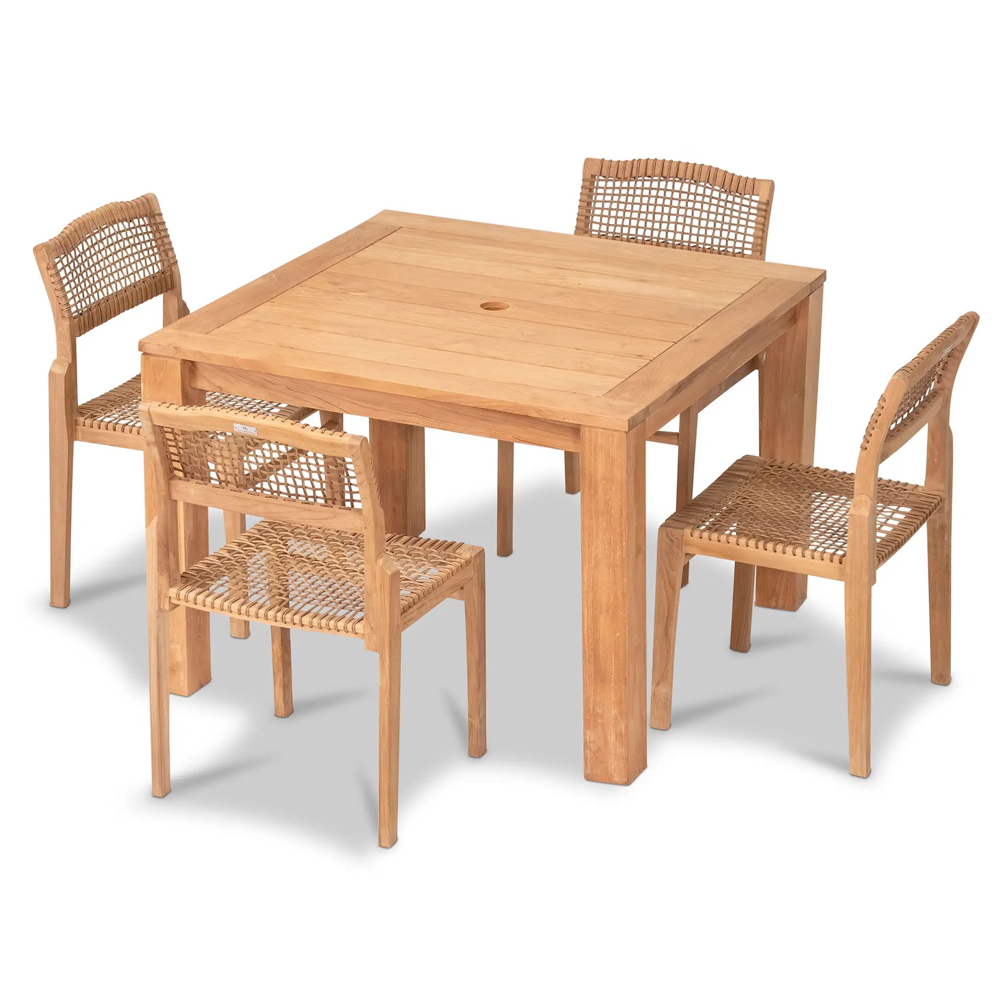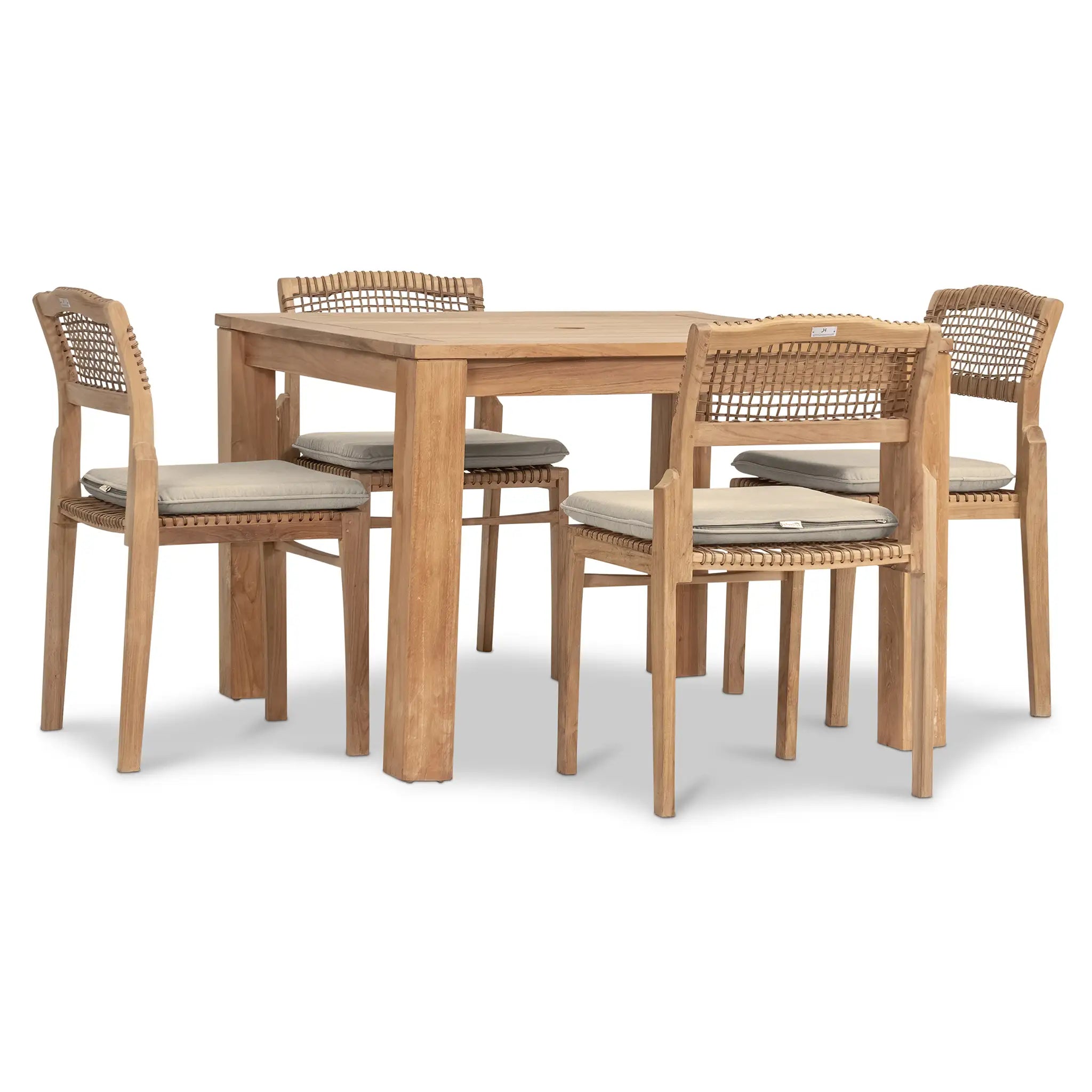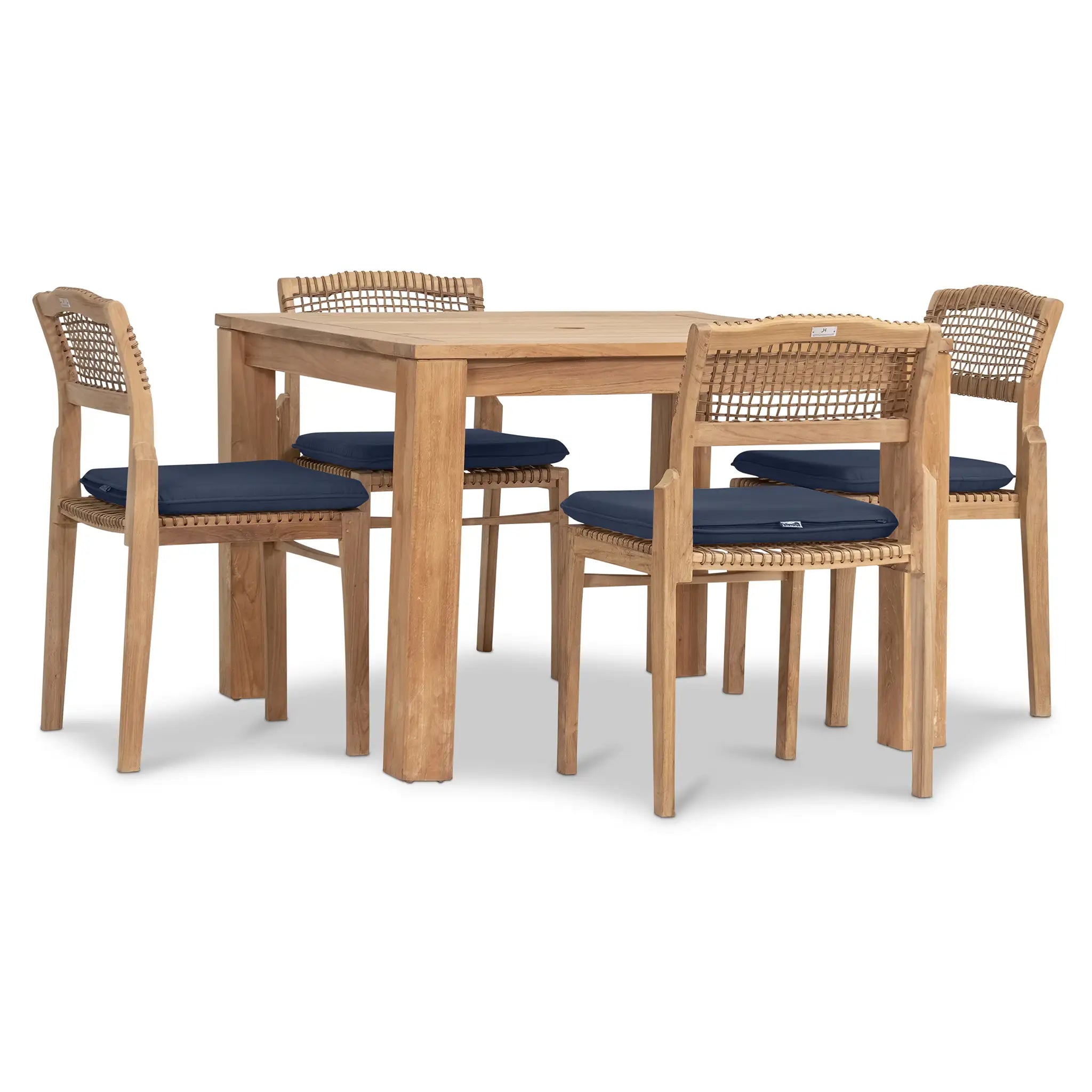 The Harmonia Living Sands 5 Piece Dining Set is a stunning fusion of mixed materials and architectural accents, offering a refined yet practical addition to any outdoor dining space. Designed with both style and durability in mind, this thoughtfully crafted set seamlessly blends the warmth of Grade A teak wood with the contemporary charm of handwoven HDPE wicker. Whether enhancing a cozy backyard retreat or an upscale commercial patio, the Sands collection delivers long-lasting beauty and functionality in a range of climates and environments.