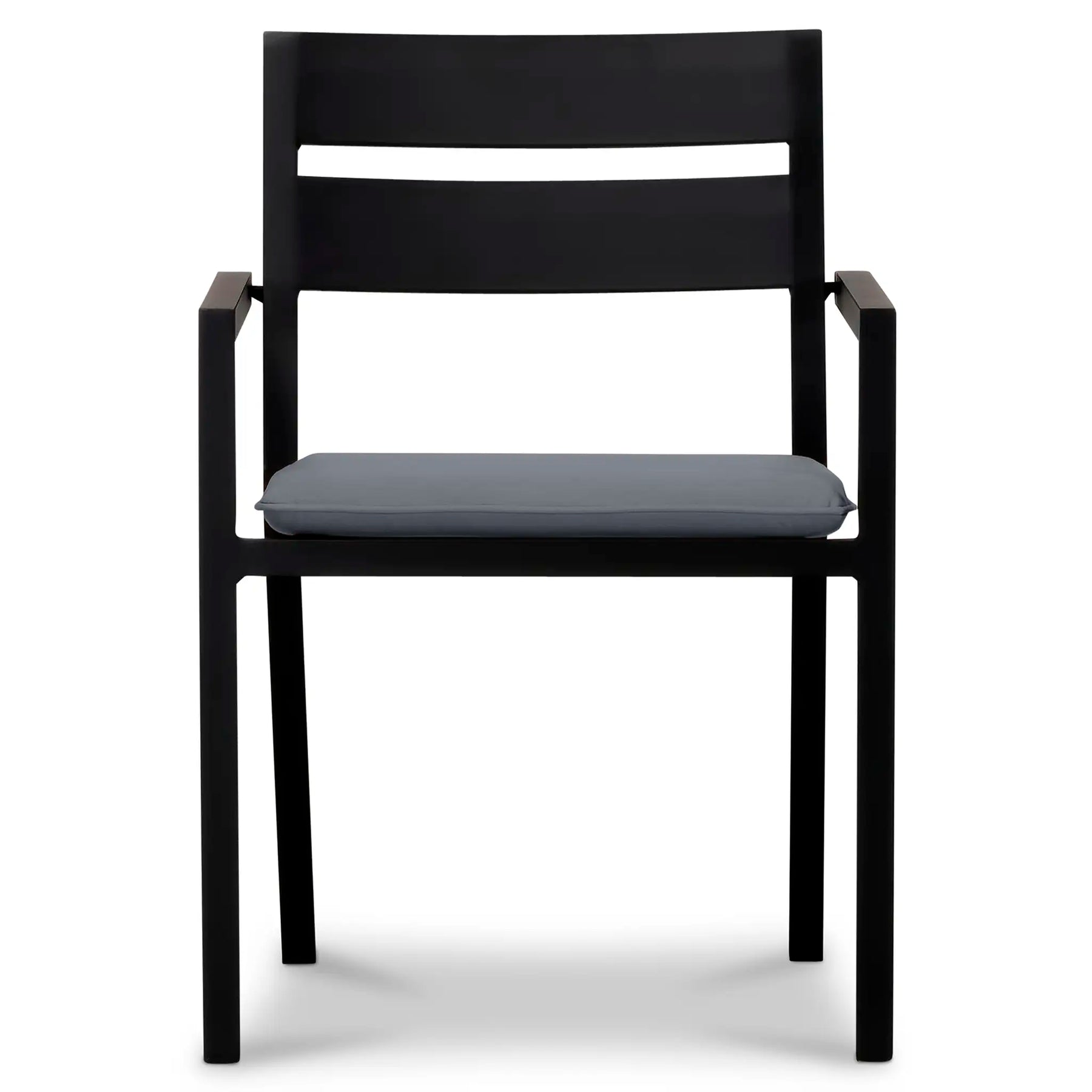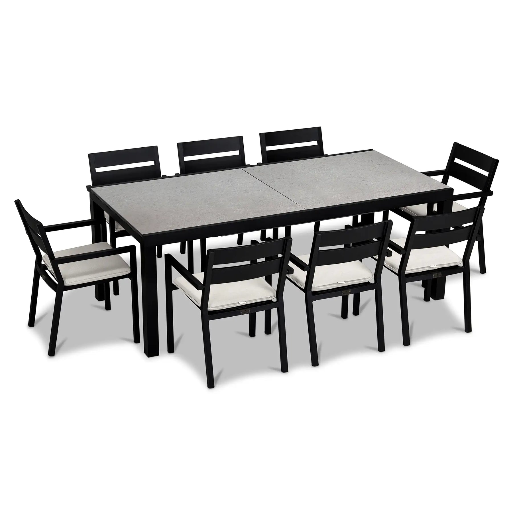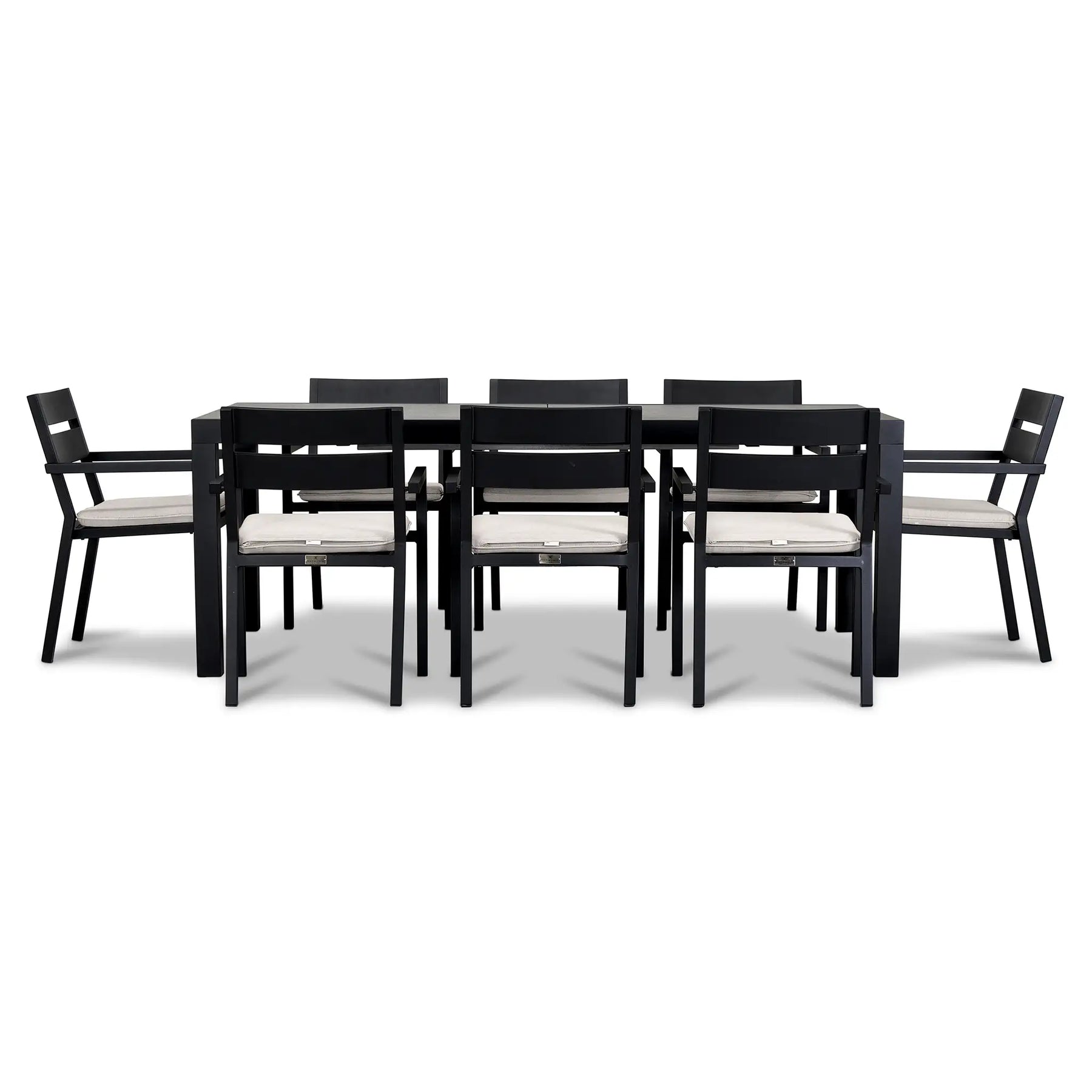 The Harmonia Living Pacifica 9 Piece Aluminum Extendable Dining Set - Black is the perfect blend of sophistication and functionality for your outdoor dining experience. Designed to enhance both large and small patios, this set features a sleek, minimalist aesthetic with plush cushions and gentle angles that create an inviting and elegant atmosphere. Whether hosting an intimate dinner or a larger gathering, this set offers both style and comfort for all occasions.