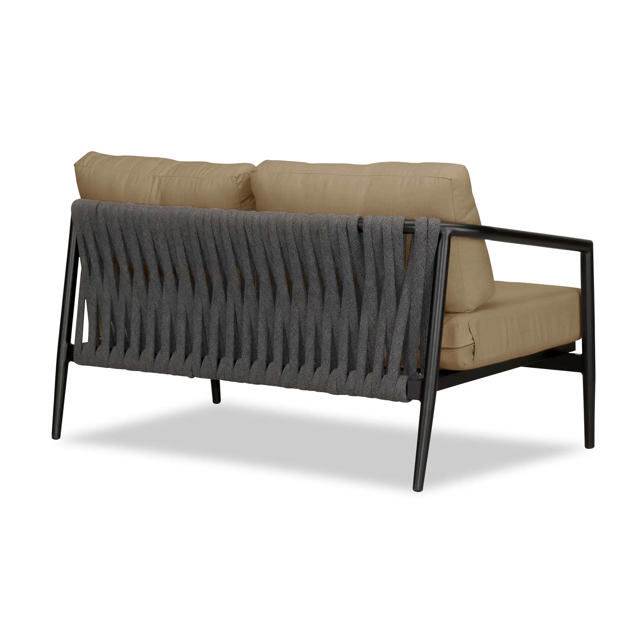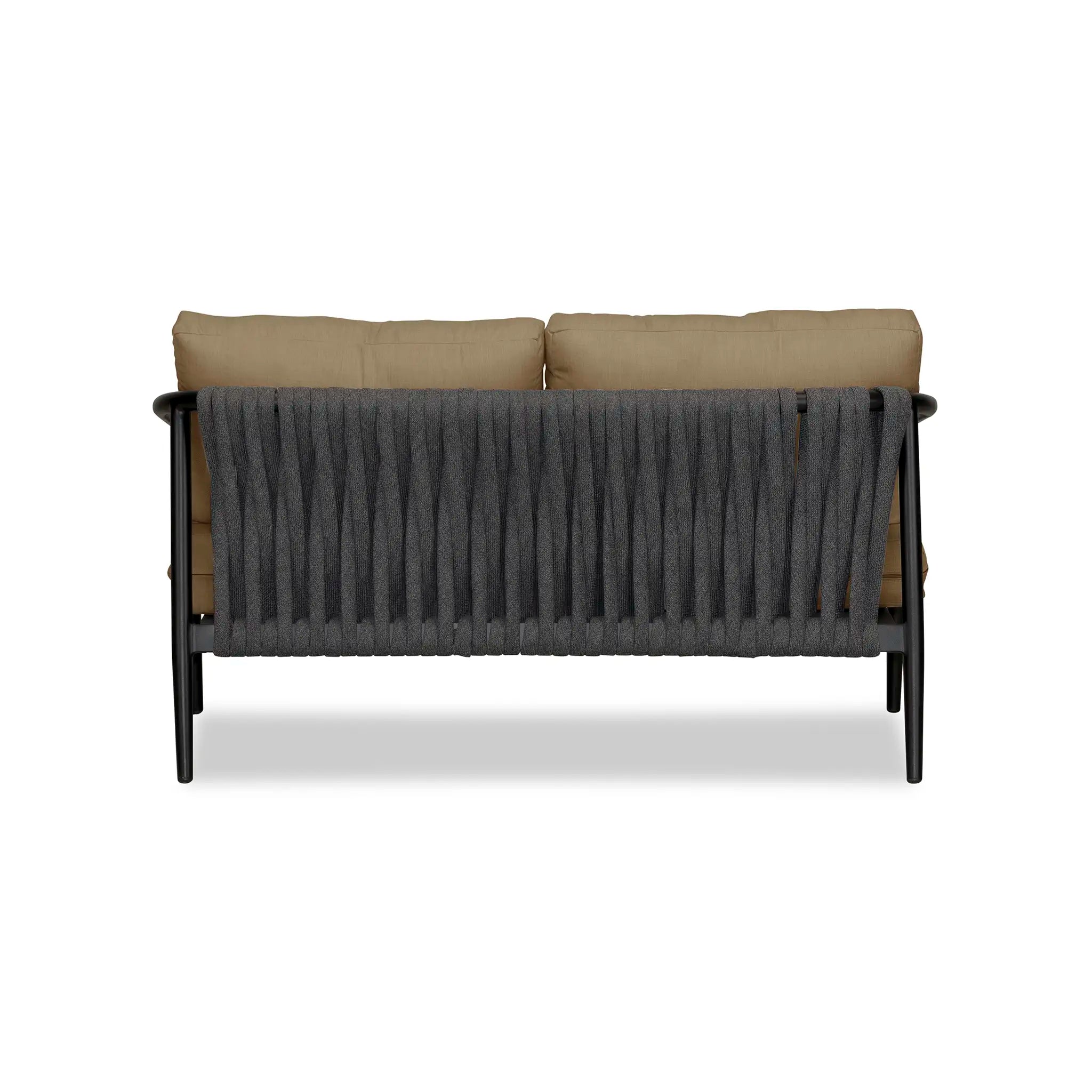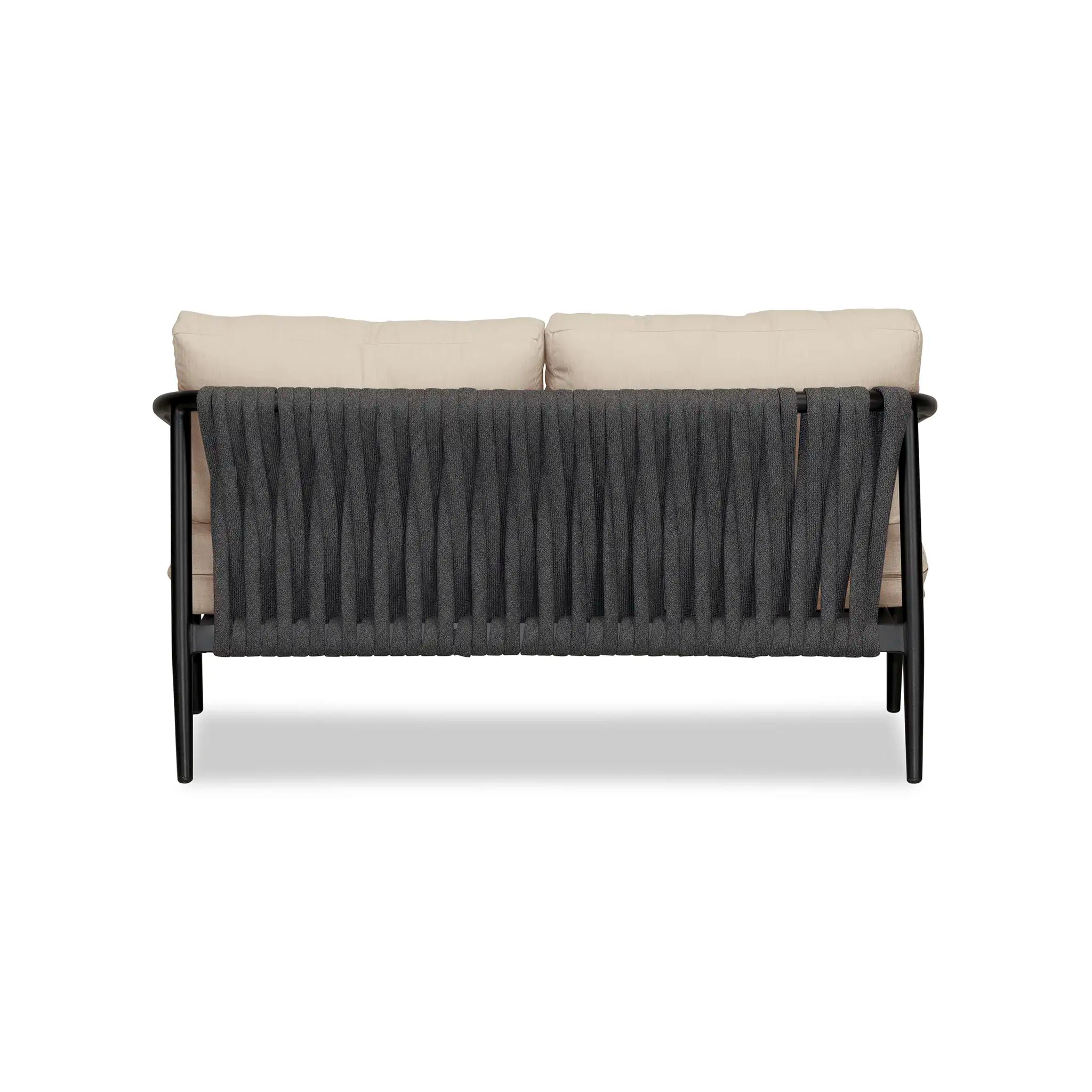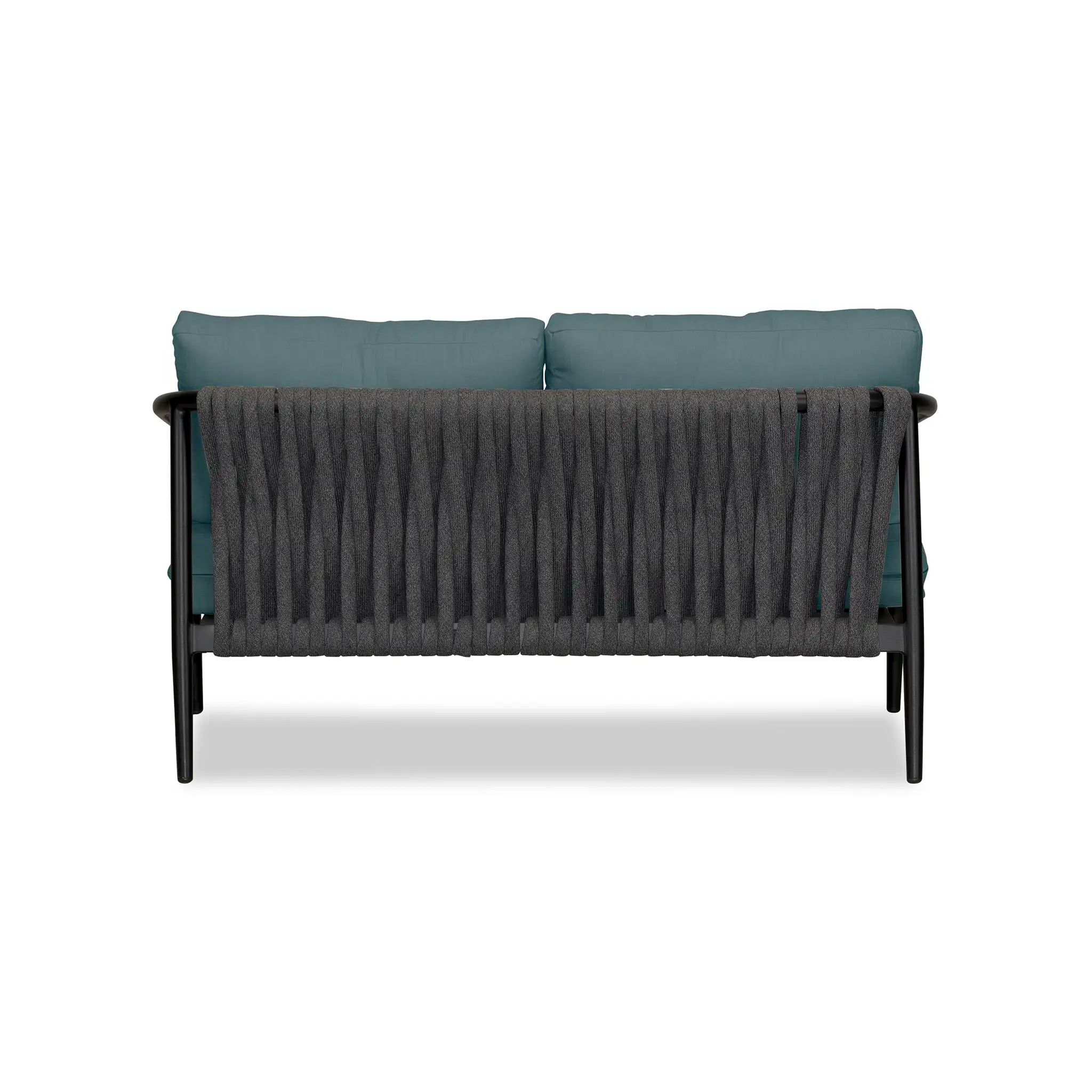 The Harmonia Living Olio LoveSeat Aluminum - Black/Carbon is a stunning fusion of Mid-Century Modern inspiration and contemporary craftsmanship, offering both timeless style and superior comfort. Designed with subtle curves, tapered legs, and an intricate roped back, this loveseat brings a sophisticated artistic touch to any outdoor space. Its compact footprint makes it ideal for a variety of settings, from spacious patios to intimate balconies, while its deep-seating comfort ensures a luxurious lounging experience.