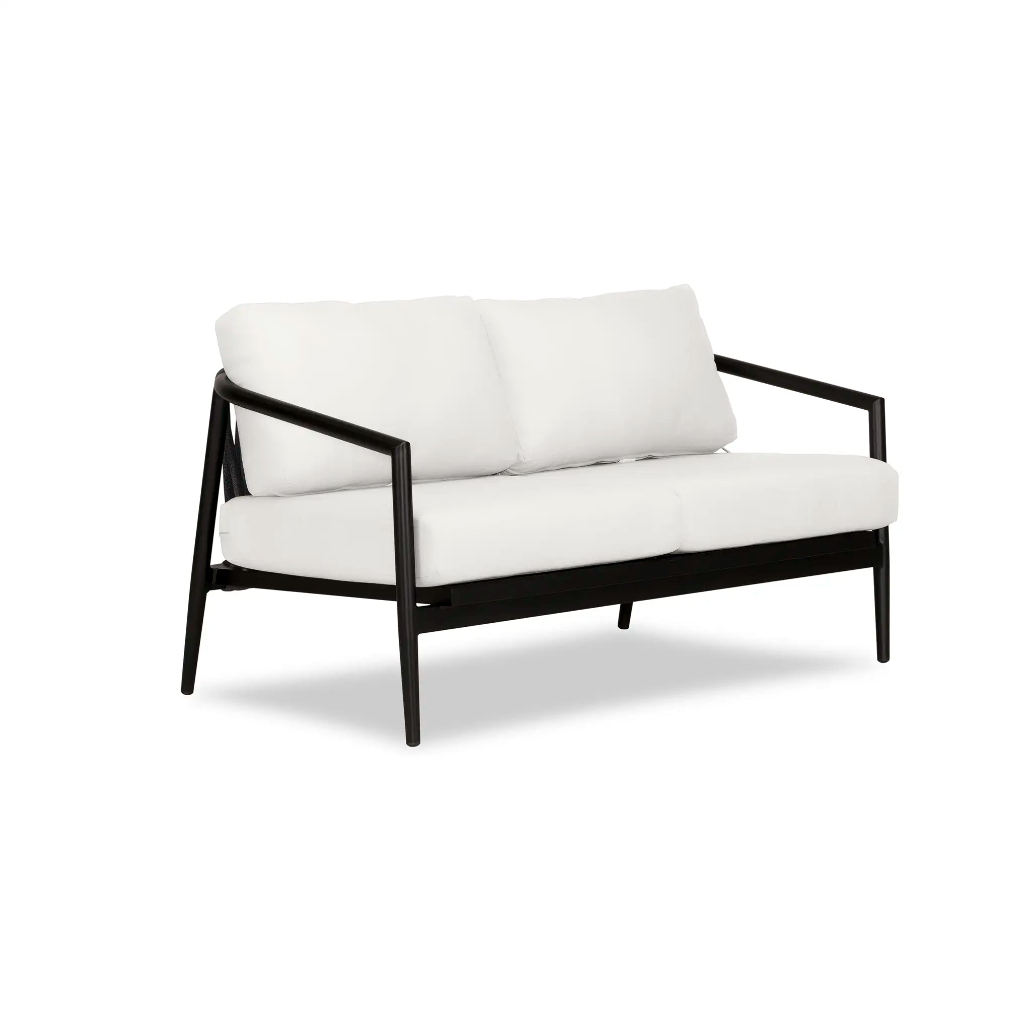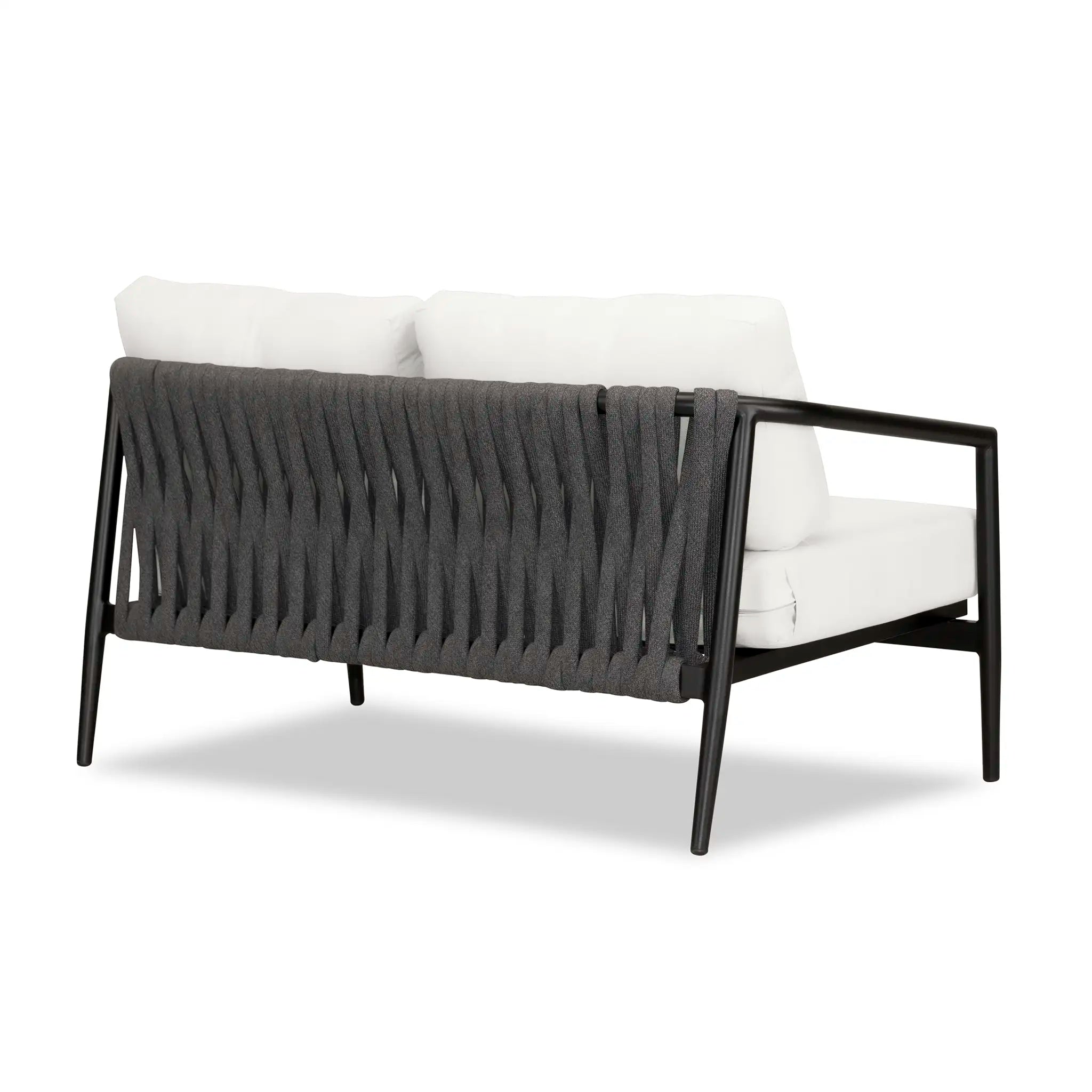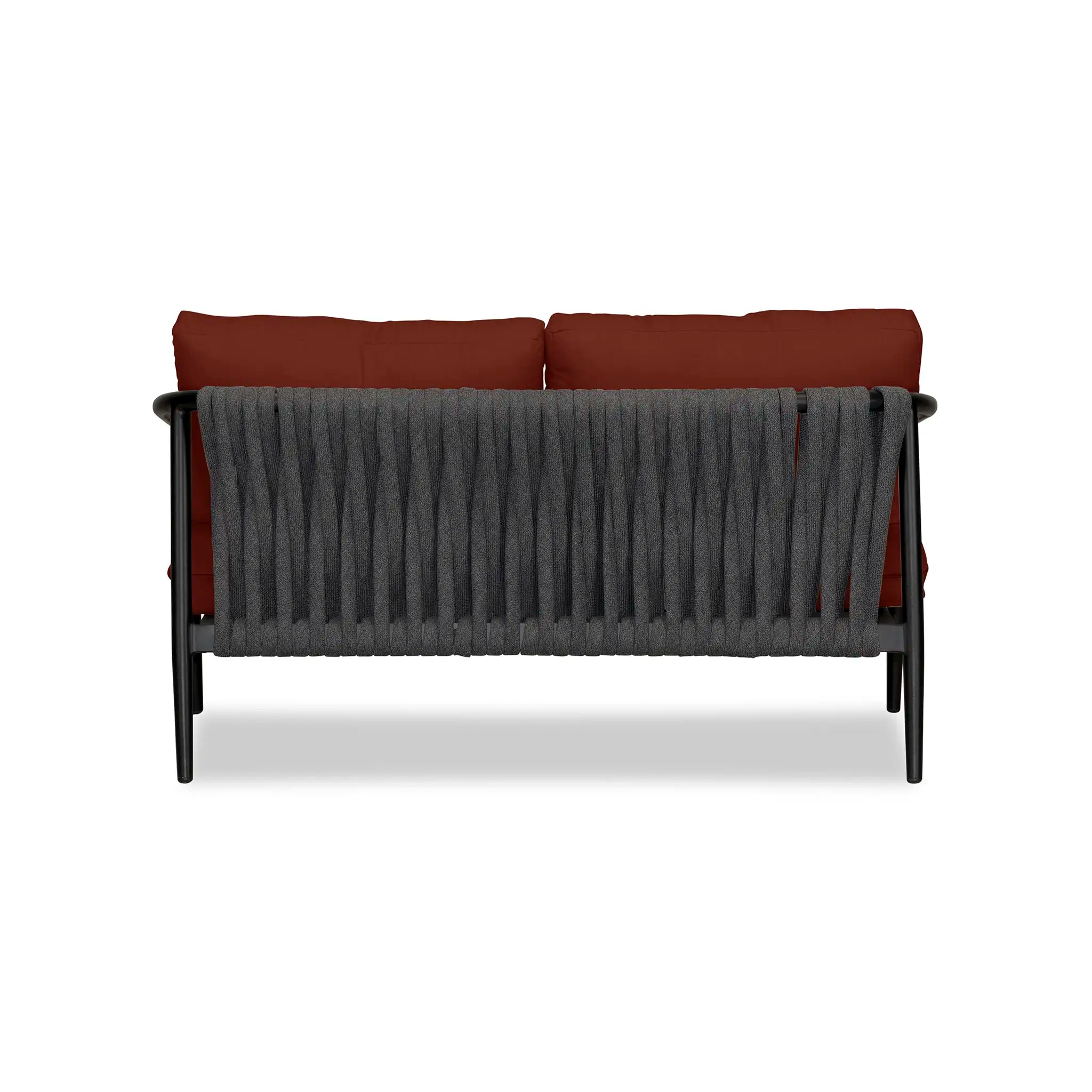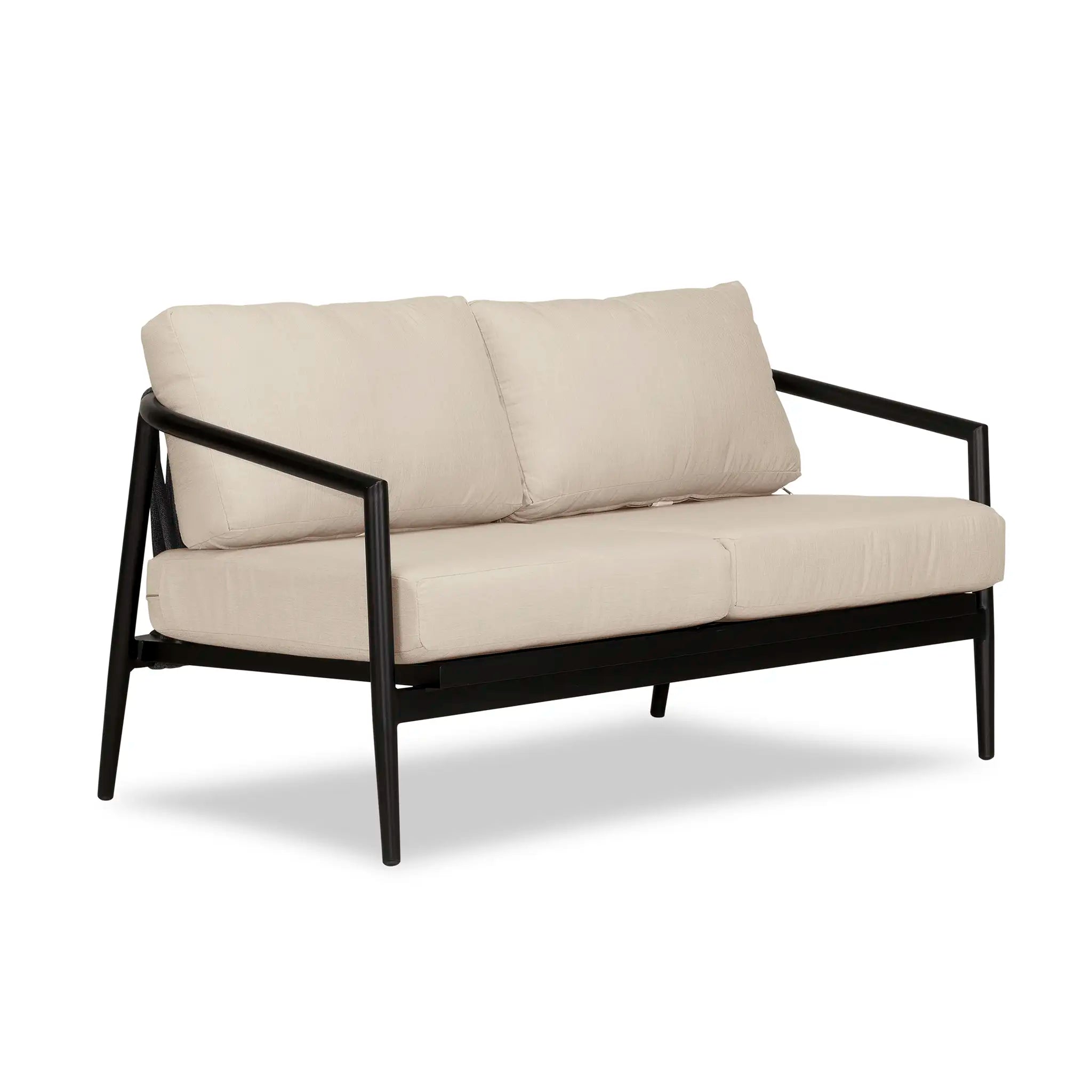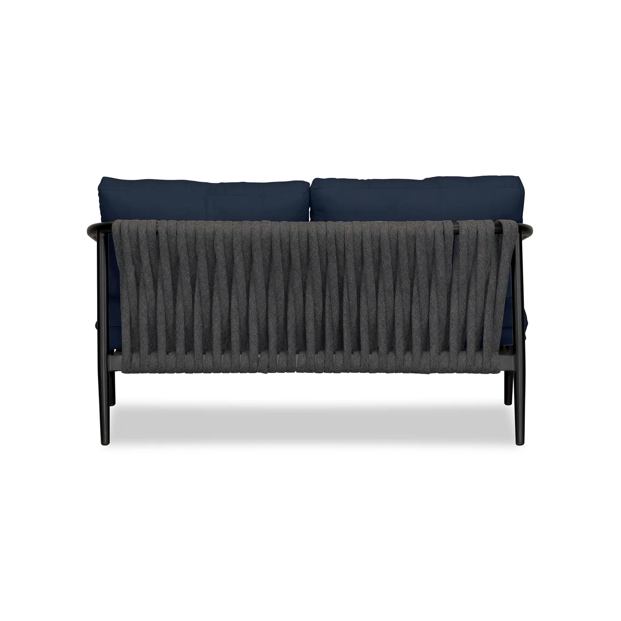 The Harmonia Living Olio LoveSeat Aluminum - Black/Carbon is a stunning fusion of Mid-Century Modern inspiration and contemporary craftsmanship, offering both timeless style and superior comfort. Designed with subtle curves, tapered legs, and an intricate roped back, this loveseat brings a sophisticated artistic touch to any outdoor space. Its compact footprint makes it ideal for a variety of settings, from spacious patios to intimate balconies, while its deep-seating comfort ensures a luxurious lounging experience.