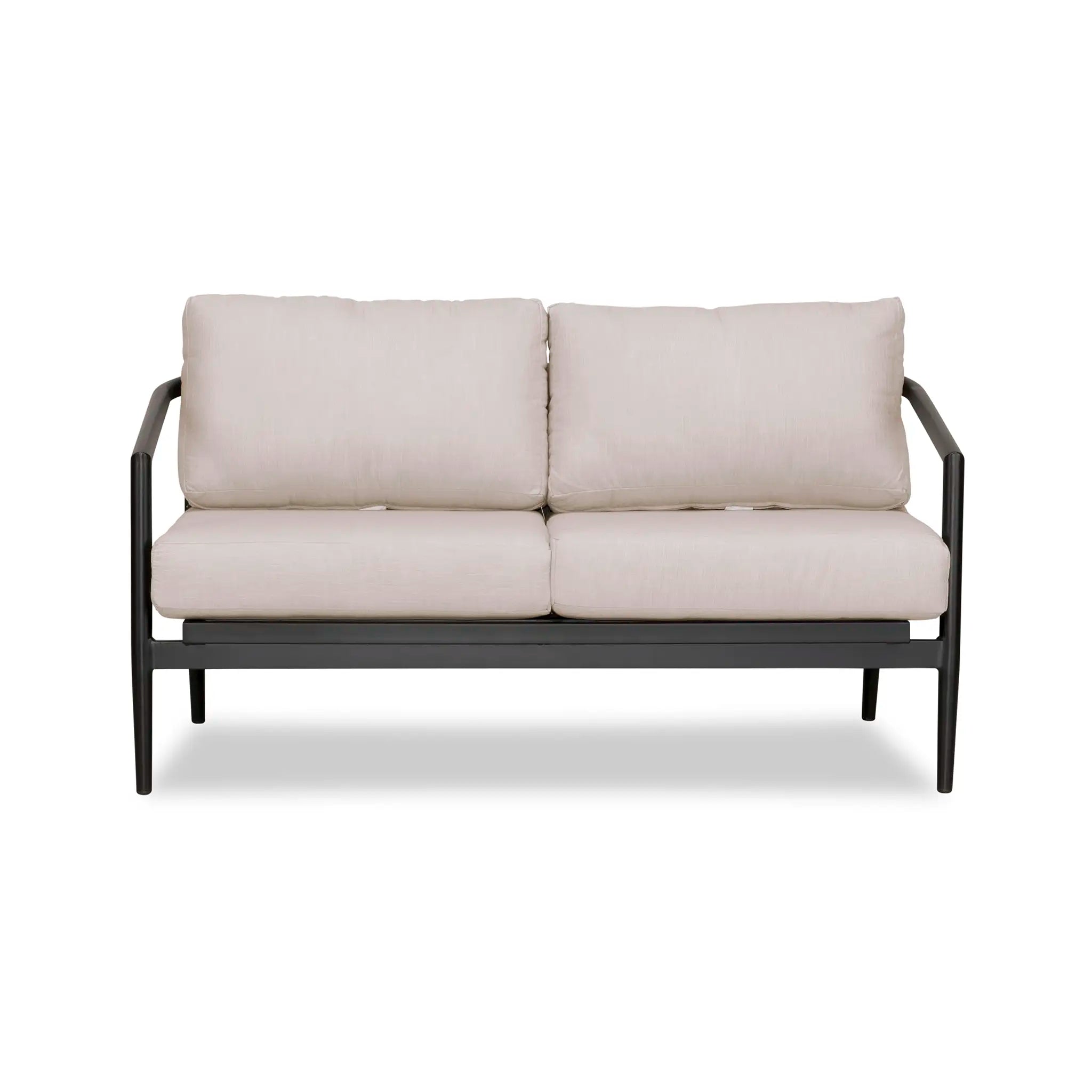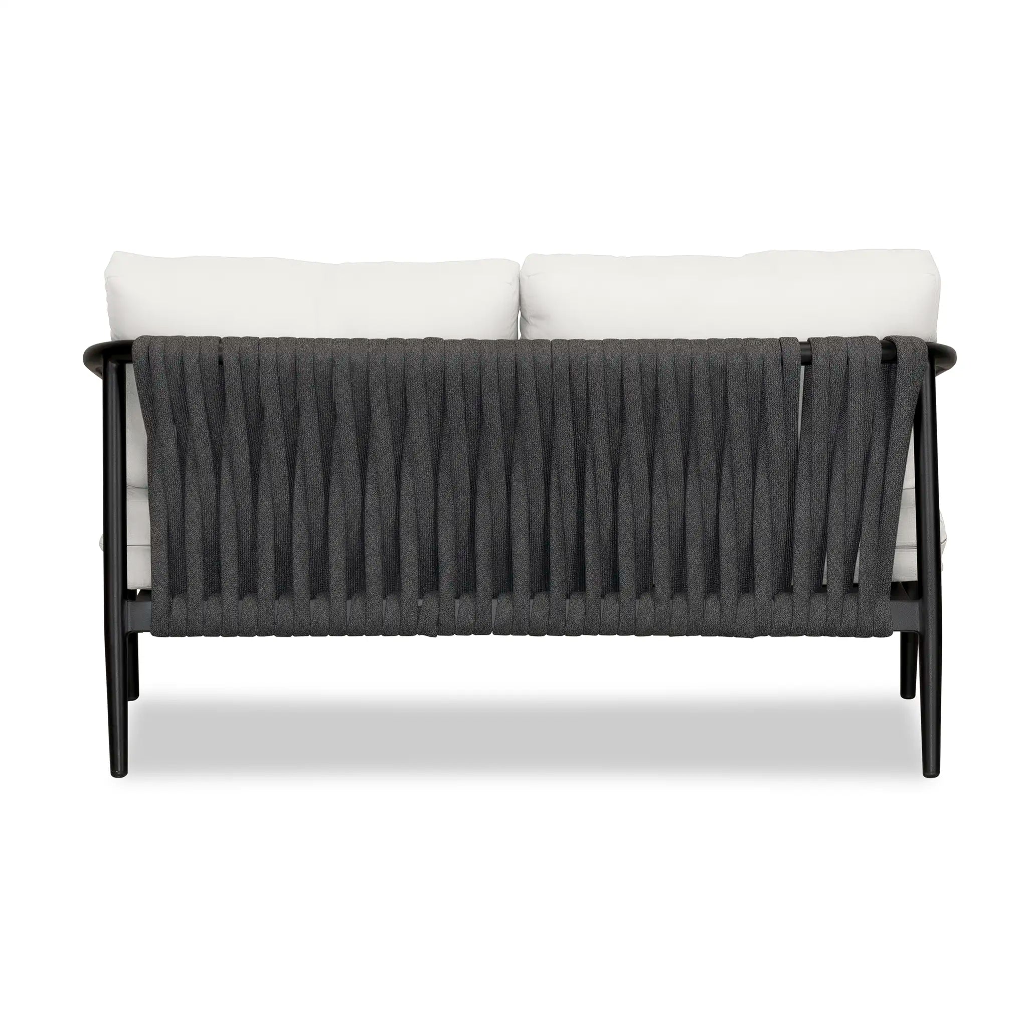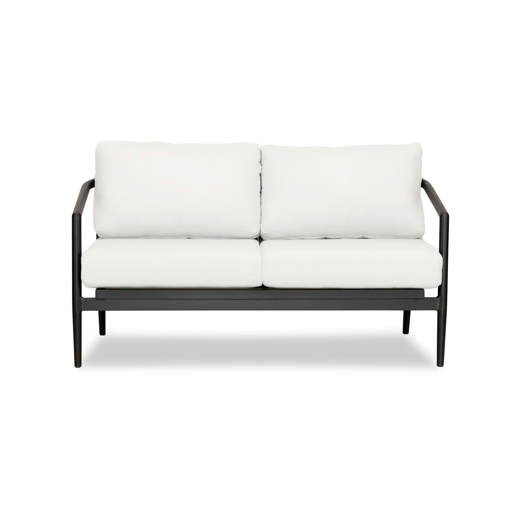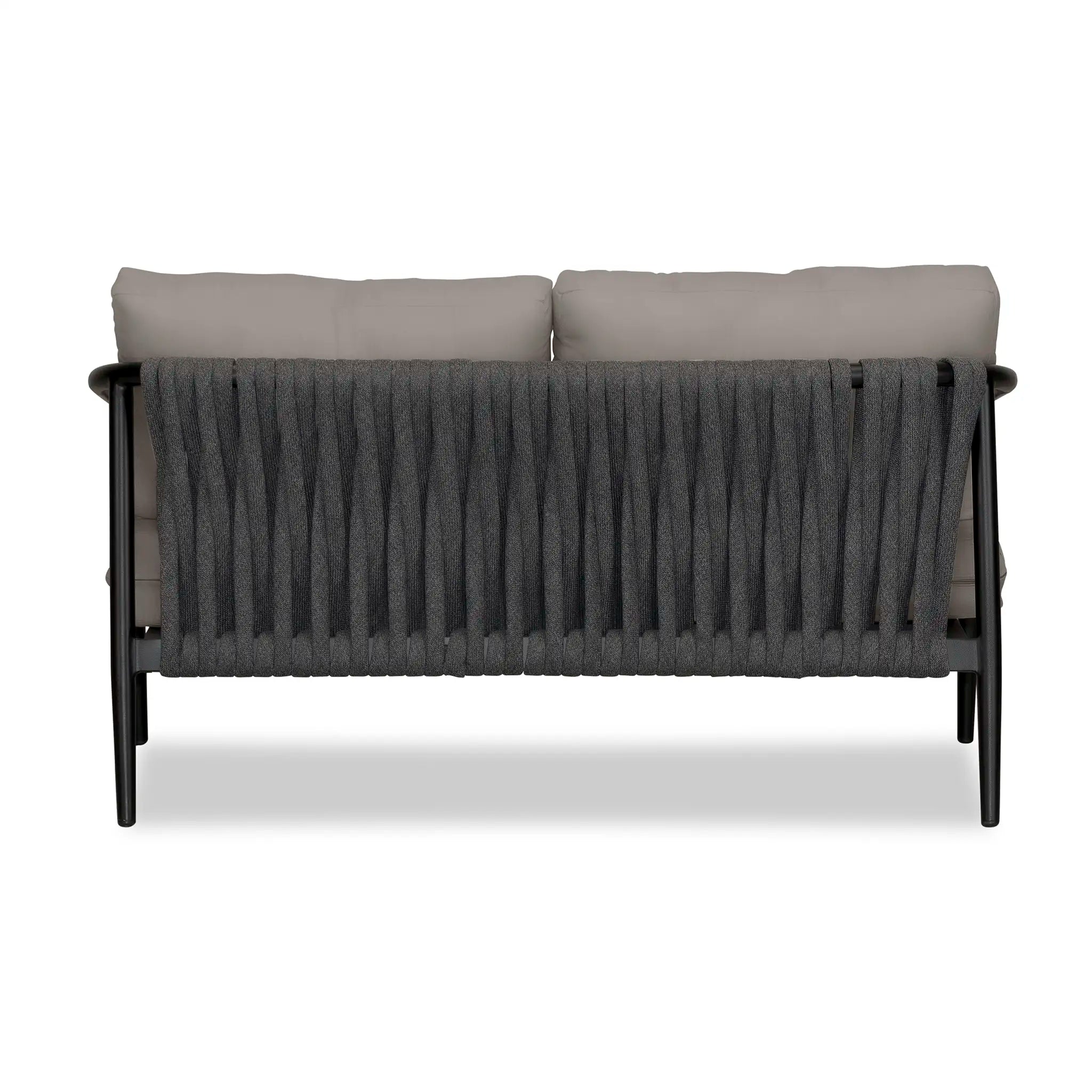 The Harmonia Living Olio LoveSeat Aluminum - Black/Carbon is a stunning fusion of Mid-Century Modern inspiration and contemporary craftsmanship, offering both timeless style and superior comfort. Designed with subtle curves, tapered legs, and an intricate roped back, this loveseat brings a sophisticated artistic touch to any outdoor space. Its compact footprint makes it ideal for a variety of settings, from spacious patios to intimate balconies, while its deep-seating comfort ensures a luxurious lounging experience.