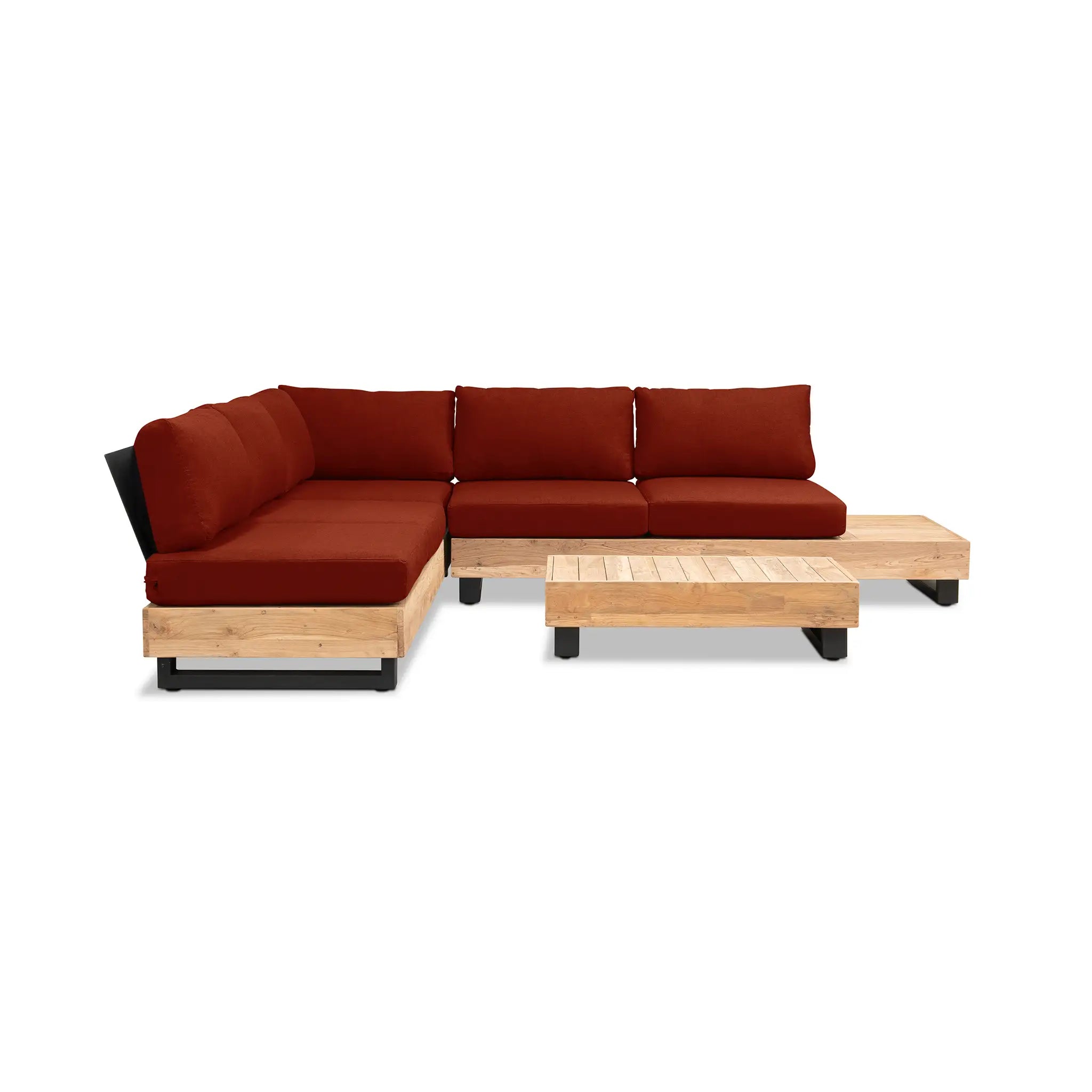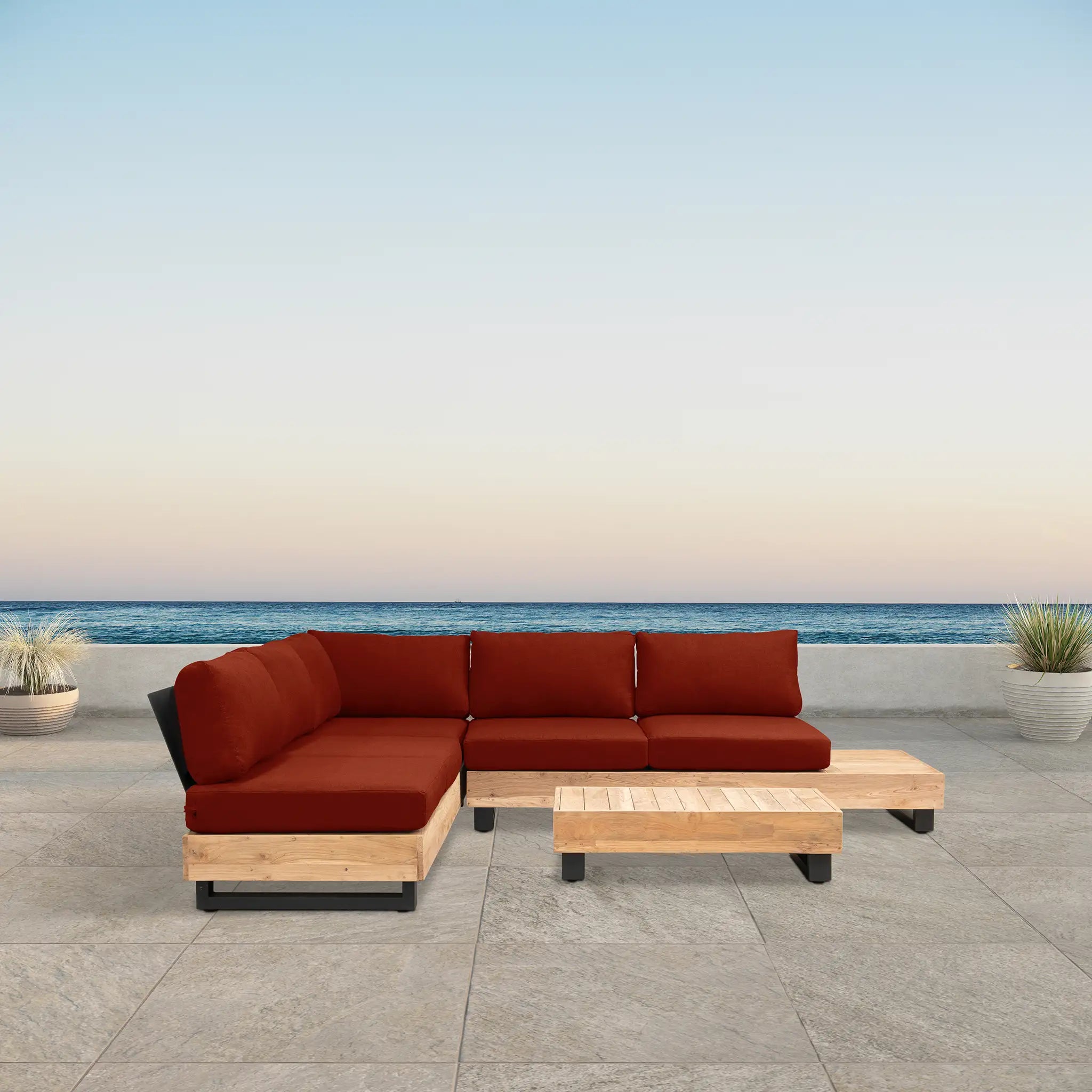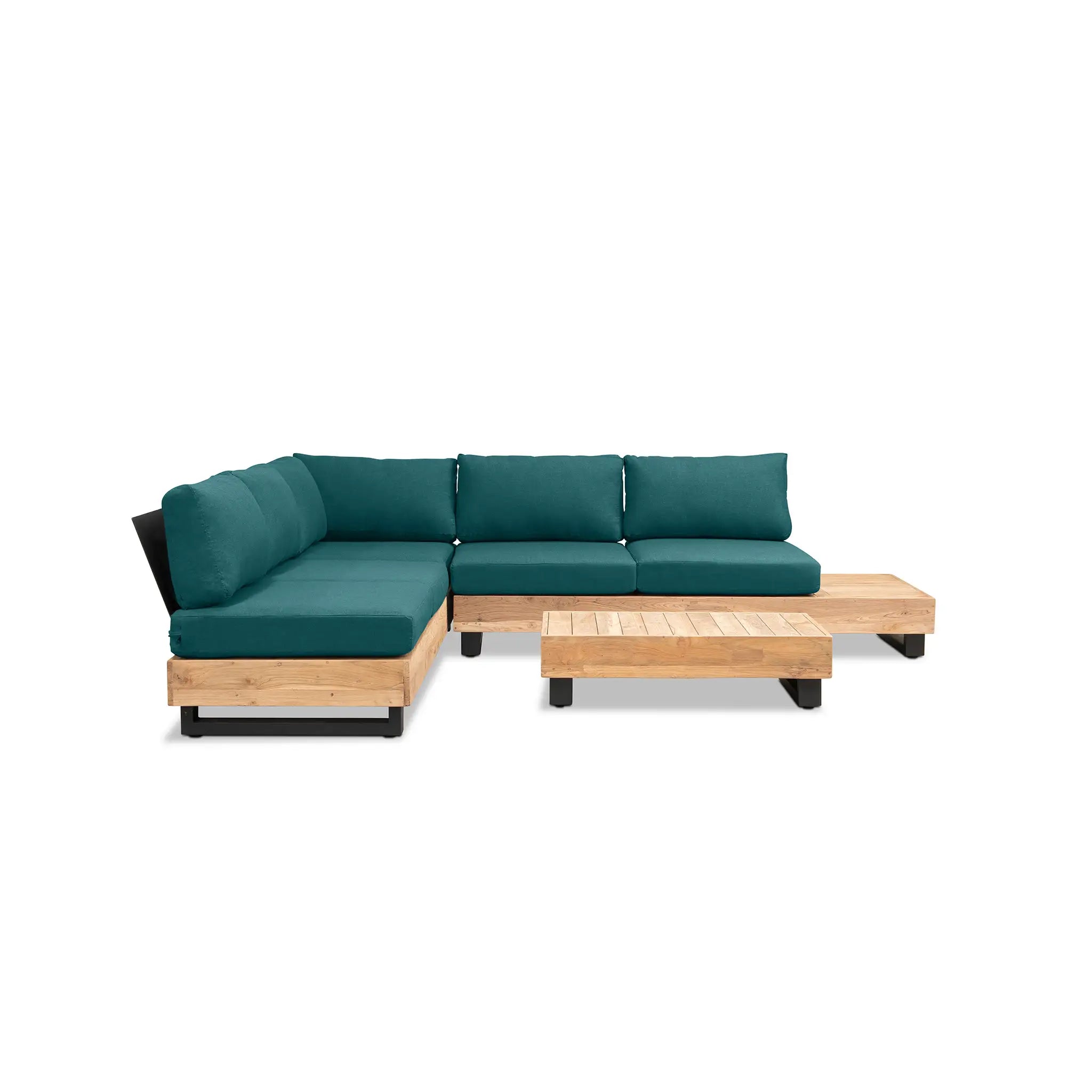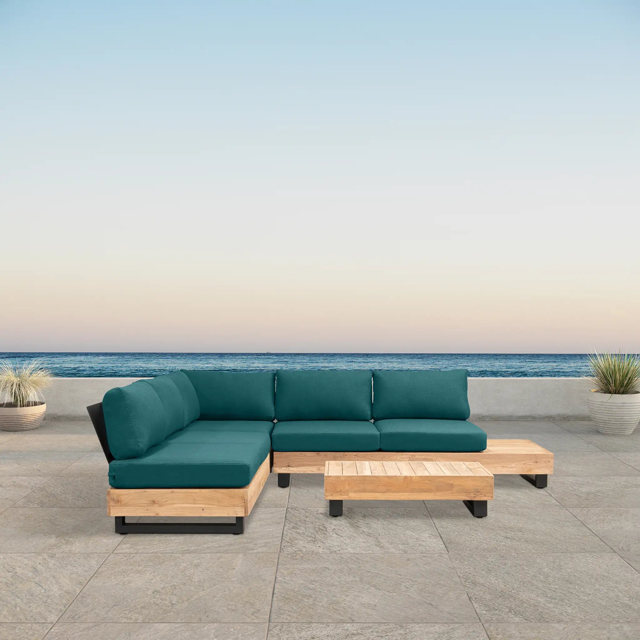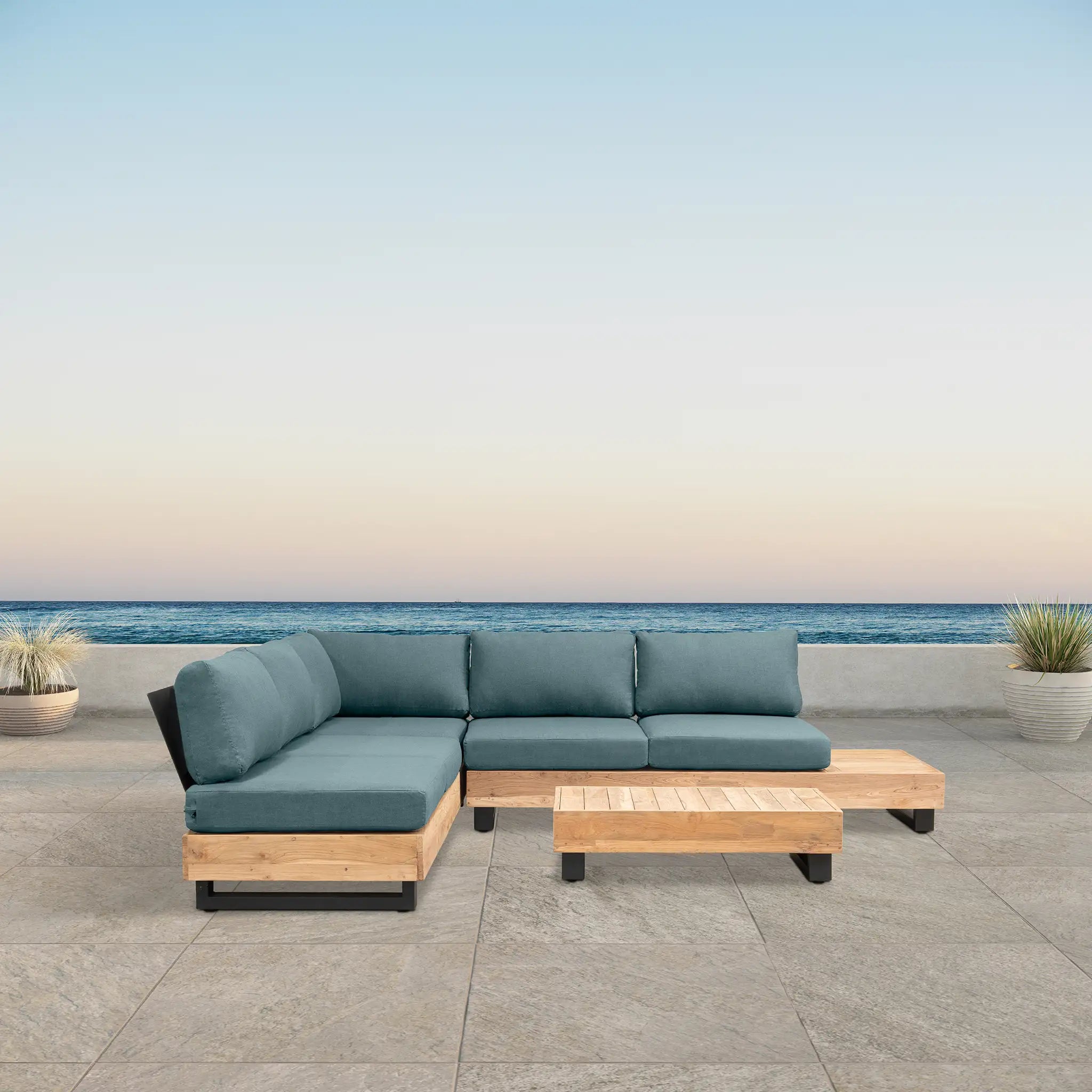 Crafted with integrity, sustainability, and expert craftsmanship, this low-profile sectional is simplistic yet inviting, offering a natural touch and timeless appeal. The fully-welded aluminum frame is treated with a powder-coated finish, ensuring long-lasting durability in all seasons. The seating and tabletop are made from Grade A reclaimed teak, sourced from 100% FSC Certified® Indonesian teak, meaning no new trees were harvested. This not only enhances the organic beauty of the furniture but also makes each piece a one-of-a-kind work of art.