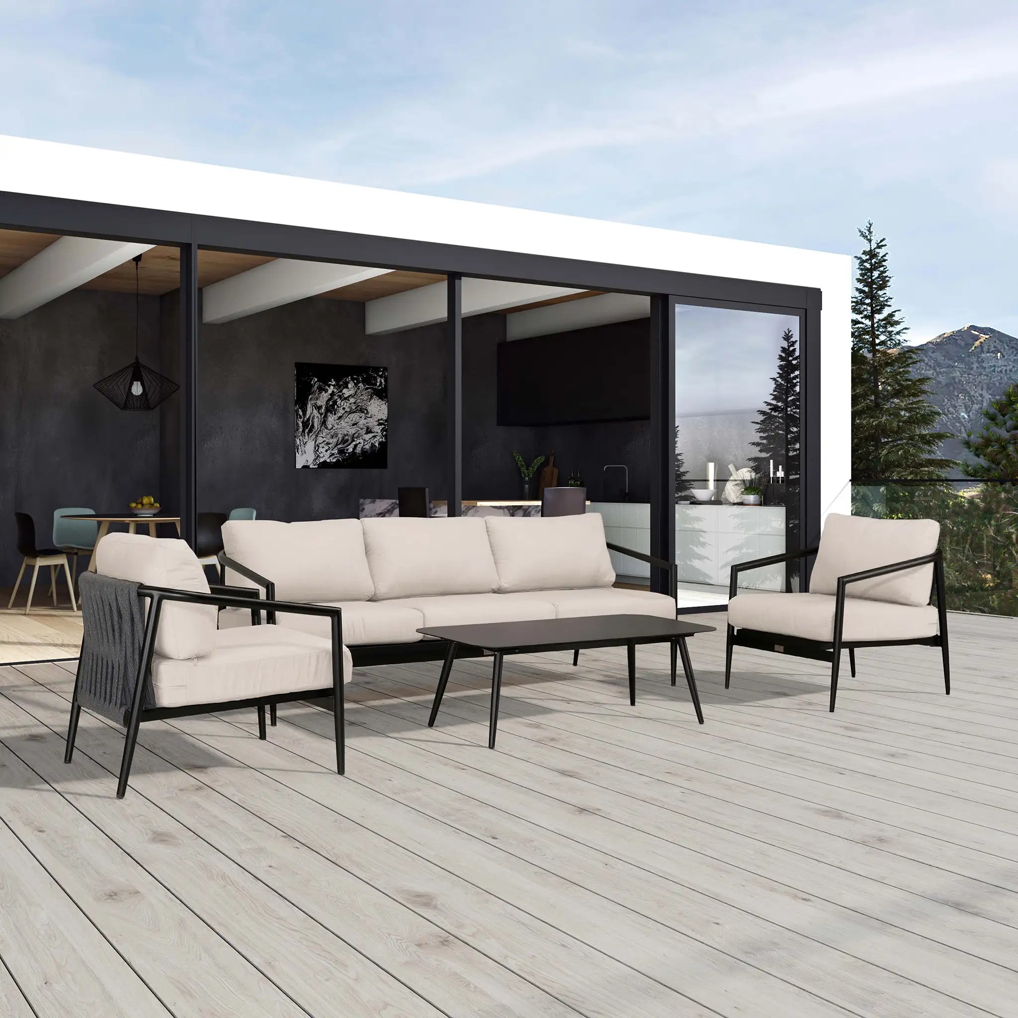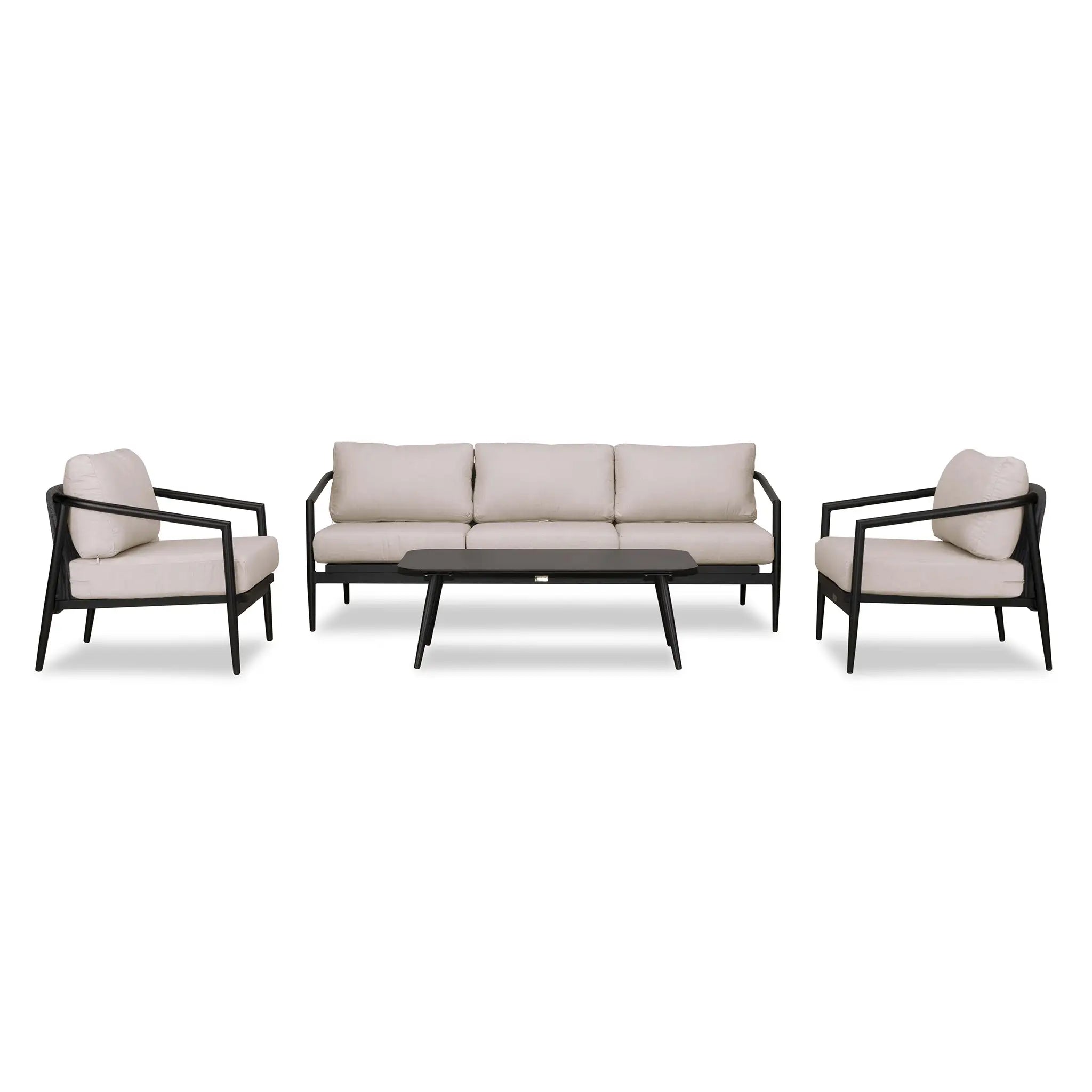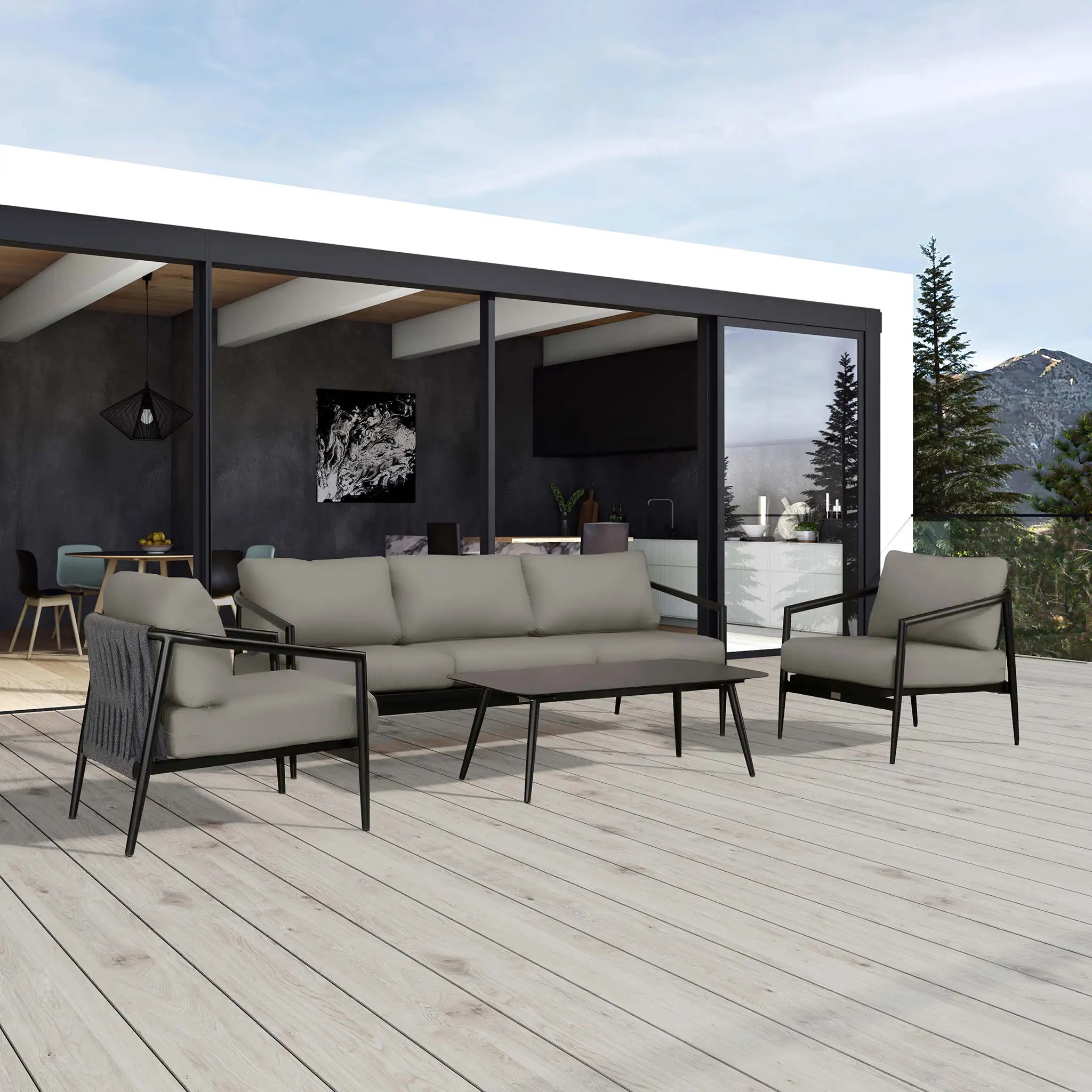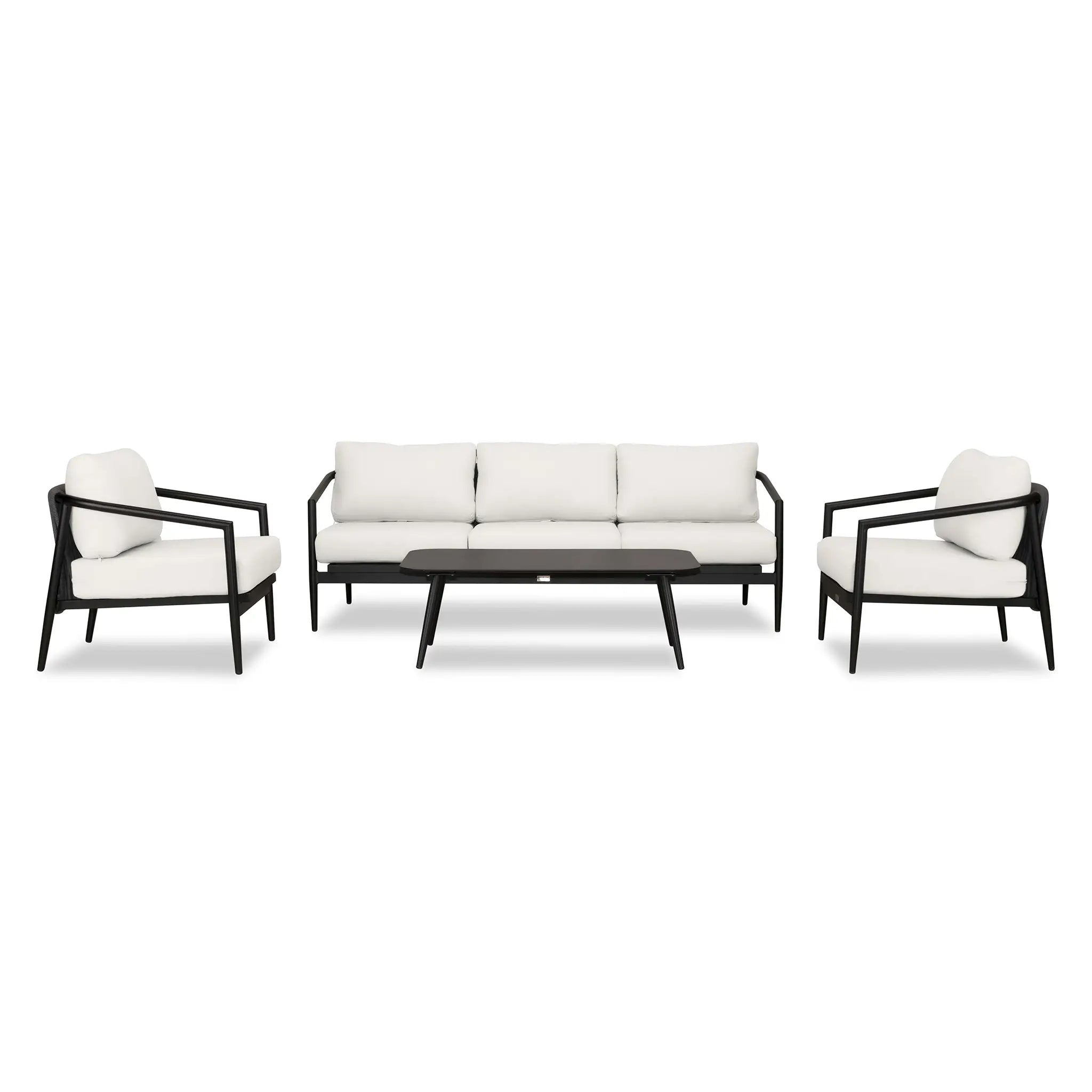 Complementing the seating arrangement is a sleek, aluminum coffee table, which offers a sturdy and modern surface for drinks, decor, or entertaining essentials. Its low-maintenance design makes it a perfect addition to the overall set, seamlessly tying together the elegant and functional aesthetic of the Olio collection.