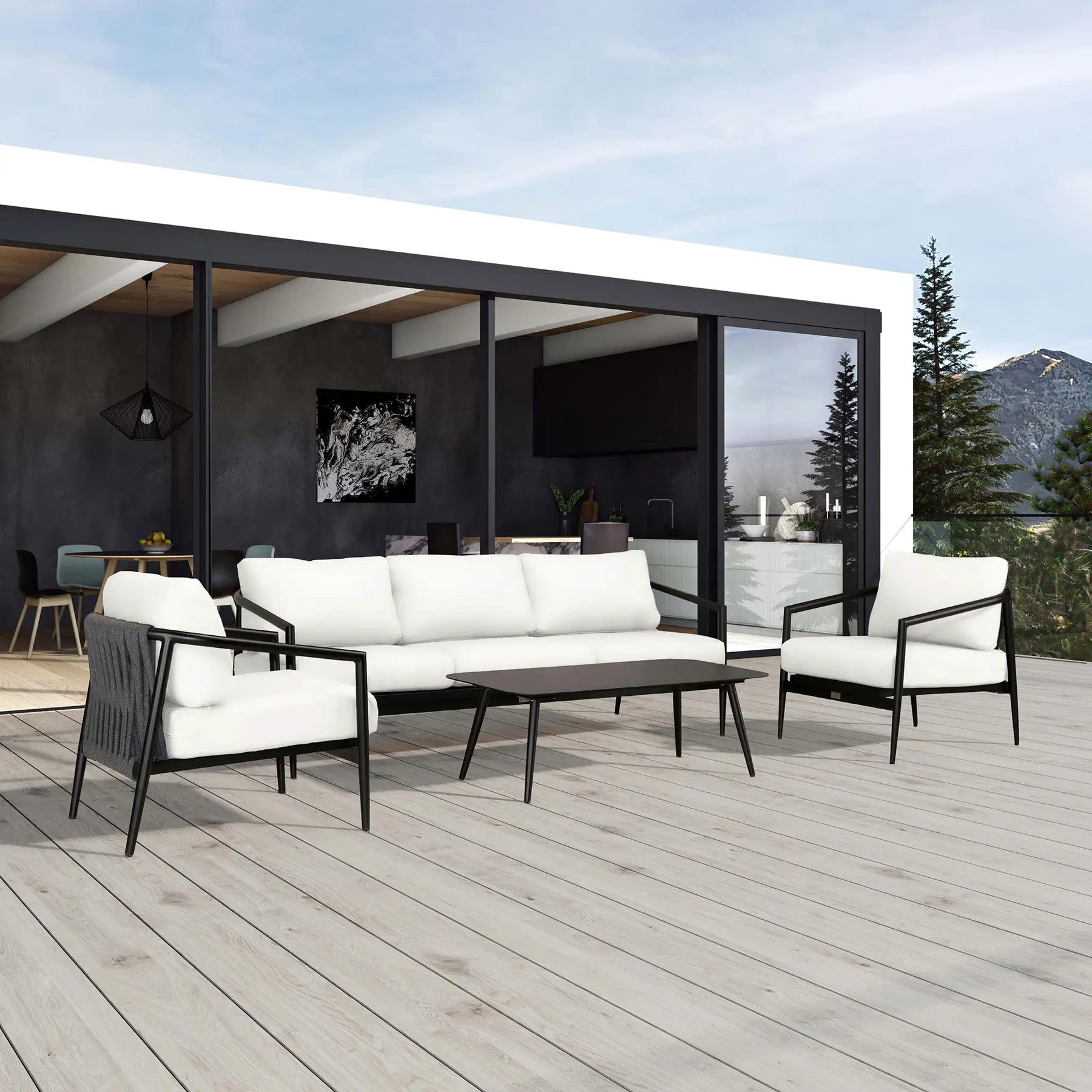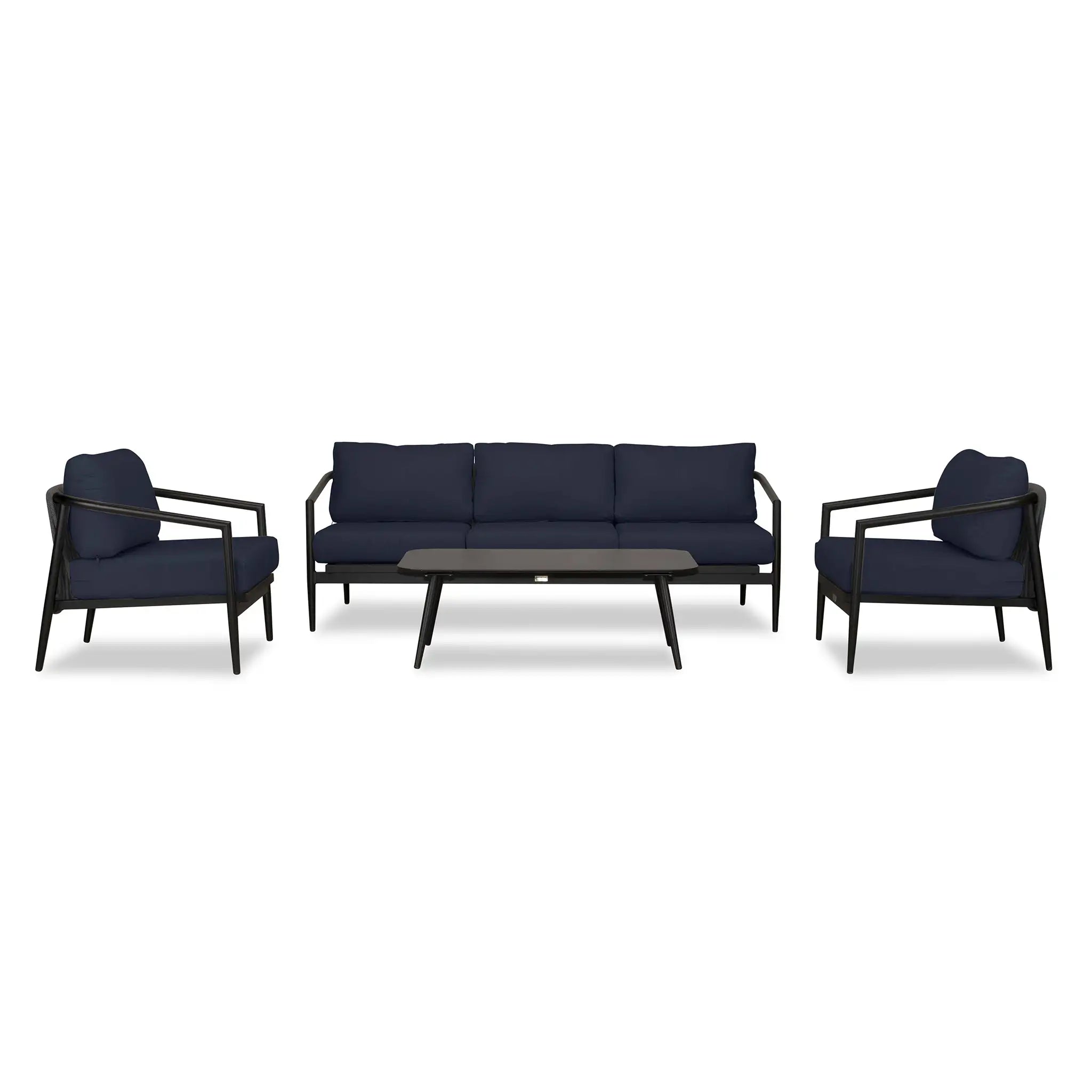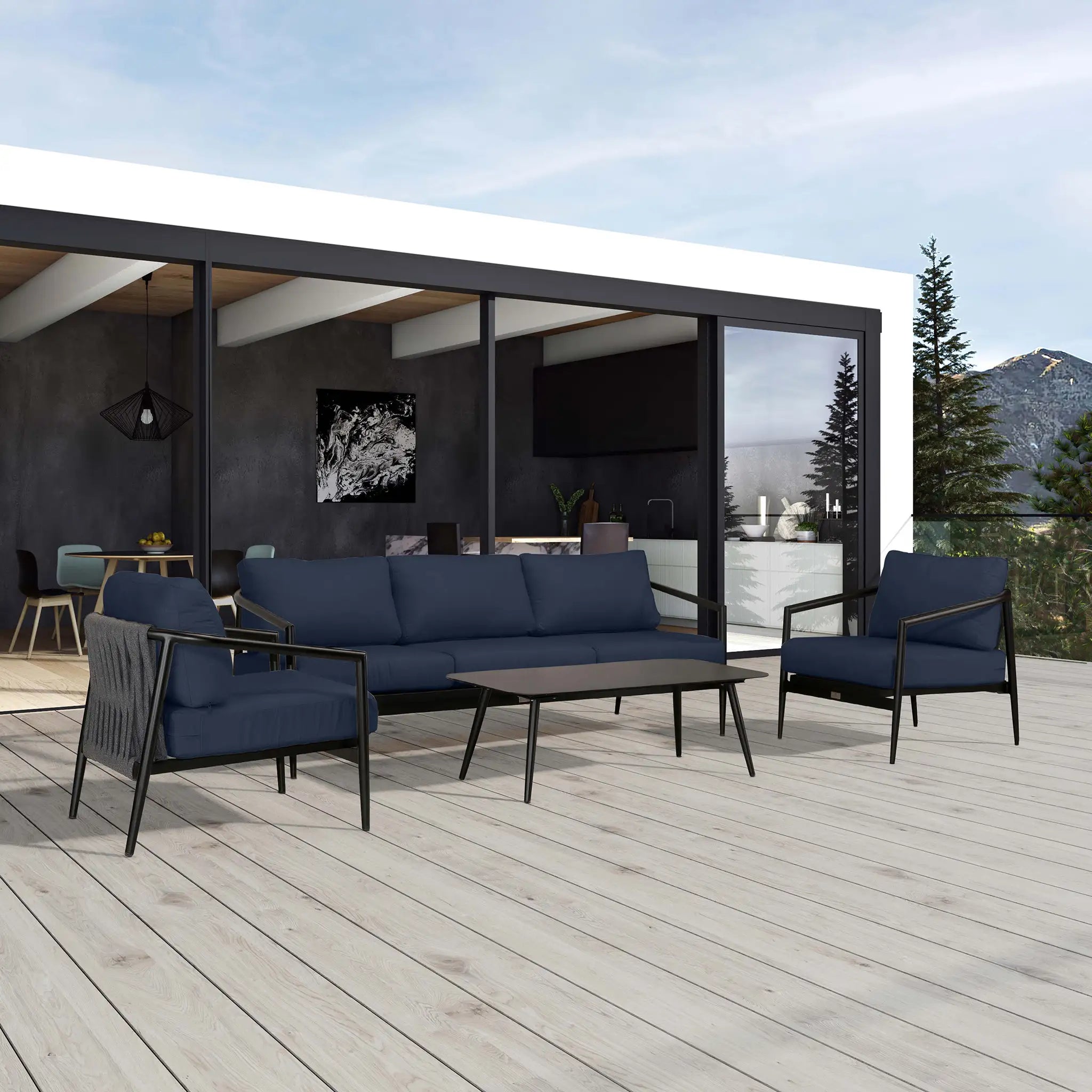 Complementing the seating arrangement is a sleek, aluminum coffee table, which offers a sturdy and modern surface for drinks, decor, or entertaining essentials. Its low-maintenance design makes it a perfect addition to the overall set, seamlessly tying together the elegant and functional aesthetic of the Olio collection.