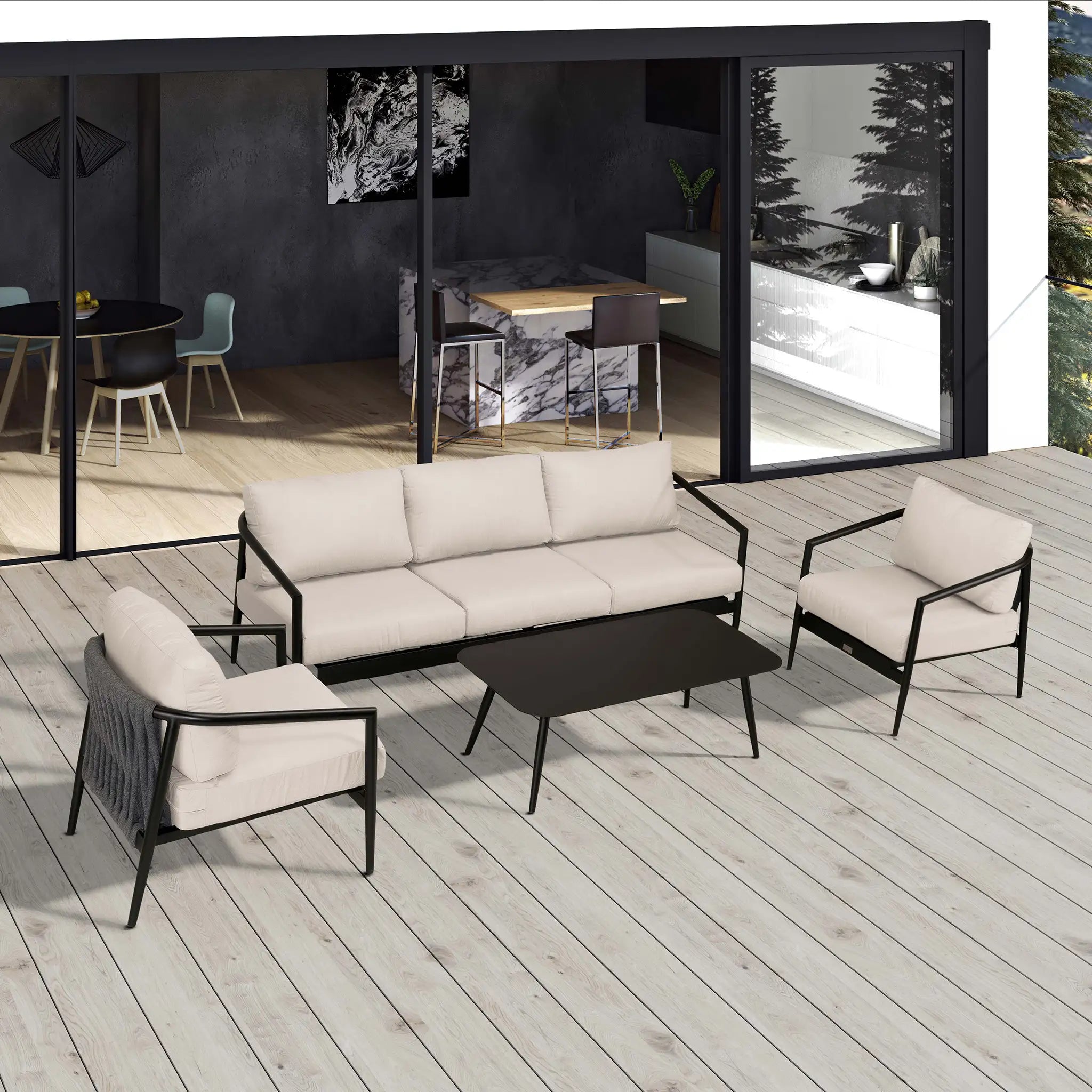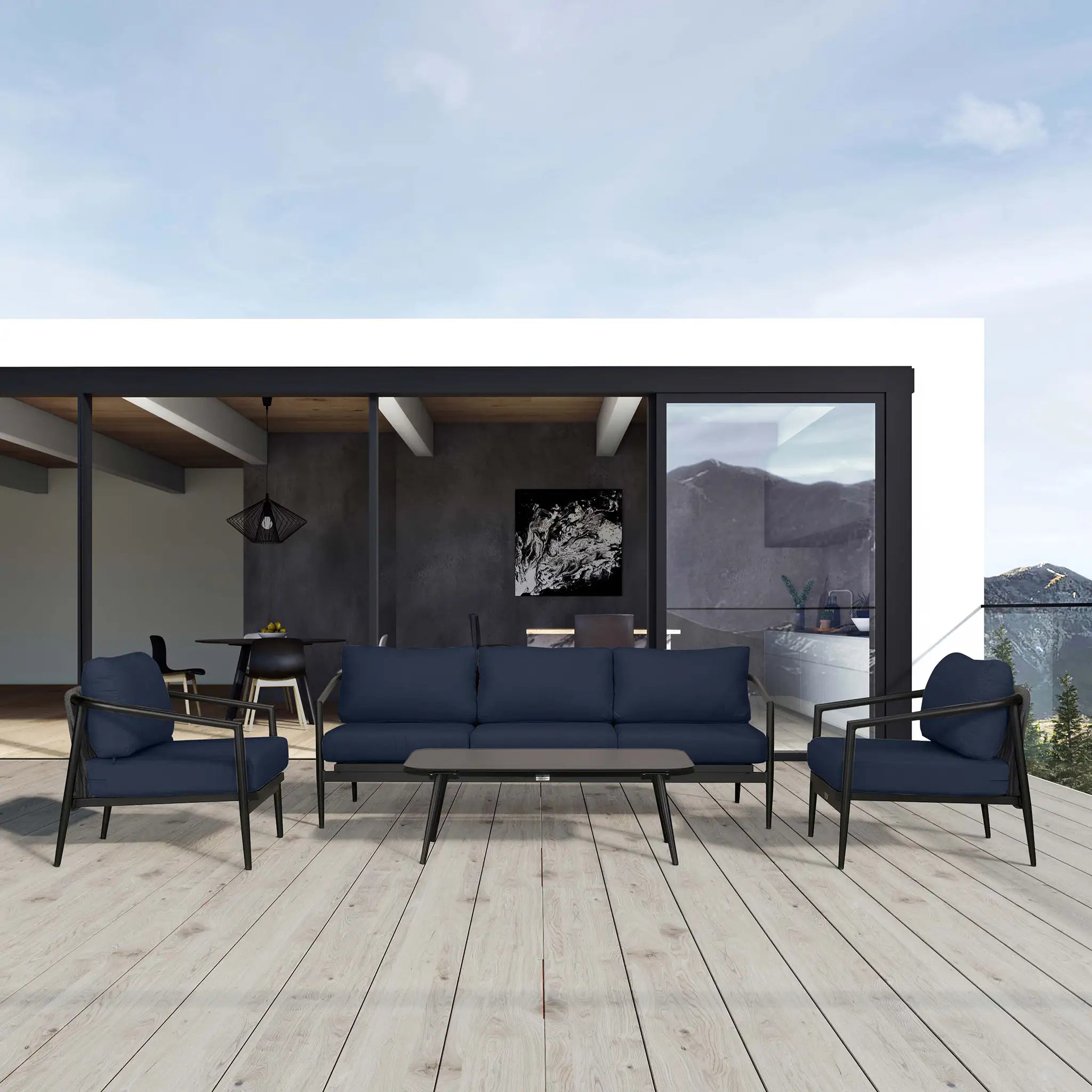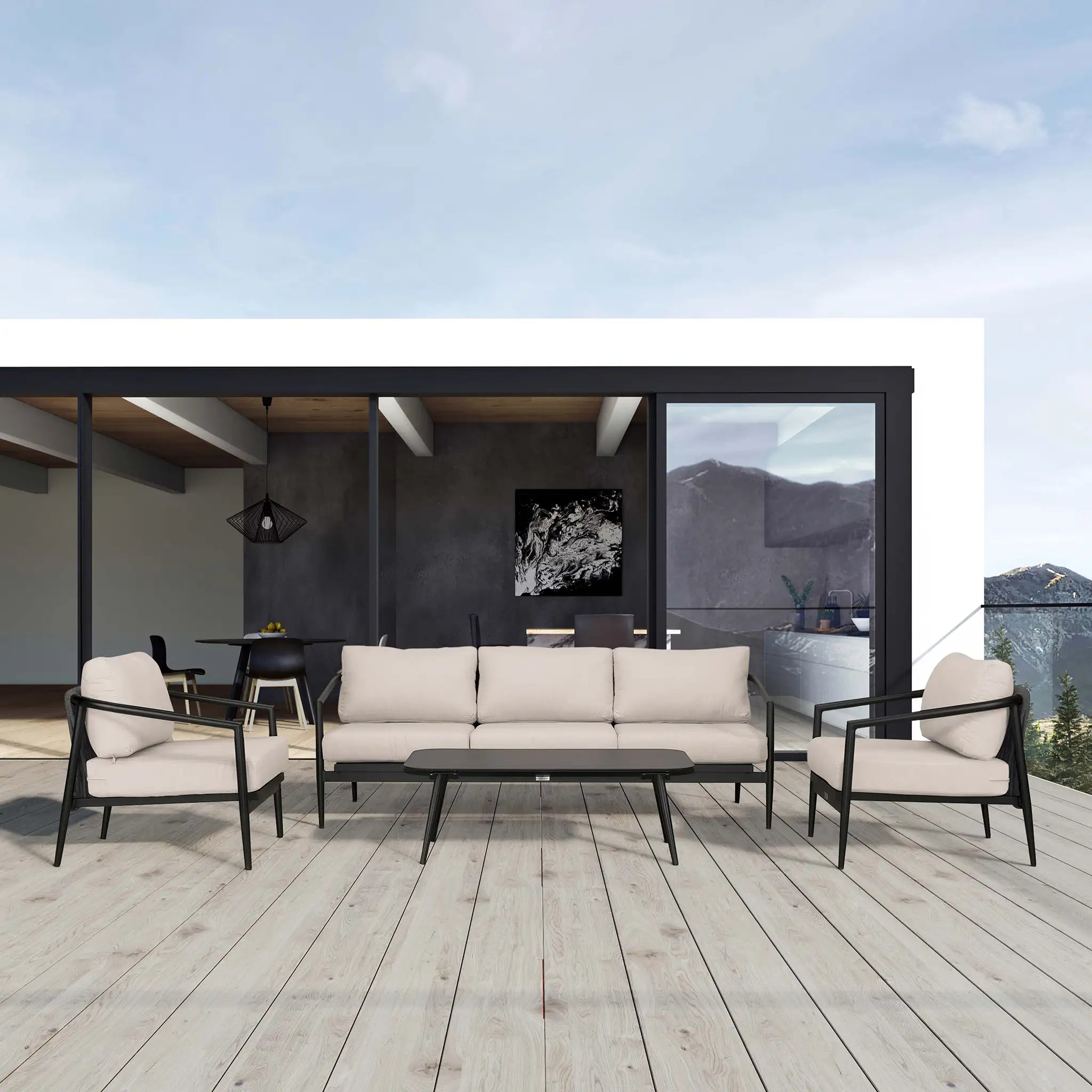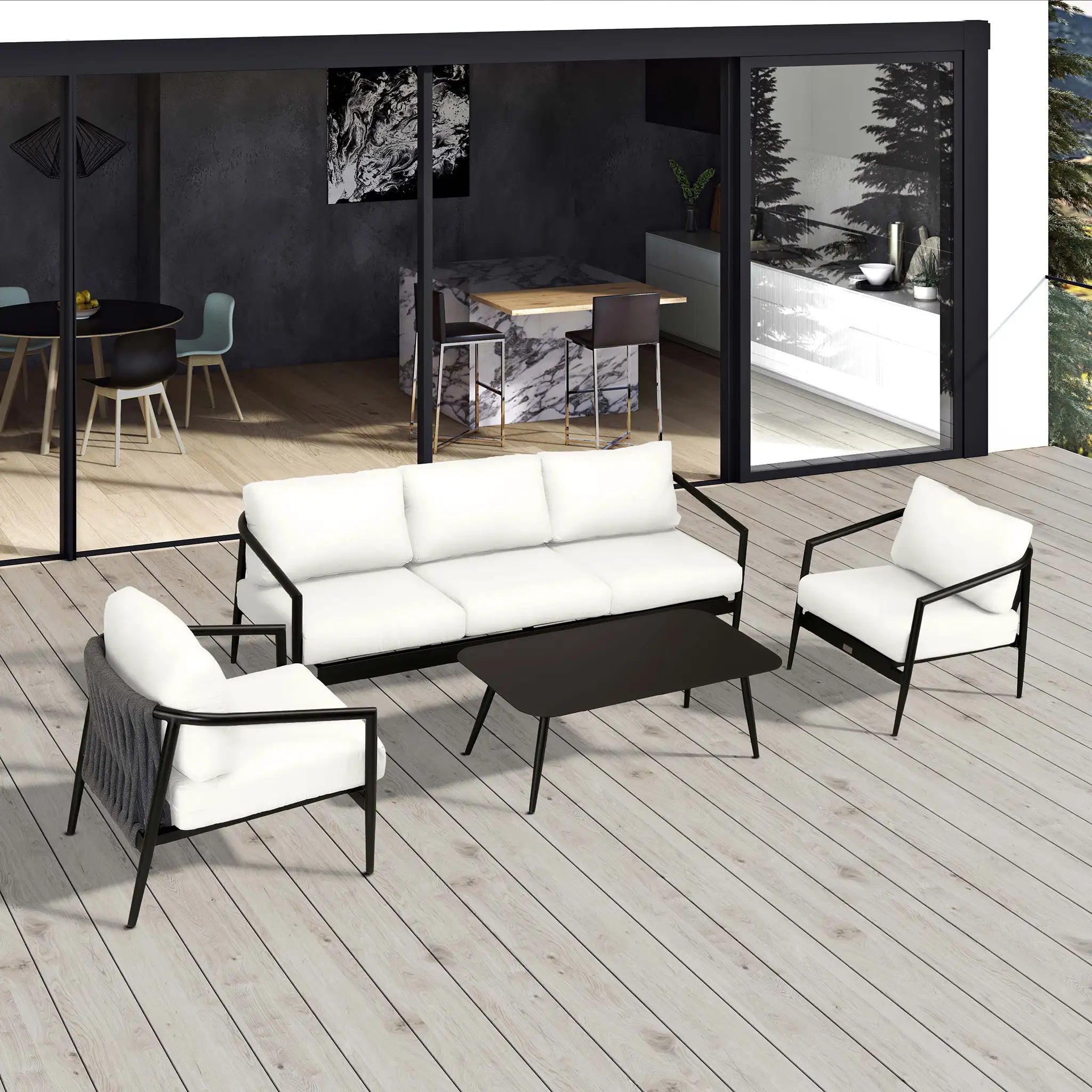 Complementing the seating arrangement is a sleek, aluminum coffee table, which offers a sturdy and modern surface for drinks, decor, or entertaining essentials. Its low-maintenance design makes it a perfect addition to the overall set, seamlessly tying together the elegant and functional aesthetic of the Olio collection.