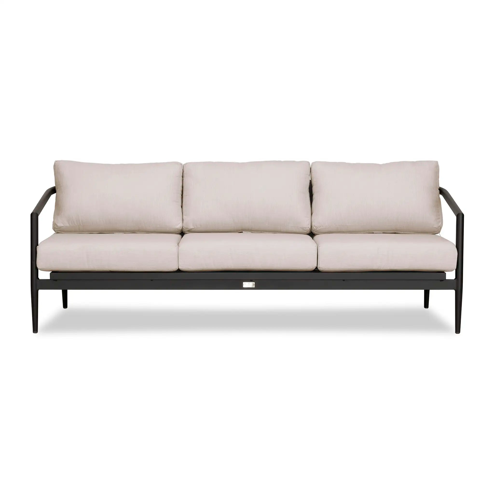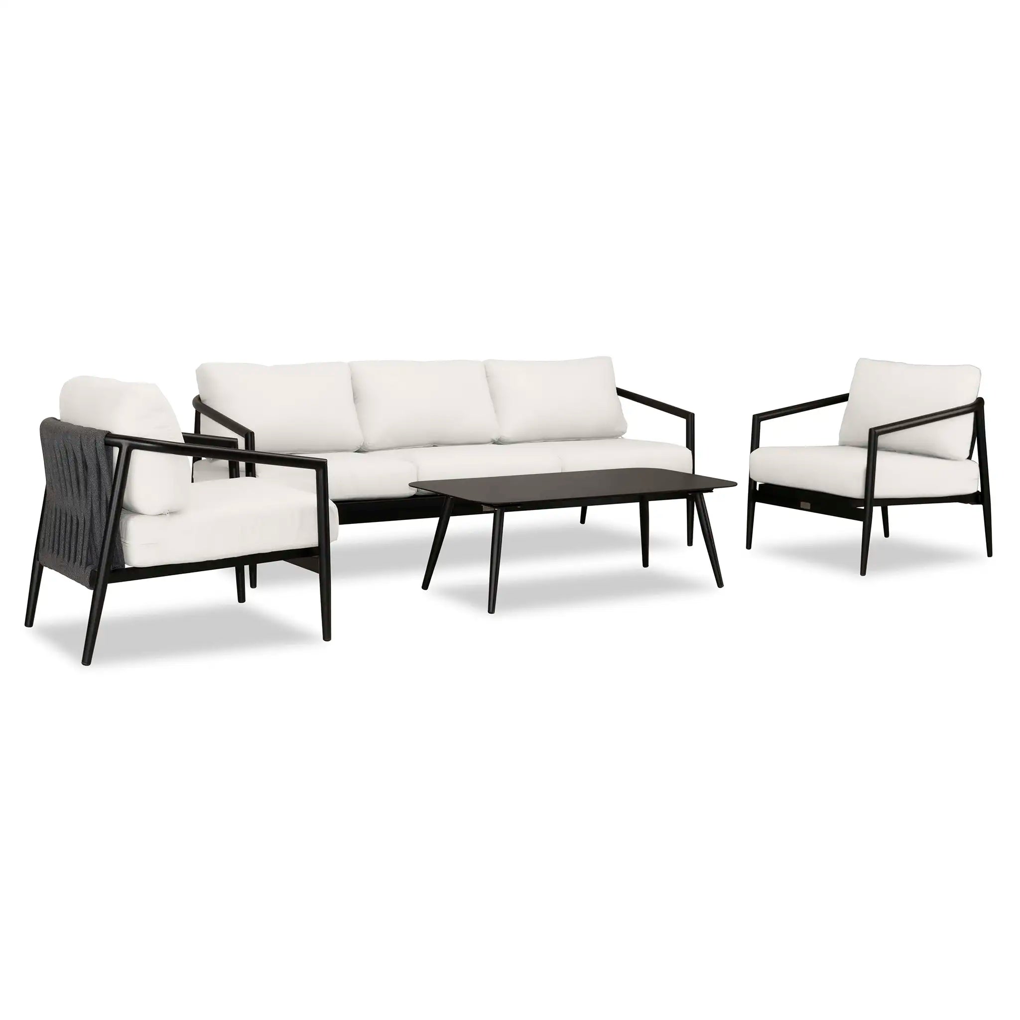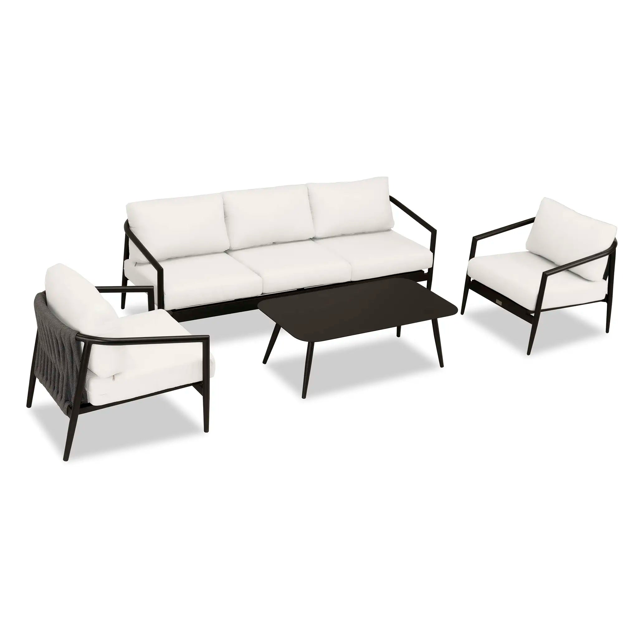 The Harmonia Living Olio 4 Piece Aluminum Sofa Set - Black/Carbon seamlessly blends Mid-Century Modern design with premium outdoor materials, offering a stylish and durable seating solution for your patio or backyard. With its tapered legs, gentle curves, and intricate roped back, this collection captures a timeless sophistication while remaining practical and comfortable for everyday outdoor living. Designed to be compact in footprint yet spacious in seating, the Olio collection ensures that you can enjoy deep-seating luxury without taking up excessive space.