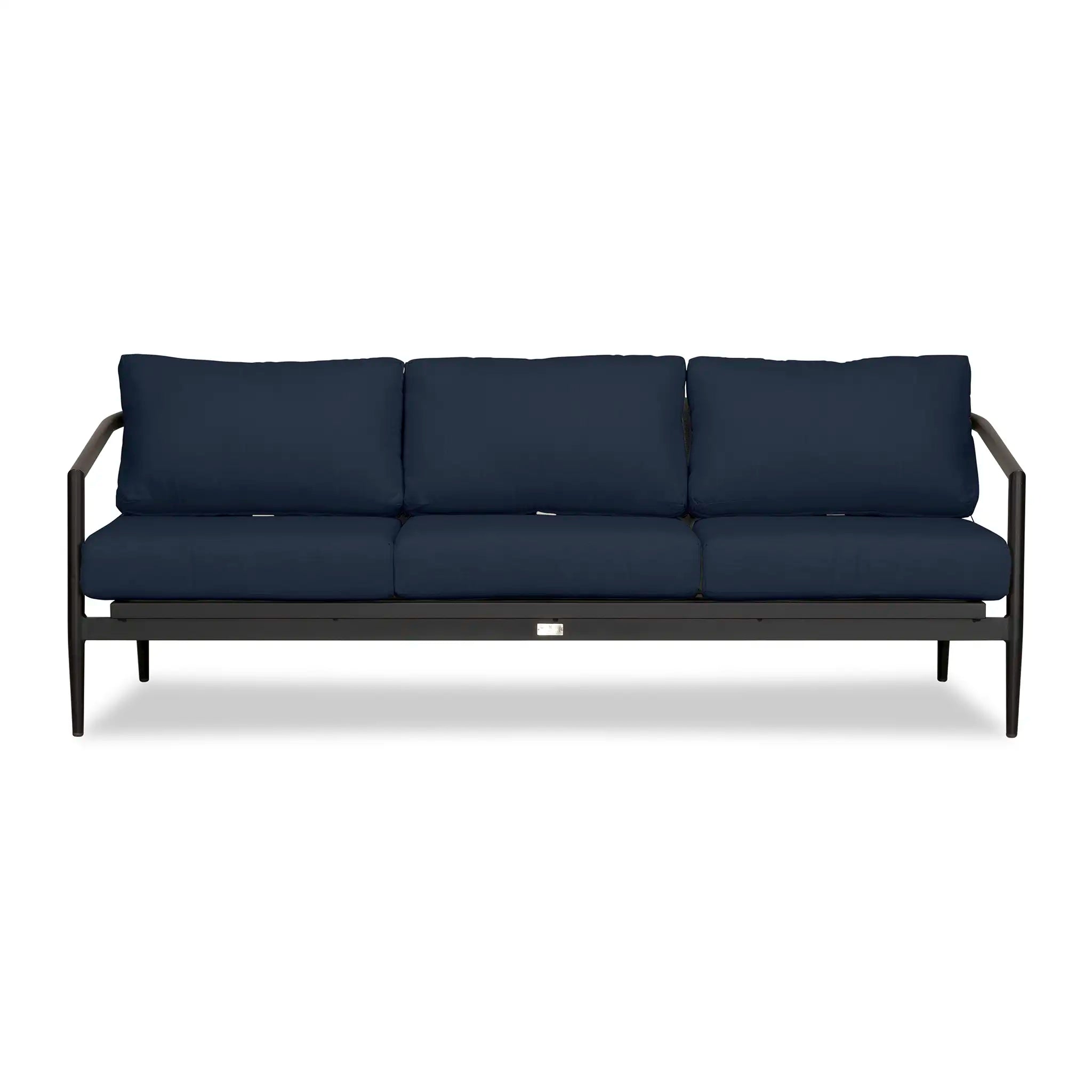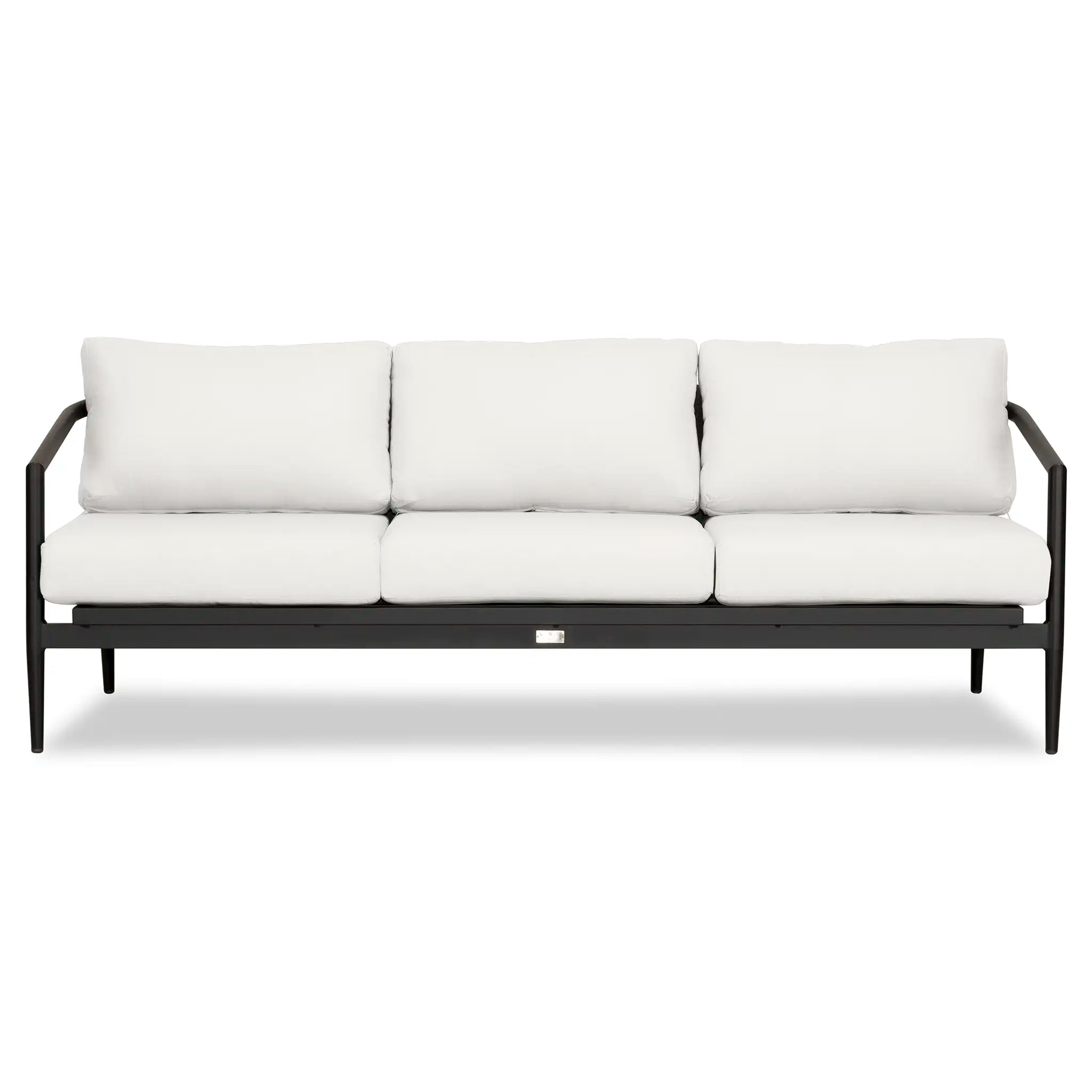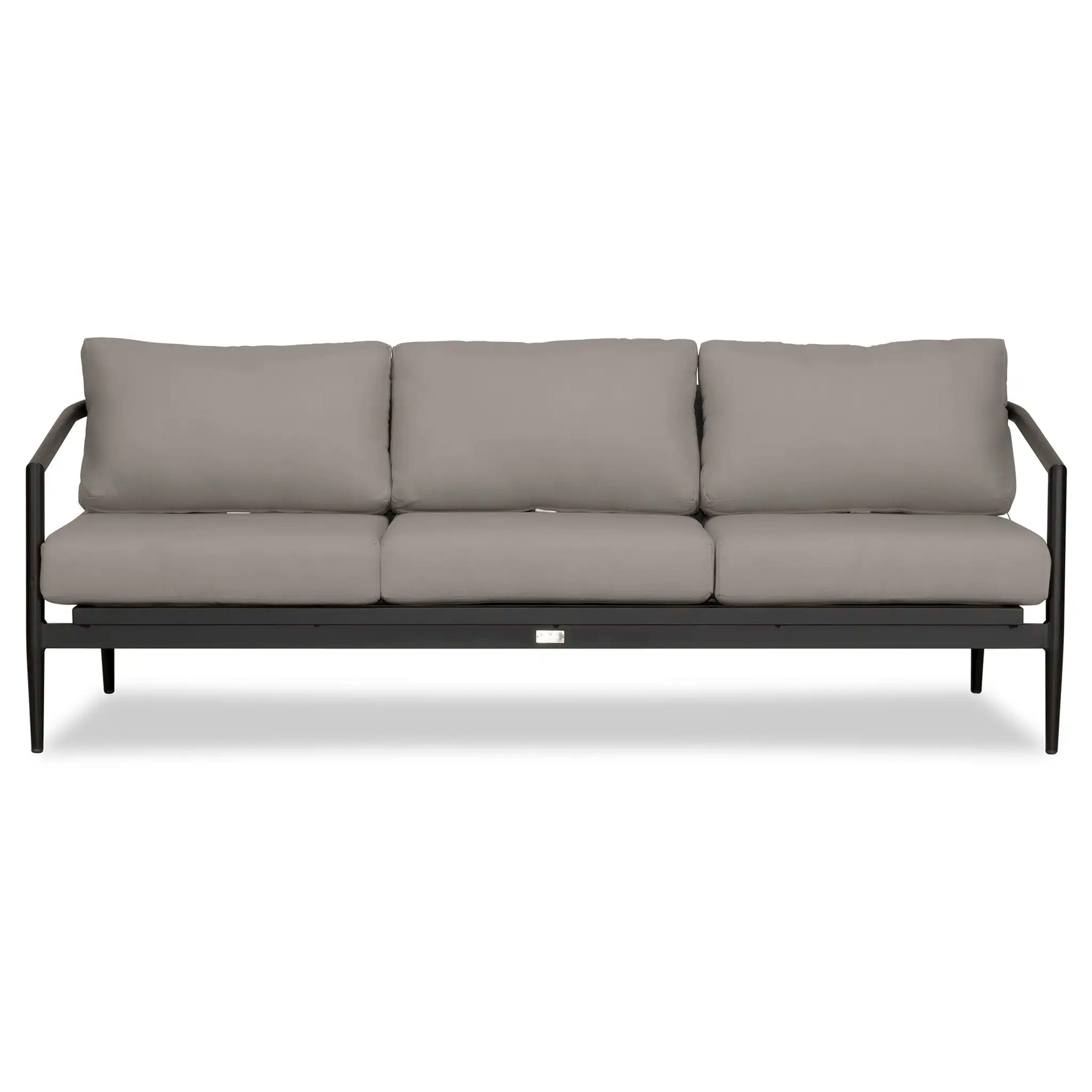 The Harmonia Living Olio 4 Piece Aluminum Sofa Set - Black/Carbon seamlessly blends Mid-Century Modern design with premium outdoor materials, offering a stylish and durable seating solution for your patio or backyard. With its tapered legs, gentle curves, and intricate roped back, this collection captures a timeless sophistication while remaining practical and comfortable for everyday outdoor living. Designed to be compact in footprint yet spacious in seating, the Olio collection ensures that you can enjoy deep-seating luxury without taking up excessive space.