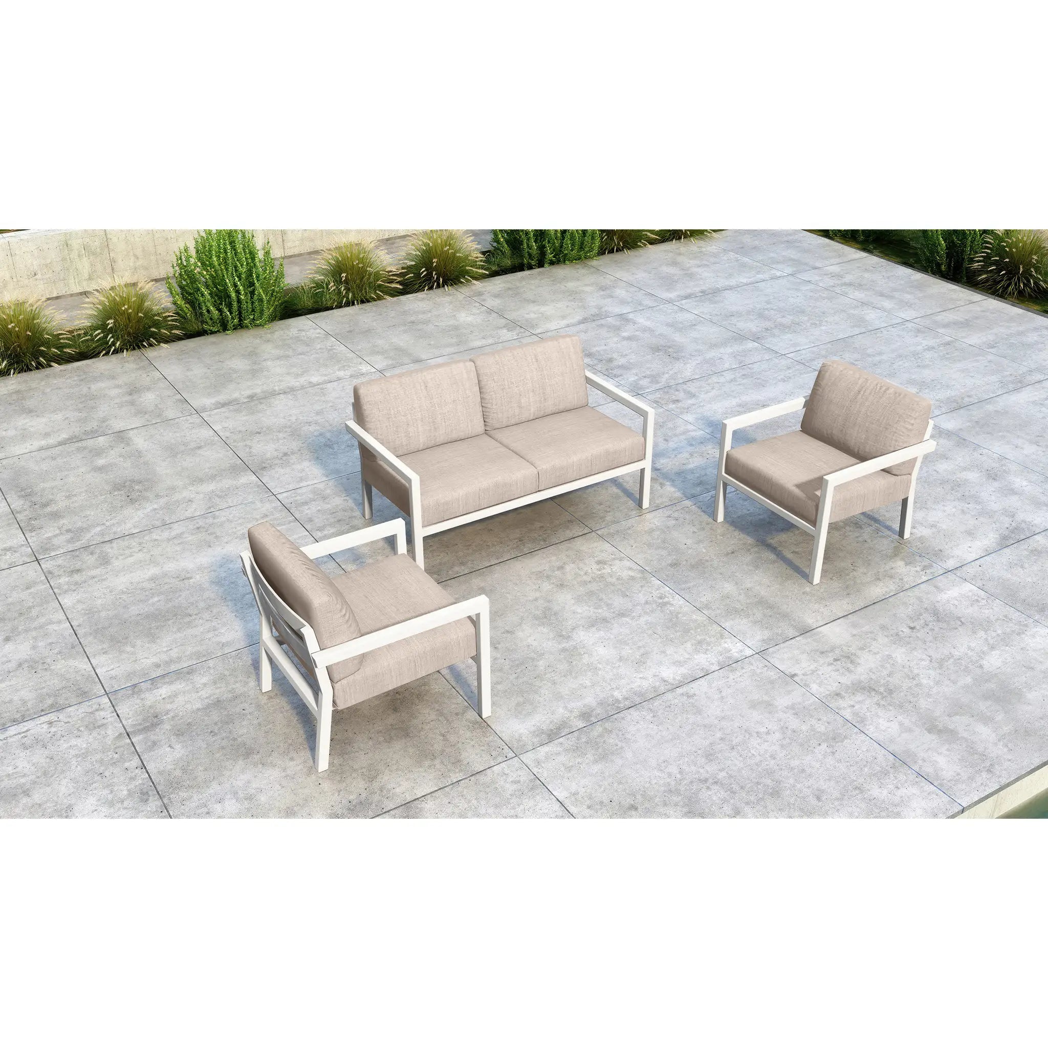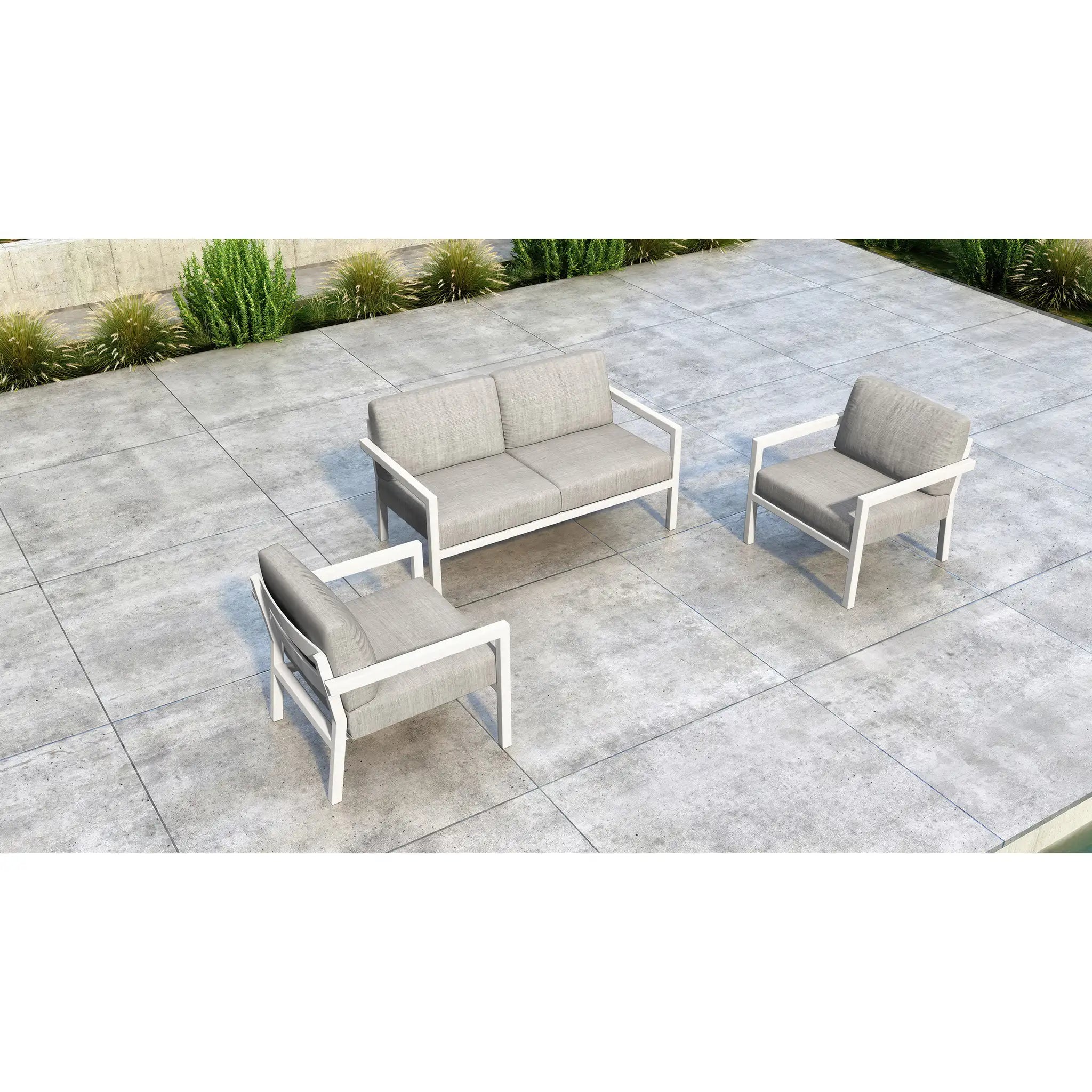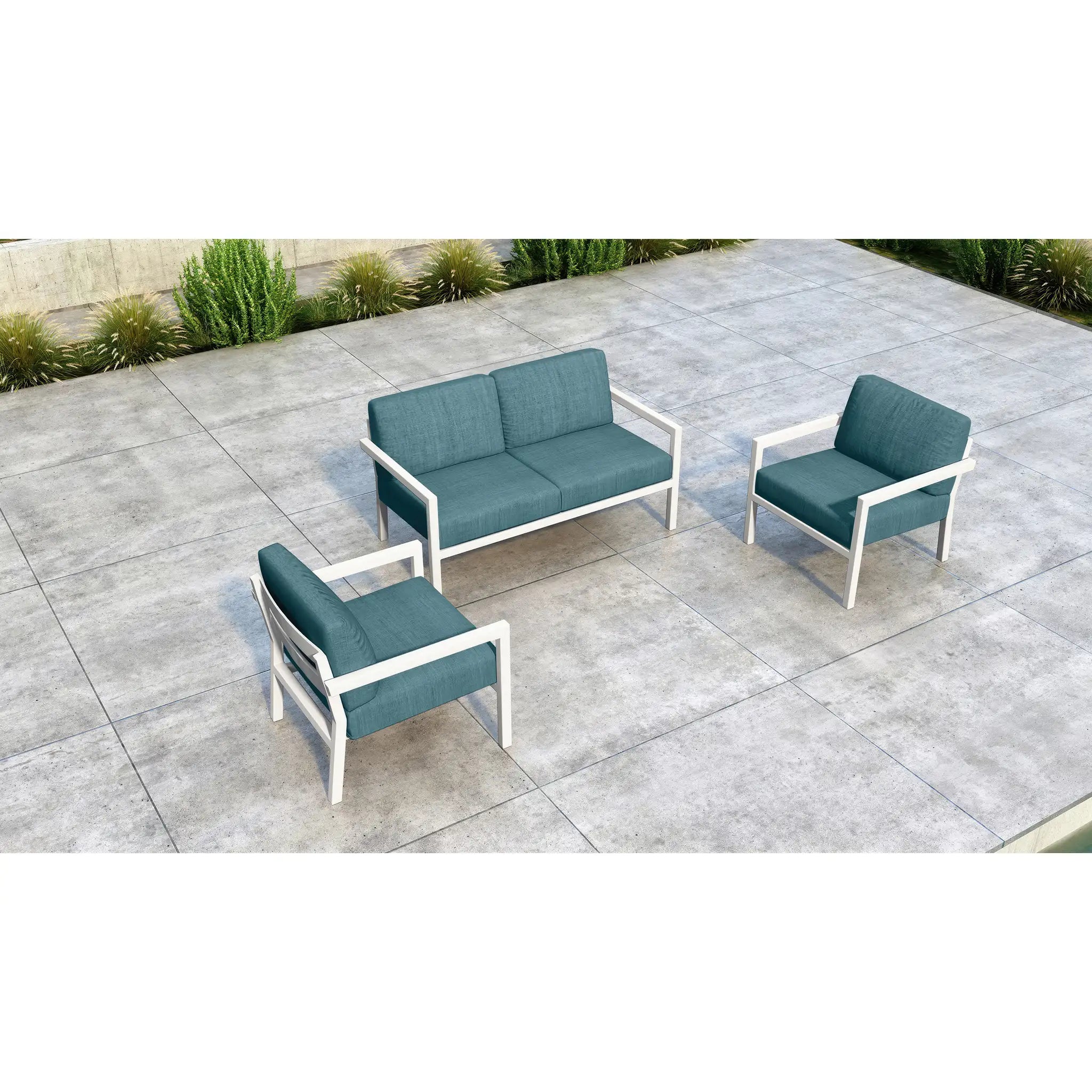 The Harmonia Living Pacifica 3 Piece Aluminum Loveseat Set - White offers a perfect blend of modern elegance and everyday comfort, making it an ideal addition to any outdoor retreat. Designed with clean lines, gentle angles, and plush cushions, this set enhances both spacious patios and cozy balconies, bringing a relaxed yet sophisticated atmosphere to your outdoor living area. Whether you're enjoying quiet mornings with a cup of coffee or entertaining guests under the stars, the Pacifica Loveseat Set provides the perfect balance of style and functionality.