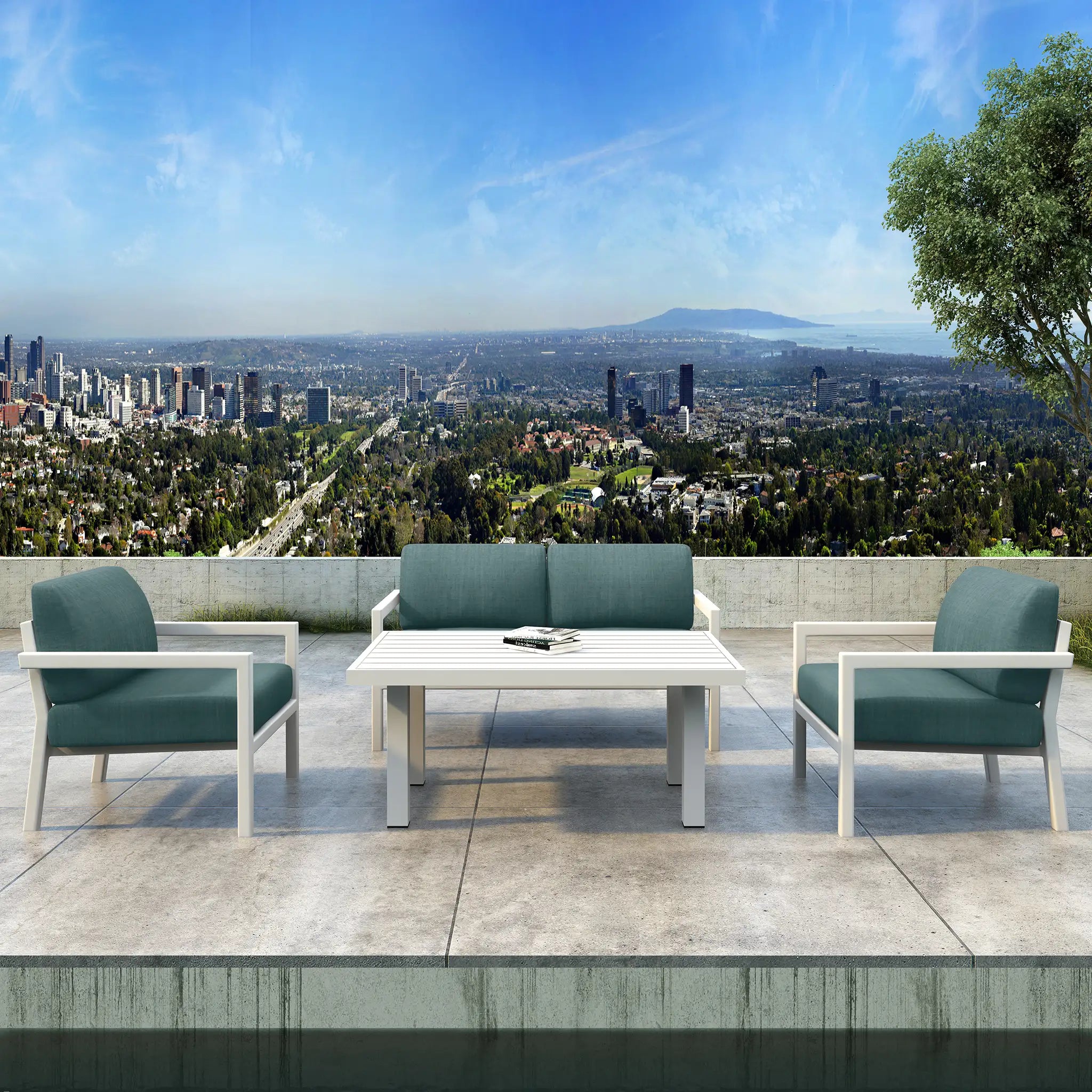 The Classic Aluminum coffee table serves as the perfect centerpiece, blending sleek lines with a modern slat-style tabletop. Its versatile design complements a variety of outdoor aesthetics, from coastal retreats to urban rooftops.
