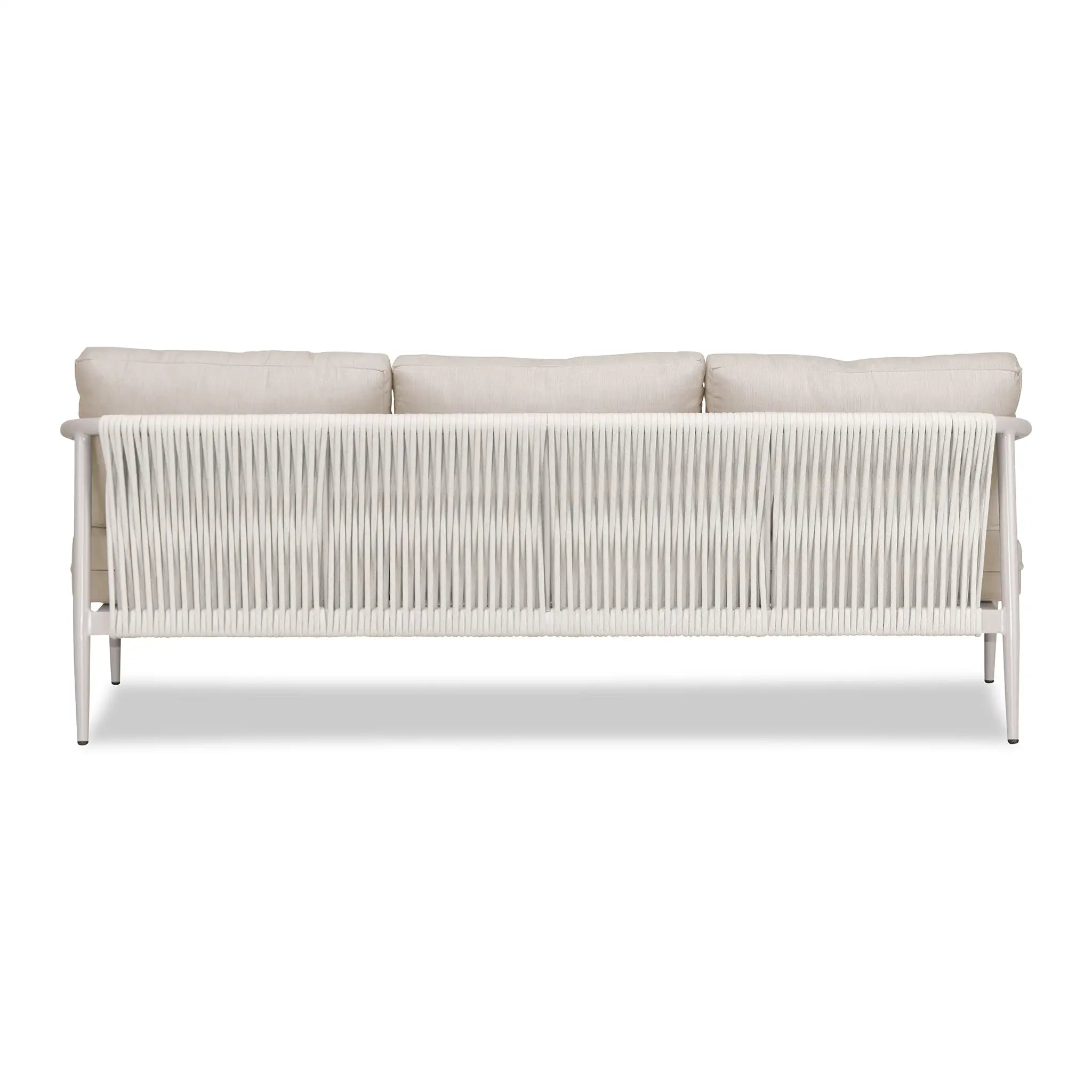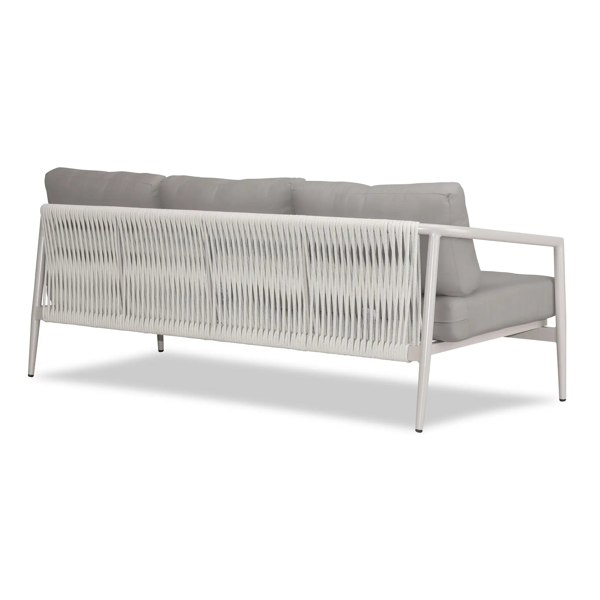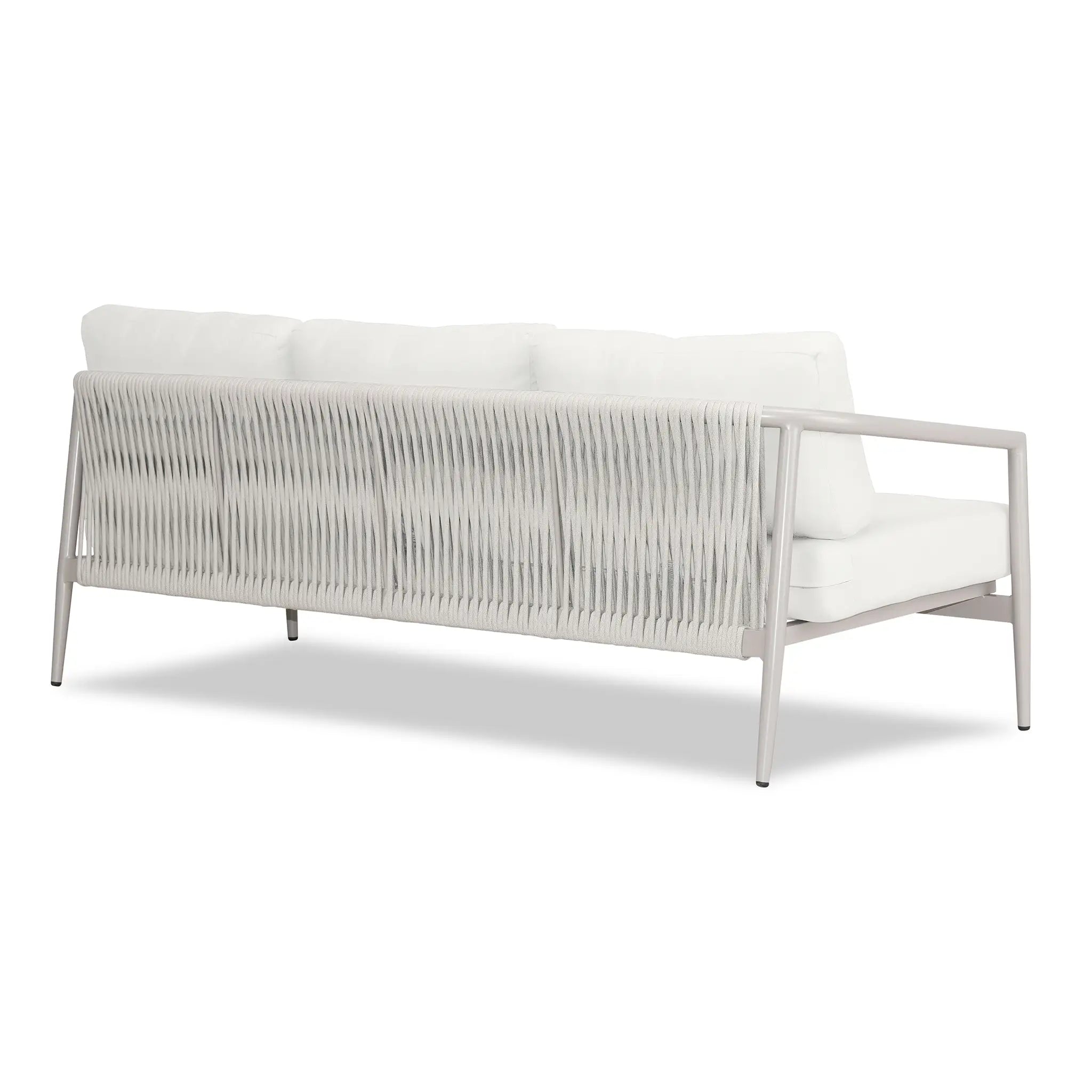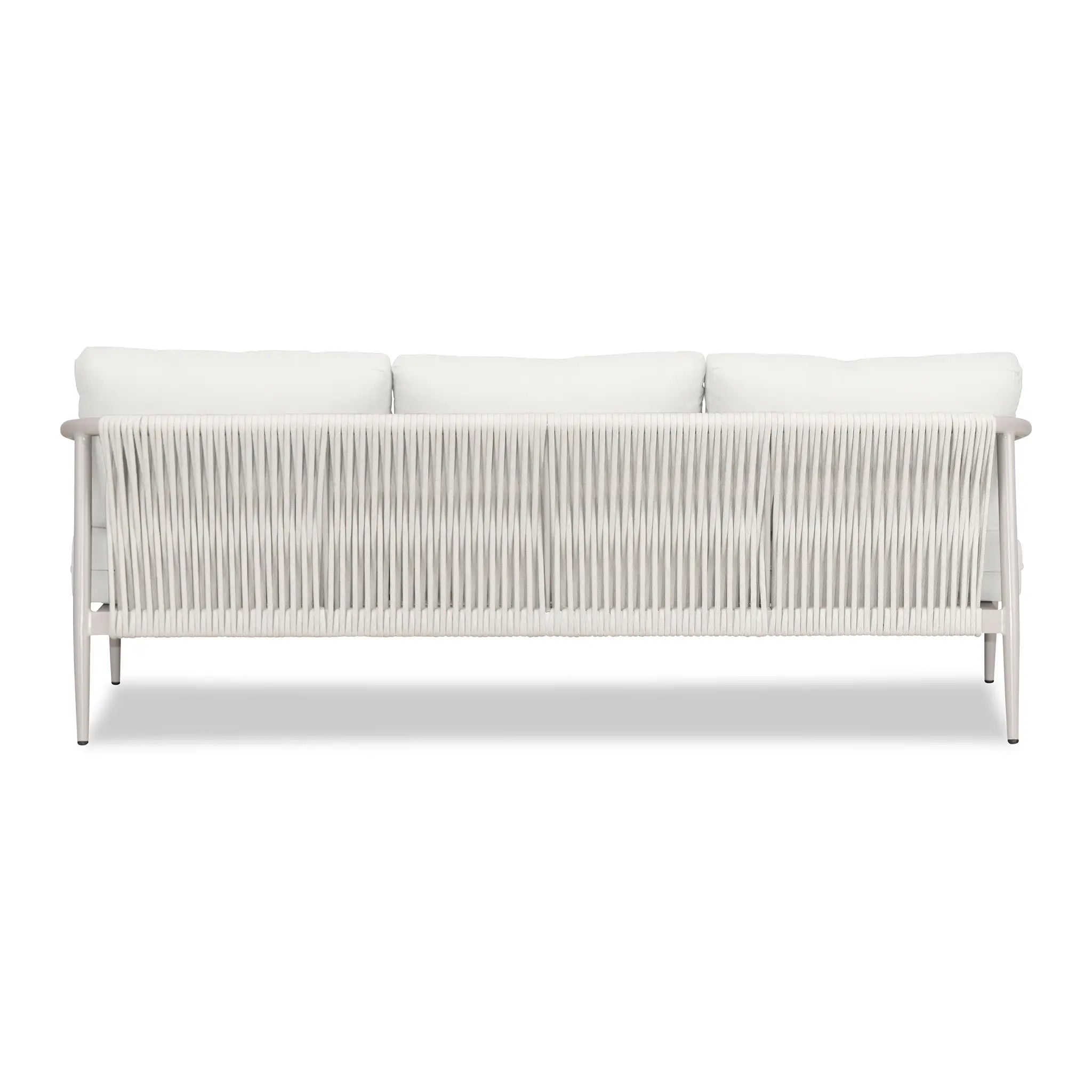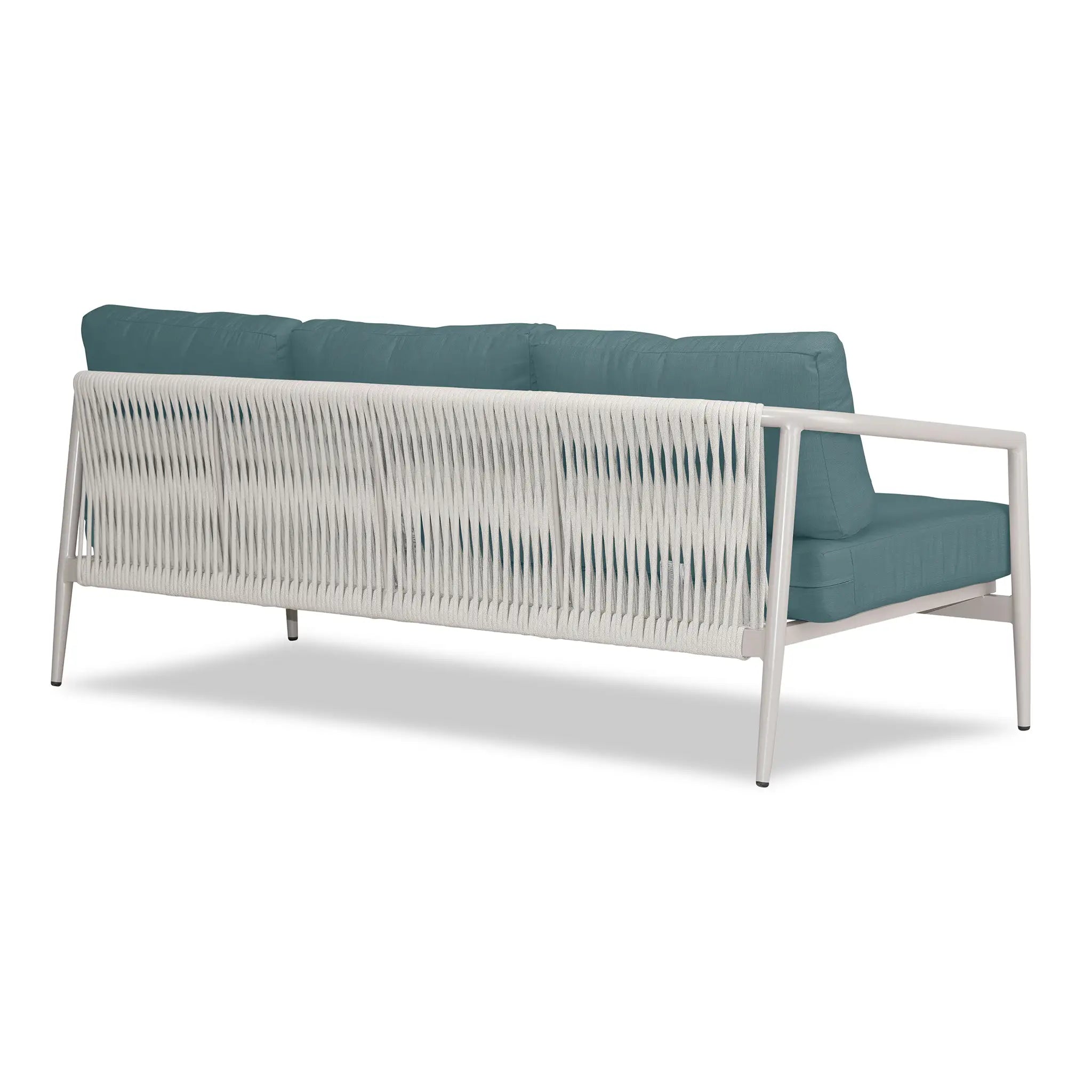 With a mixture of elegant materials, the Harmonia Living Olio Aluminum Sofa - Urban Stone/Carrera is a Mid-Century Modern design brought to life with Olefin rope. Accented with tapered legs, subtle curves, and an intertwining roped back, the sophisticated silhouette of the Olio collection is a true work of art. Designed with efficiency in mind, it features a compact footprint while still offering full-sized deep seating comfort.