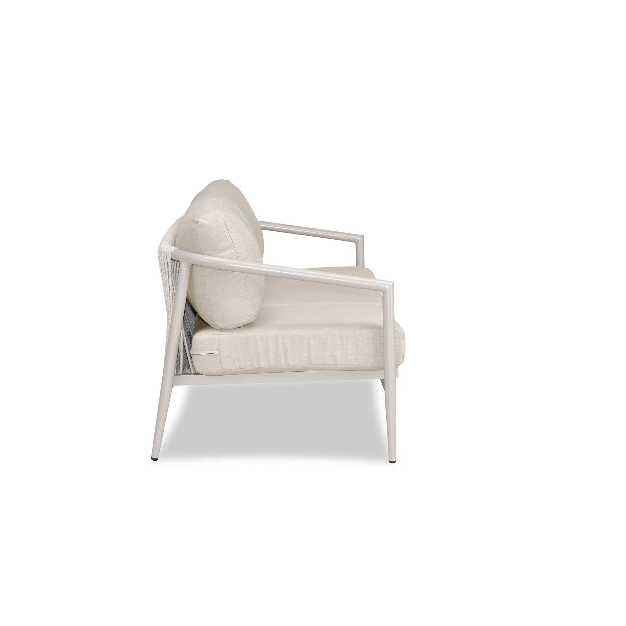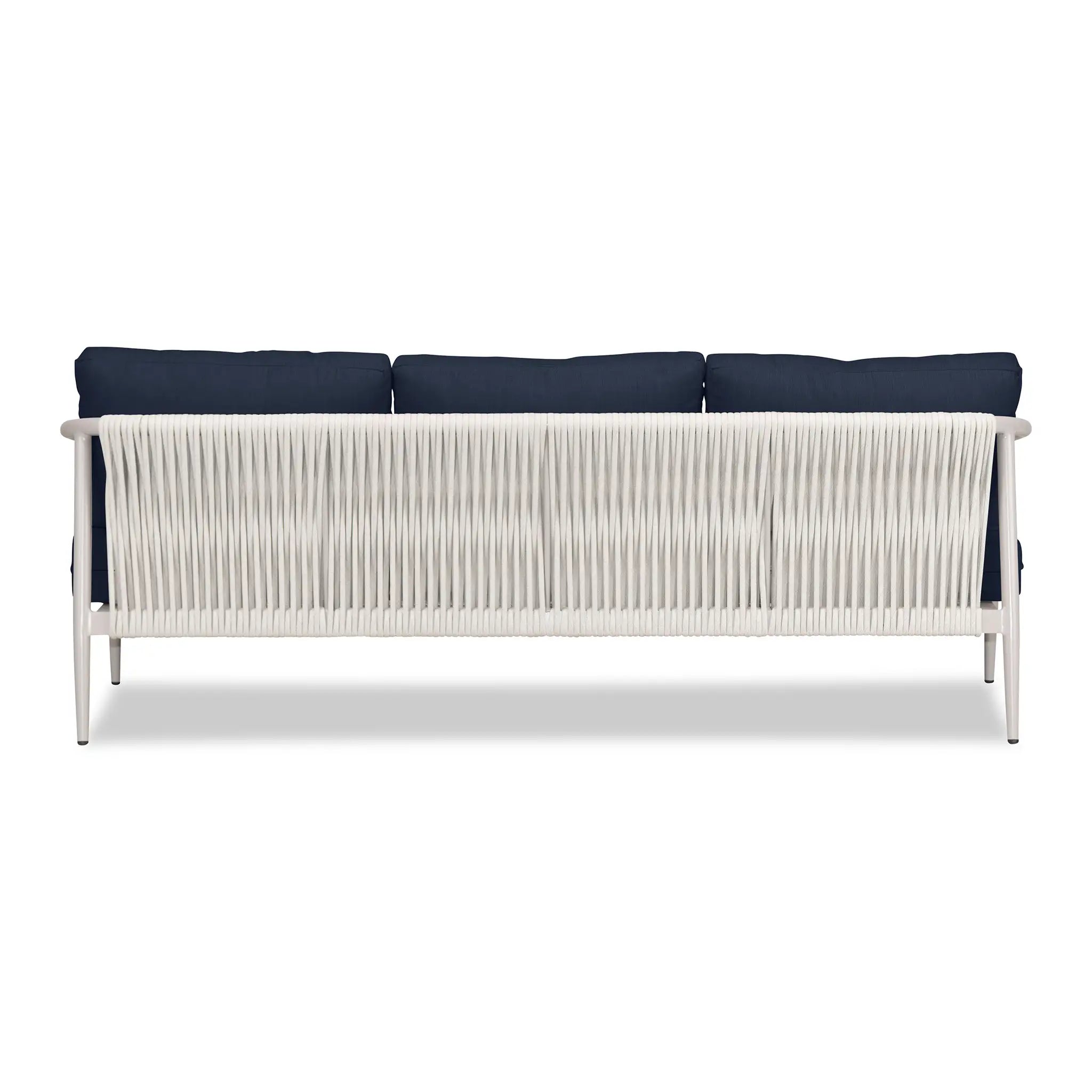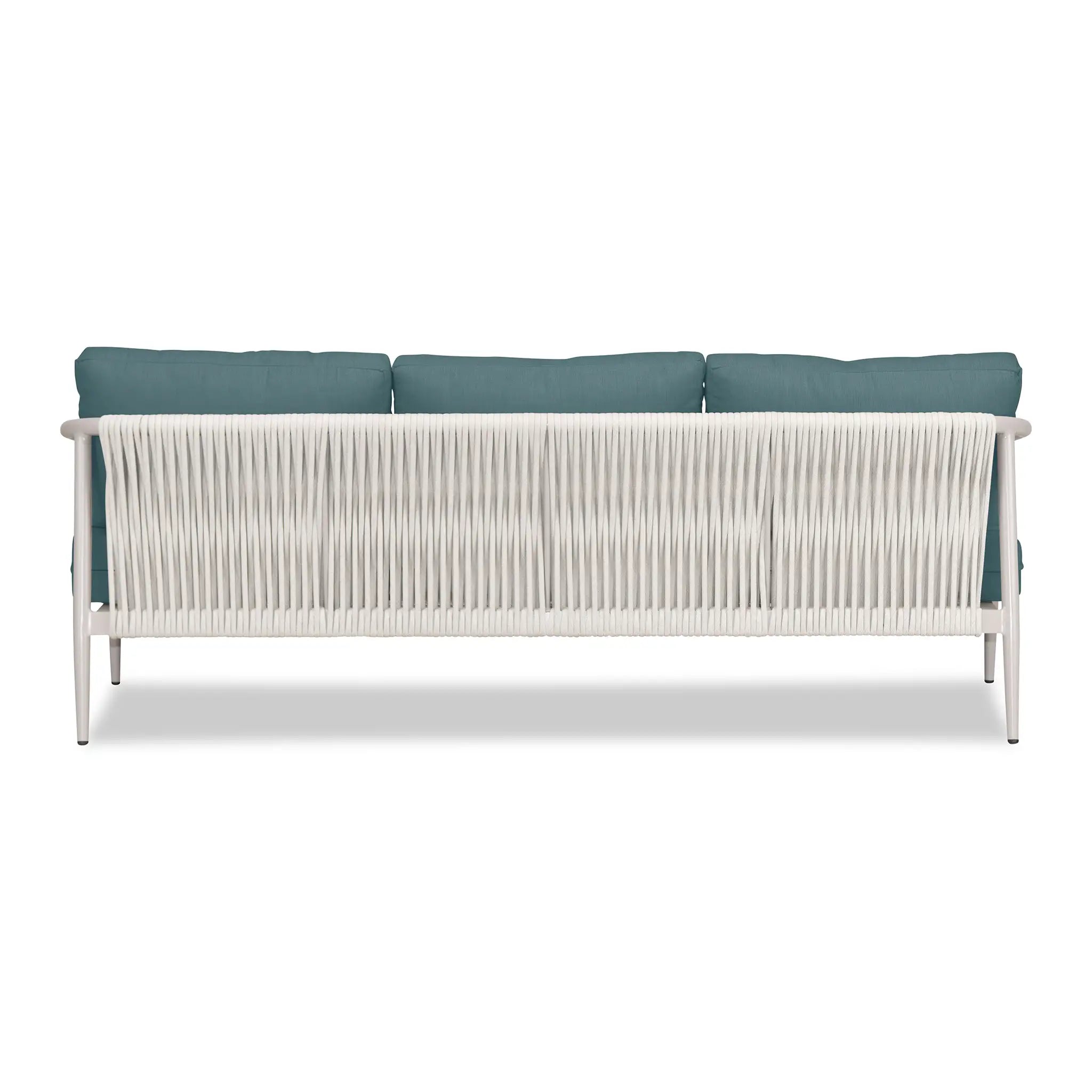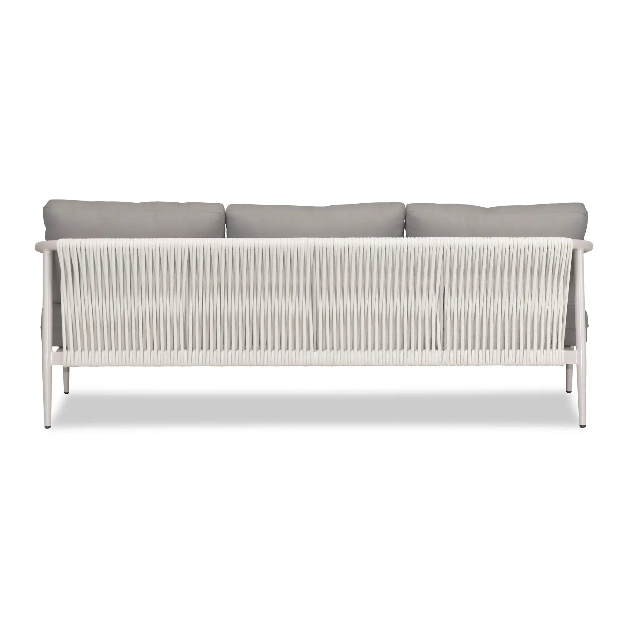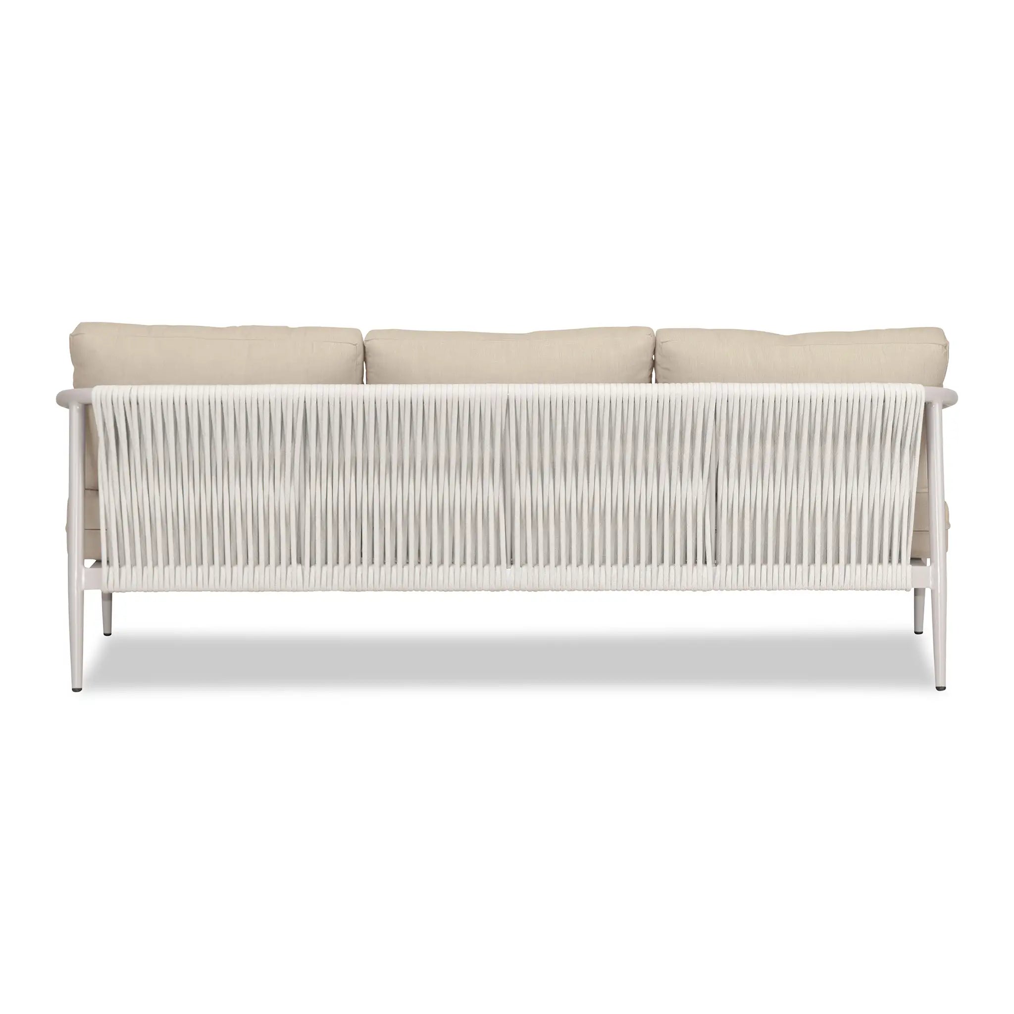 With a mixture of elegant materials, the Harmonia Living Olio Aluminum Sofa - Urban Stone/Carrera is a Mid-Century Modern design brought to life with Olefin rope. Accented with tapered legs, subtle curves, and an intertwining roped back, the sophisticated silhouette of the Olio collection is a true work of art. Designed with efficiency in mind, it features a compact footprint while still offering full-sized deep seating comfort.