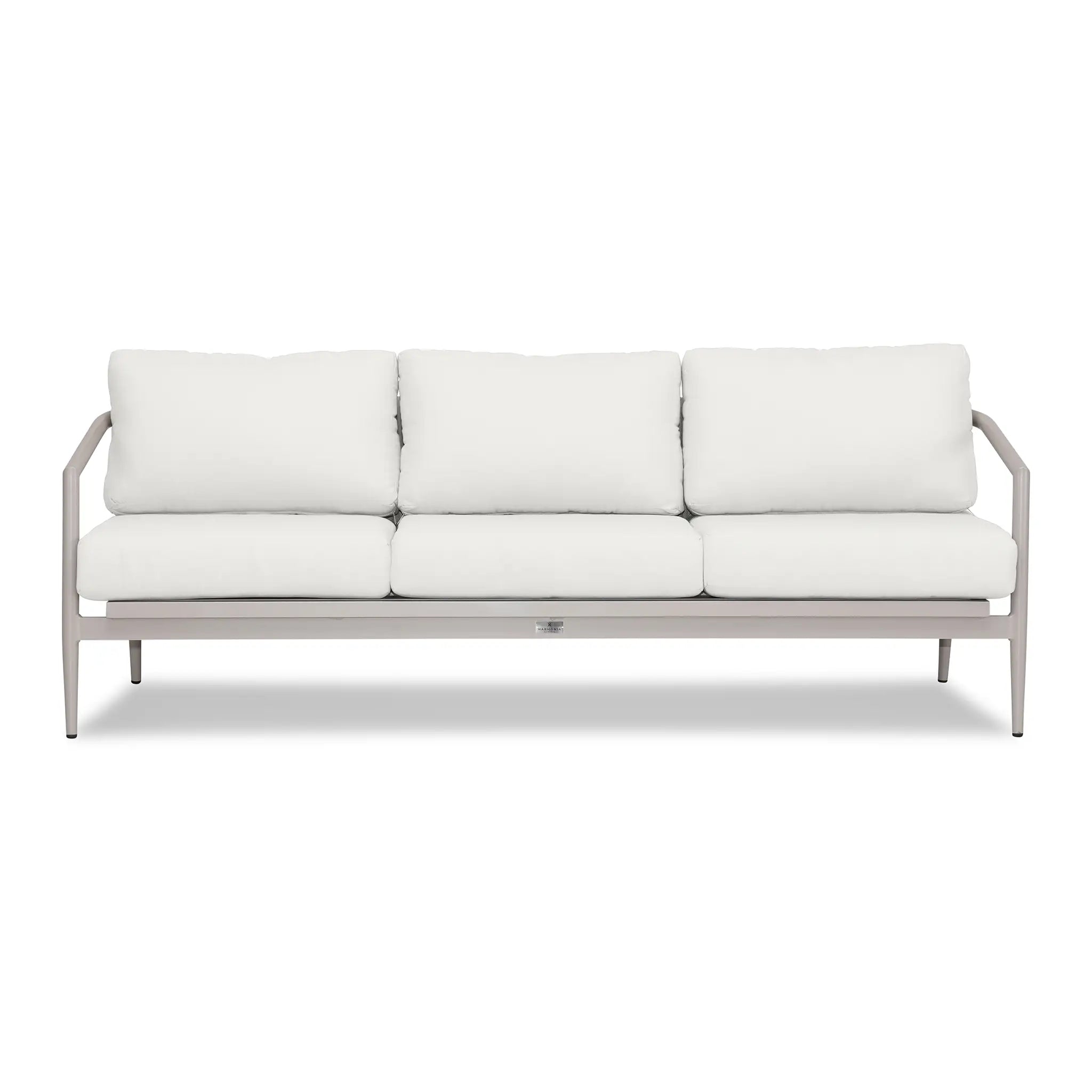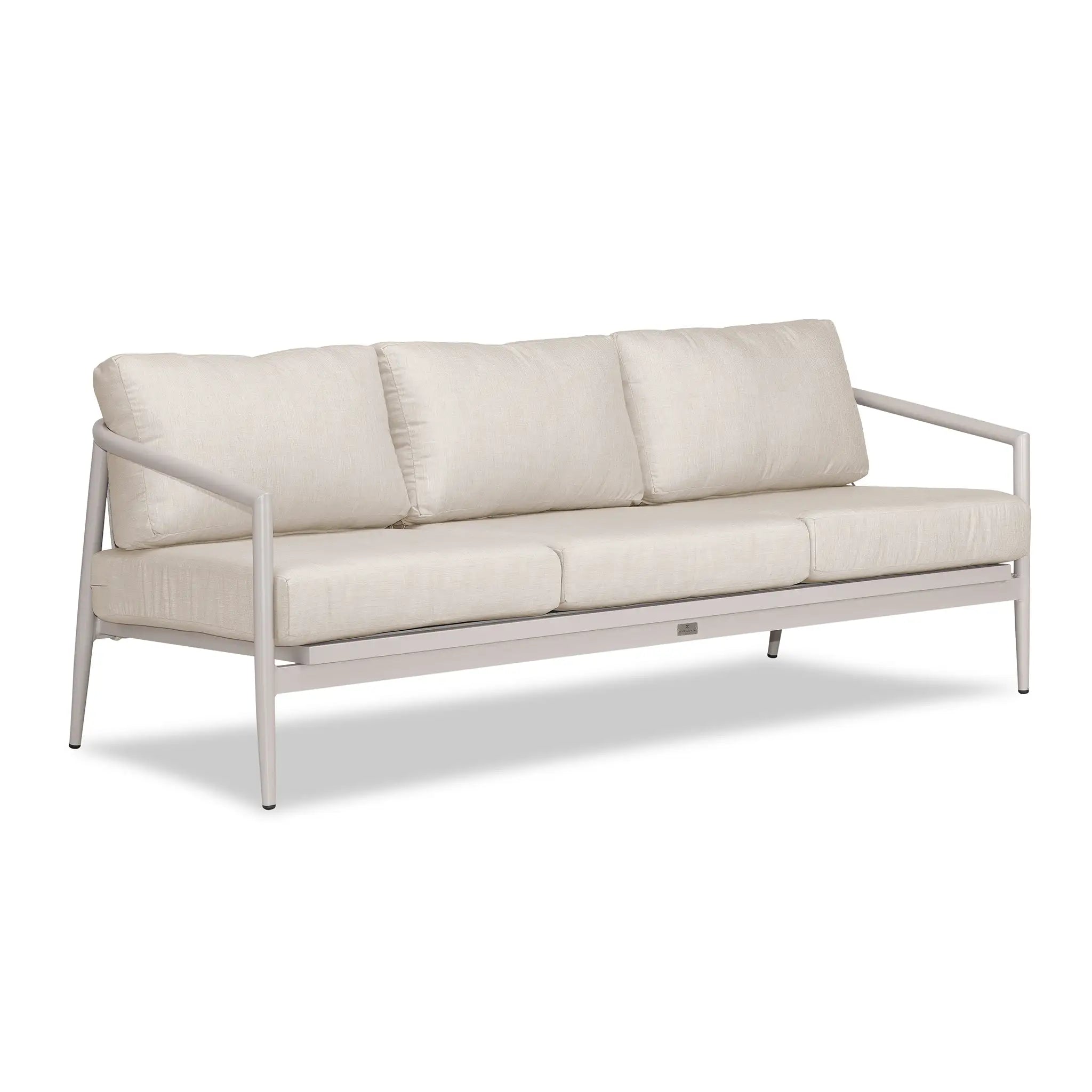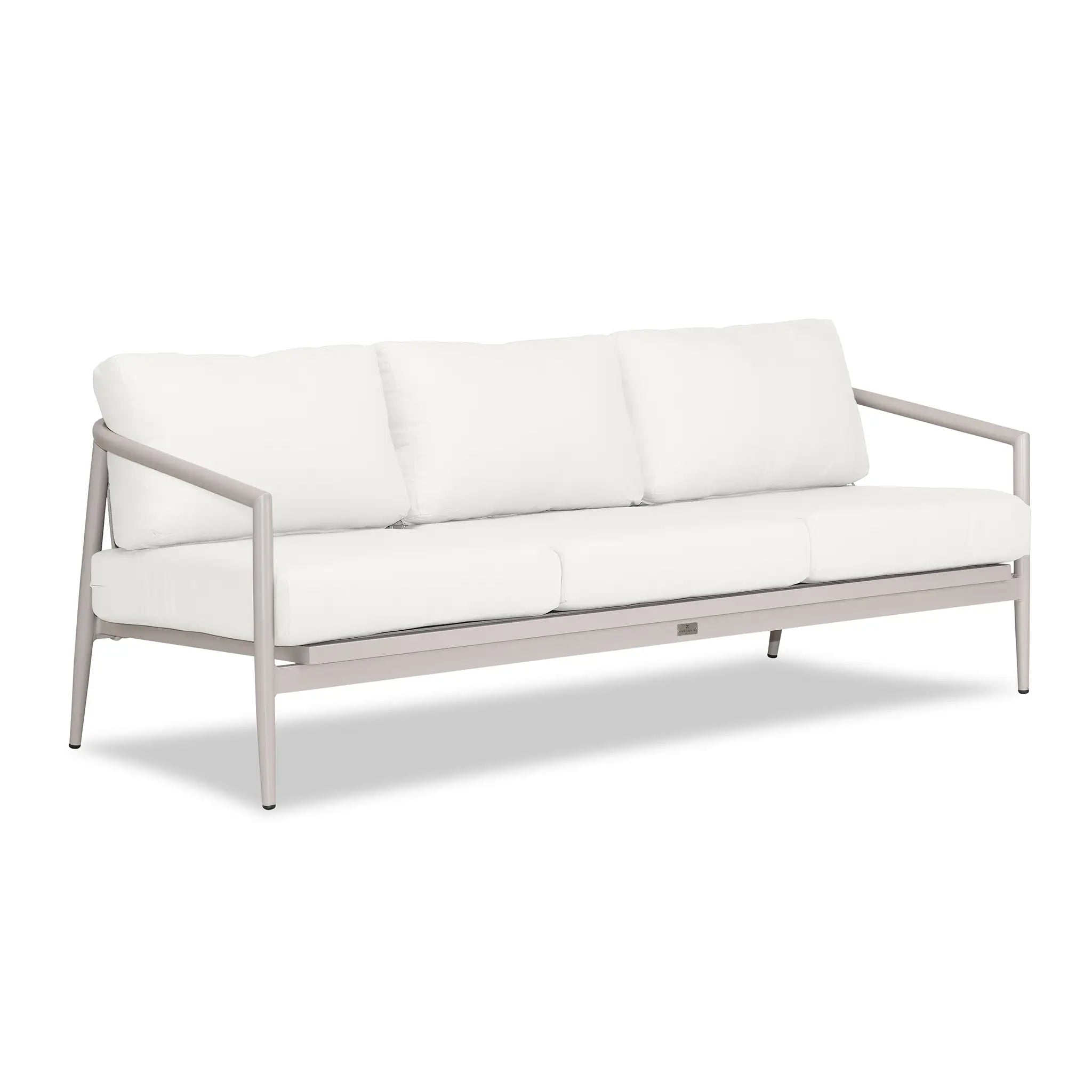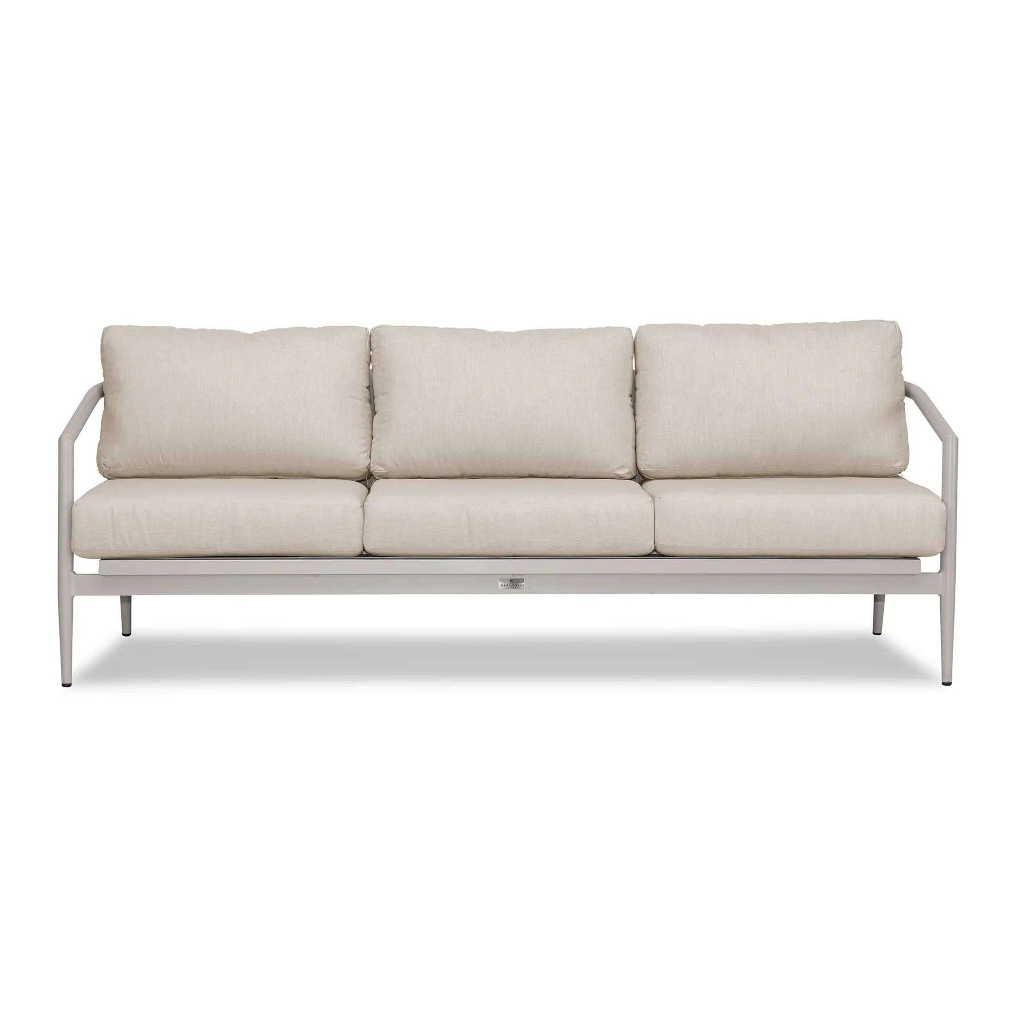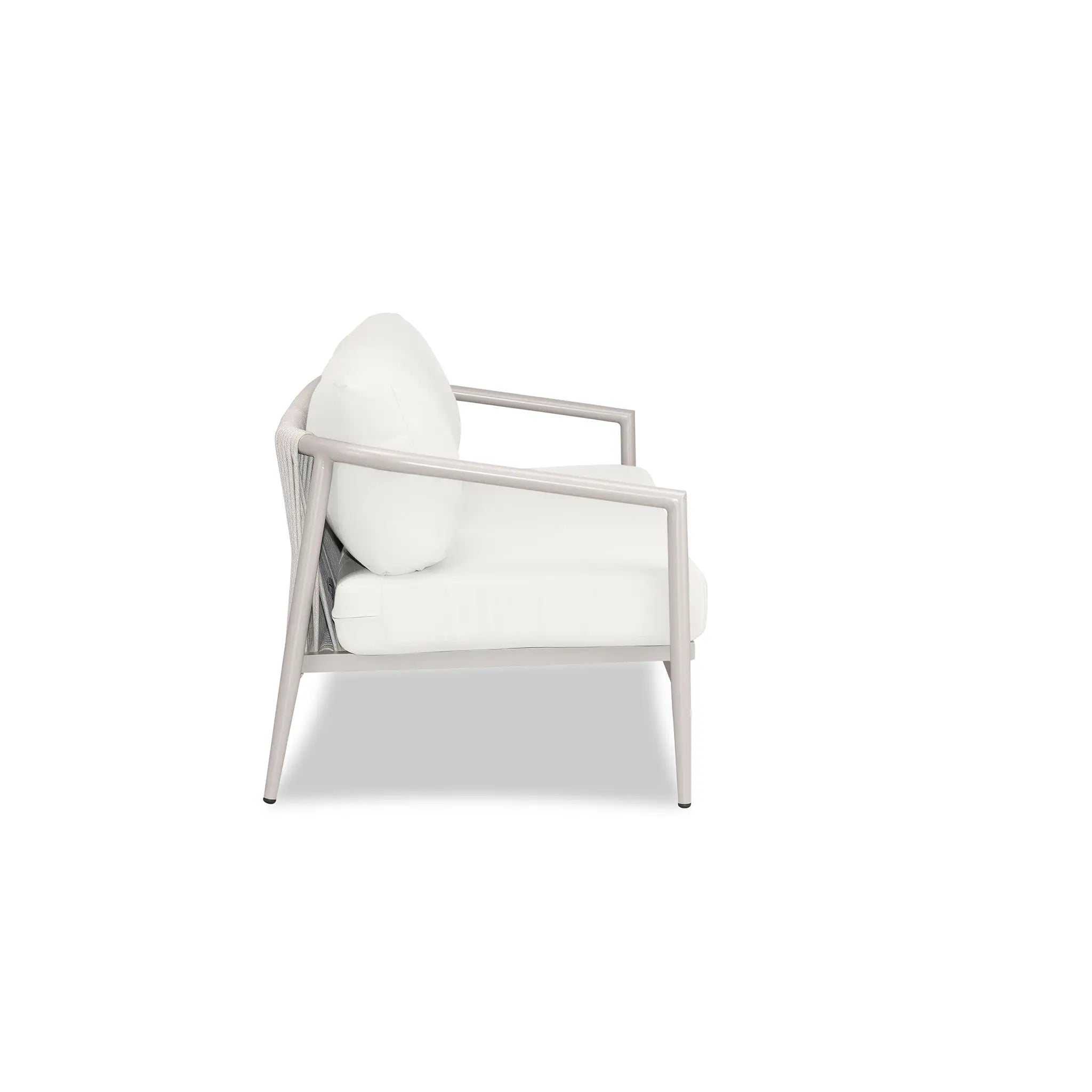 With a mixture of elegant materials, the Harmonia Living Olio Aluminum Sofa - Urban Stone/Carrera is a Mid-Century Modern design brought to life with Olefin rope. Accented with tapered legs, subtle curves, and an intertwining roped back, the sophisticated silhouette of the Olio collection is a true work of art. Designed with efficiency in mind, it features a compact footprint while still offering full-sized deep seating comfort.