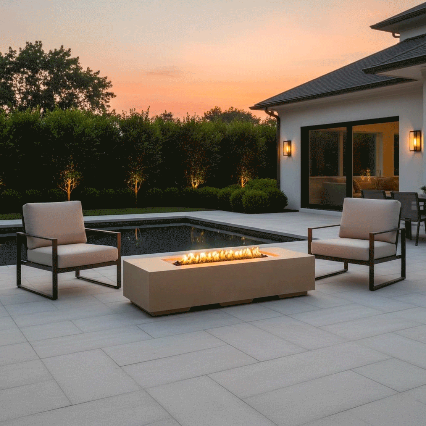 A backyard fire pit with a warm sand finish acts as the focal point of a paved residential patio, positioned between two metal-frame armchairs and a swimming pool. The rectangular fire table is illuminated by exterior wall sconces and a soft sunset glow. Steady amber flames flicker from the gas fire pit, demonstrating how this architectural fire feature enhances the aesthetic of a manicured outdoor living area.