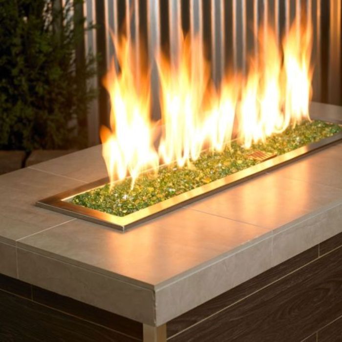 A sleek linear fire pit showcasing American Fire Products 1/4" Evergreen Reflective Fire Glass, where vibrant green glass pieces shimmer beneath tall golden flames—bringing a lush, earthy elegance to this contemporary outdoor centerpiece.