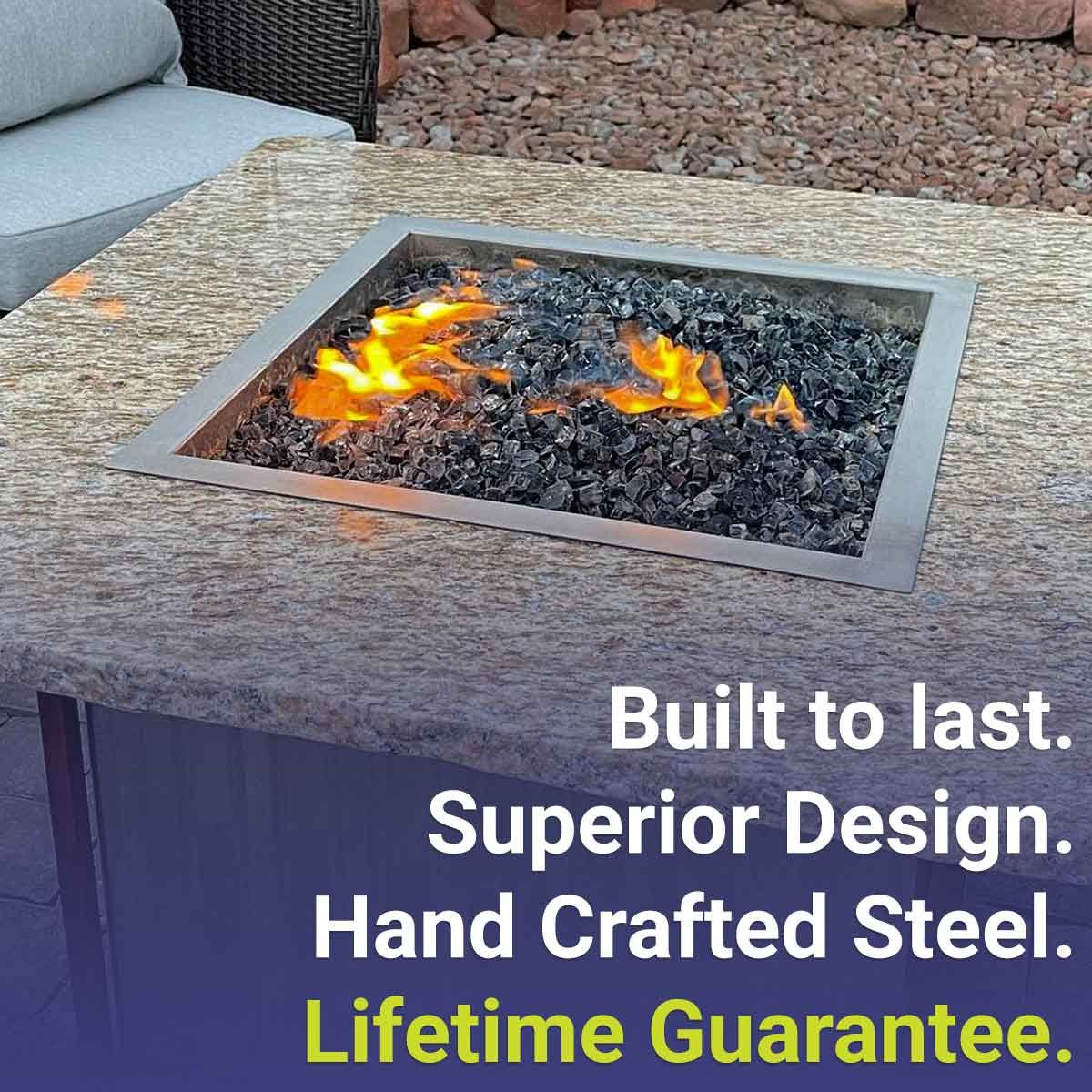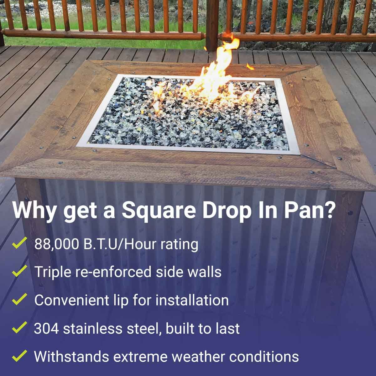 Simple to install and easy to maintain, the Square Drop-In Pan drops cleanly into your fire pit opening, ready for hookup. Just connect your gas supply, position your burner, add your media, and enjoy a reliable, professional-looking flame display.