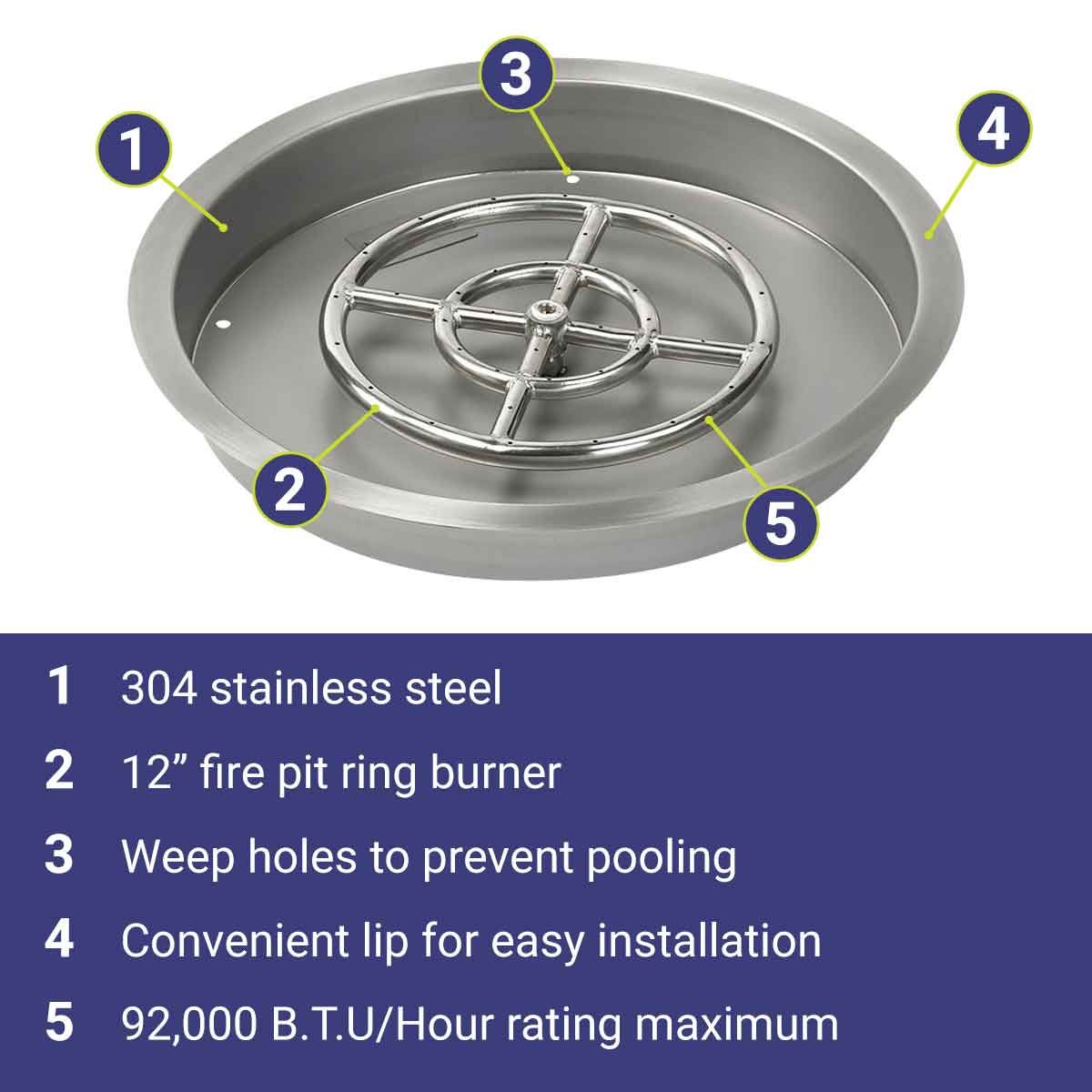 Made from premium 304 stainless steel, the round pan is built to withstand extreme temperatures and outdoor elements, including rust and corrosion. Its sleek, drop-in design features precision-drilled weep holes for proper drainage and reinforced edges for added structural integrity, ensuring long-lasting durability in any weather condition.