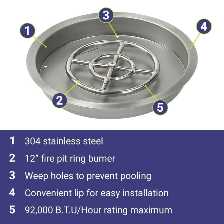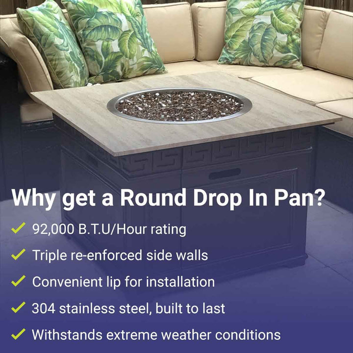 Whether you’re using natural gas or propane, this round drop-in pan supports a wide range of burner styles and fire media, from lava rock to fire glass, making it a versatile choice for custom or ready-made fire features. It’s available in multiple sizes to suit your specific installation needs.