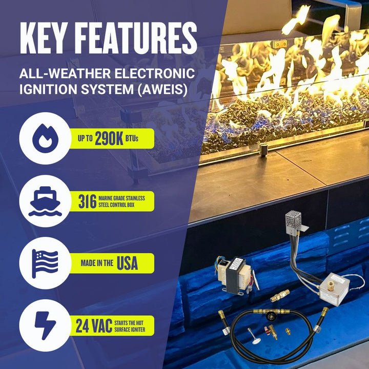 Powered by 24 VAC, the integrated AWEIS features a hot surface igniter that quickly lights the pilot flame. A thermopile sensor then activates the main gas valve for a smooth, full flame. If the flame is extinguished by wind or rain, the system automatically shuts off and re-ignites, ensuring safe and hassle-free operation.