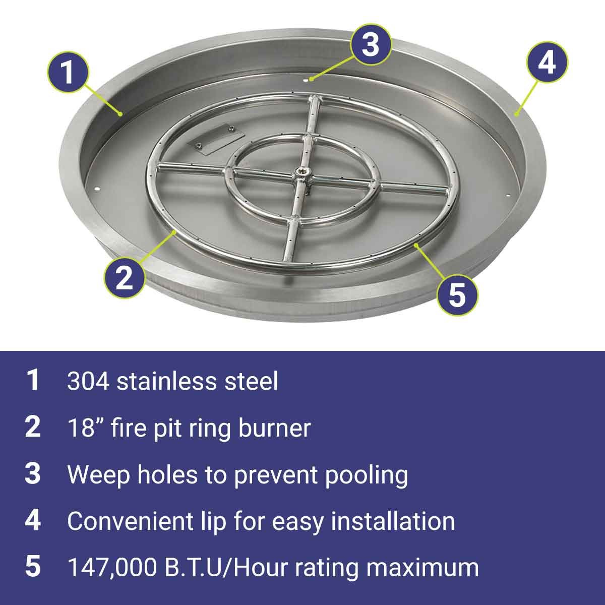 Whether you’re using natural gas or propane, this round drop-in pan supports a wide range of burner styles and fire media, from lava rock to fire glass, making it a versatile choice for custom or ready-made fire features. It’s available in multiple sizes to suit your specific installation needs.