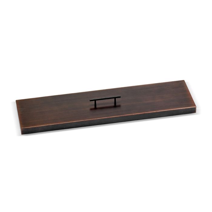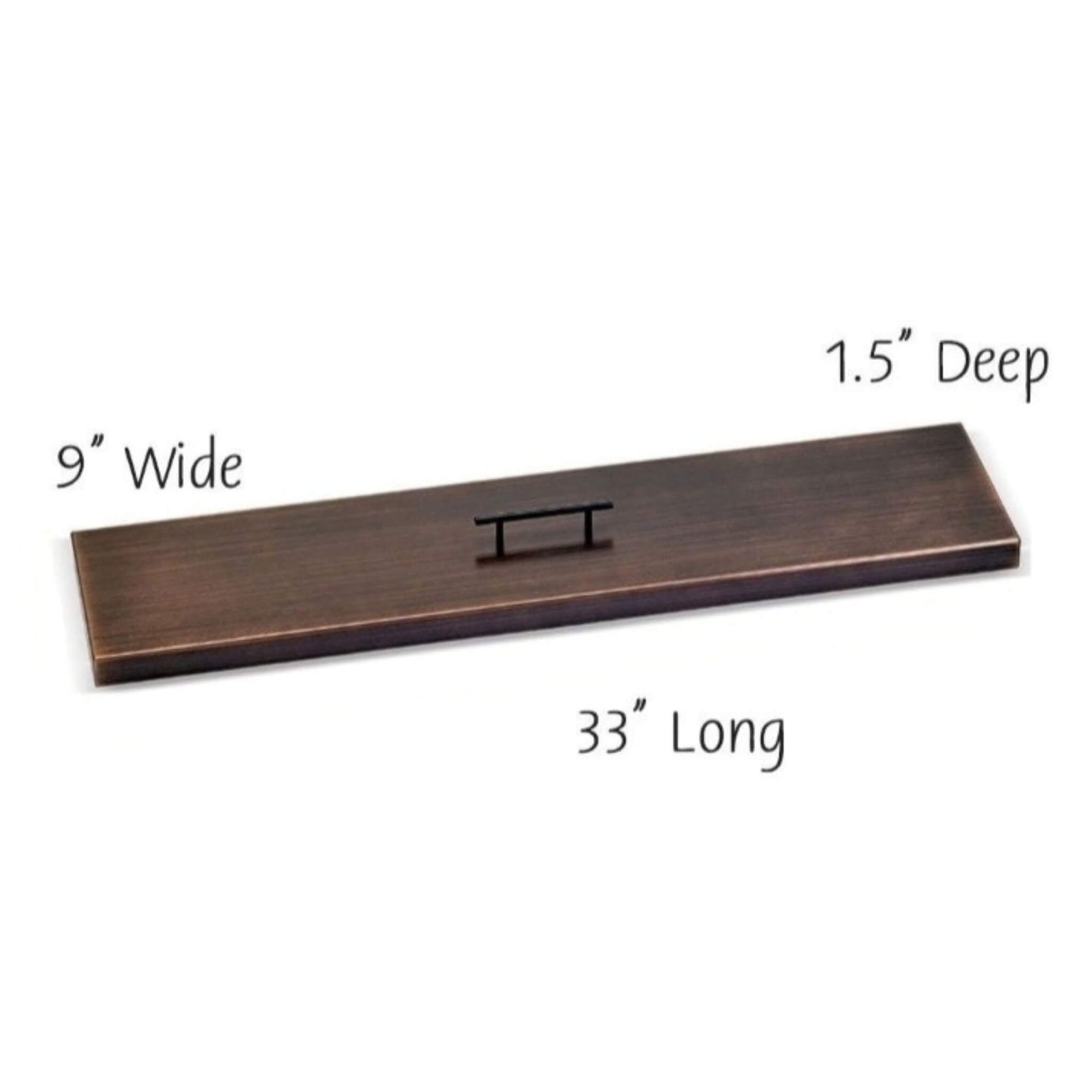 American Fire Products linear burner cover in oil-rubbed bronze, measuring 33" long by 9" wide and 1.5" deep, with a sleek built-in handle—designed to protect and complement your 30x6 fire pit pan with timeless style.