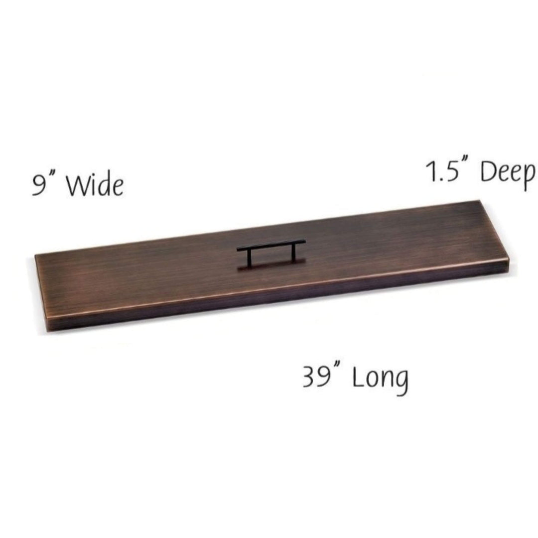 American Fire Products linear burner cover in a rich oil-rubbed bronze finish, measuring 39" long, 9" wide, and 1.5" deep—designed to stylishly protect a 36x6 linear fire pit pan while adding warmth and sophistication to your outdoor space.