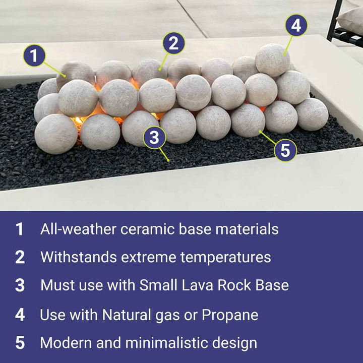 Crafted from high-heat resistant ceramic material, each 4" ball is designed to endure extreme temperatures without cracking, fading, or emitting smoke. Their smooth, matte finish and rounded shape bring a sculptural elegance to any fire pit or fireplace, offering a minimalist look that suits contemporary spaces.