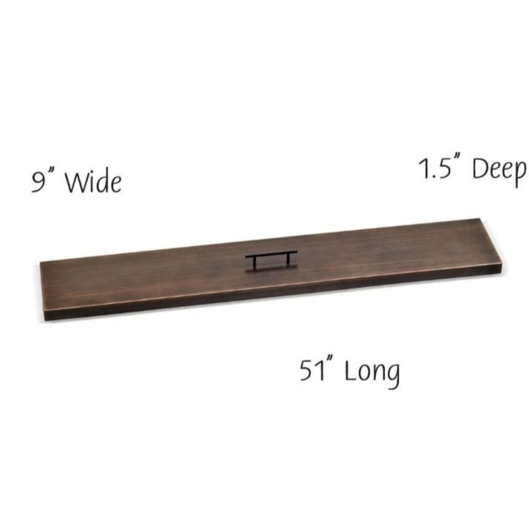 American Fire Products oil-rubbed bronze linear burner cover, measuring 51" long by 9" wide and 1.5" deep—designed for 48x6 fire pit pans, featuring a rich, warm finish and sturdy handle for elegant protection and easy removal.