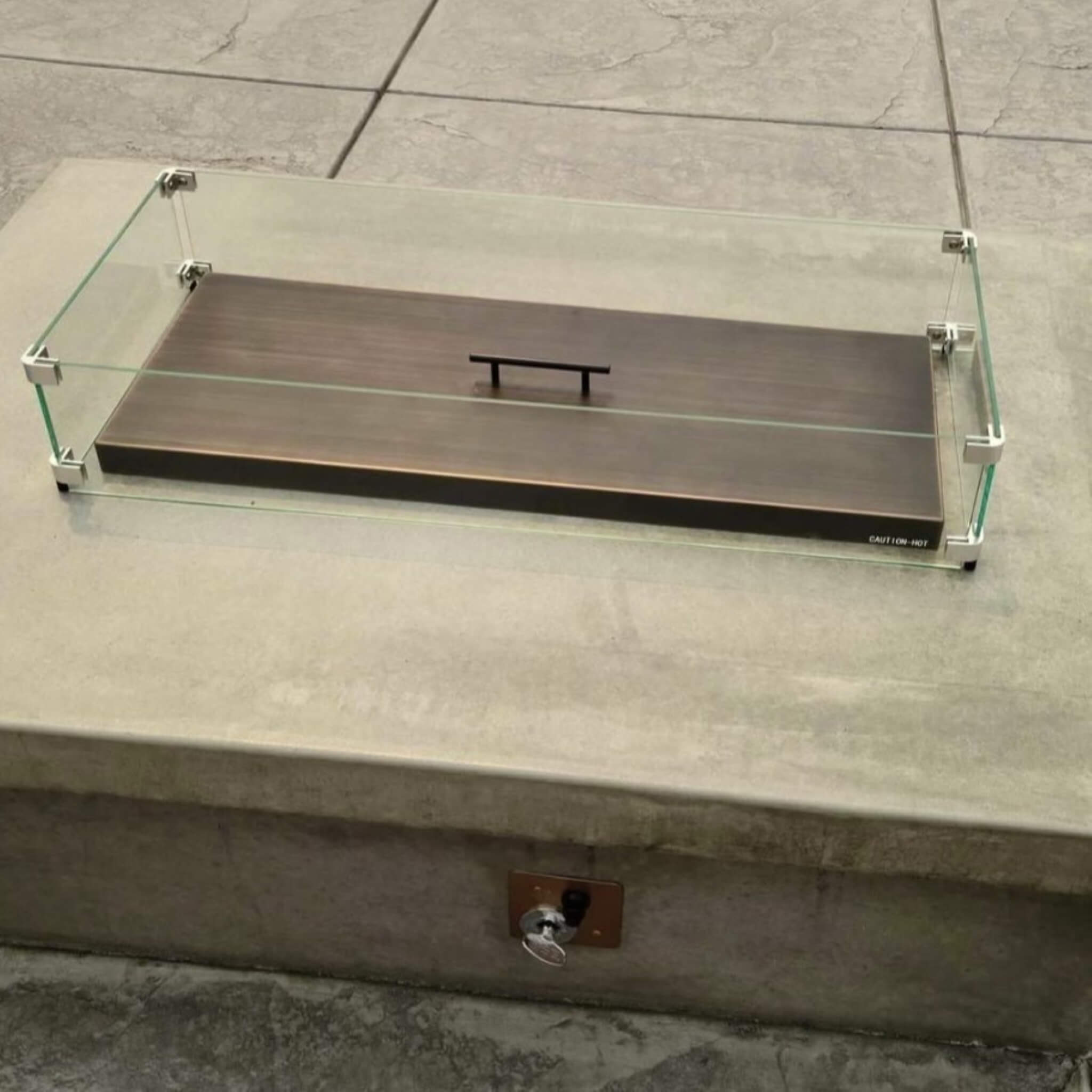 Outdoor fire feature with an oil rubbed bronze linear burner cover by American Fire Products, enclosed in a tempered glass wind guard atop a concrete base—blending durability, style, and safety in a modern patio setting.