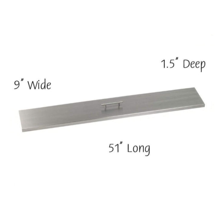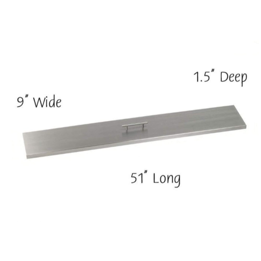 American Fire Products stainless steel linear burner cover, 51" long by 9" wide and 1.5" deep—perfectly sized for 48x6 fire pit pans, offering a sleek, modern finish and built-in handle for clean protection and easy handling.