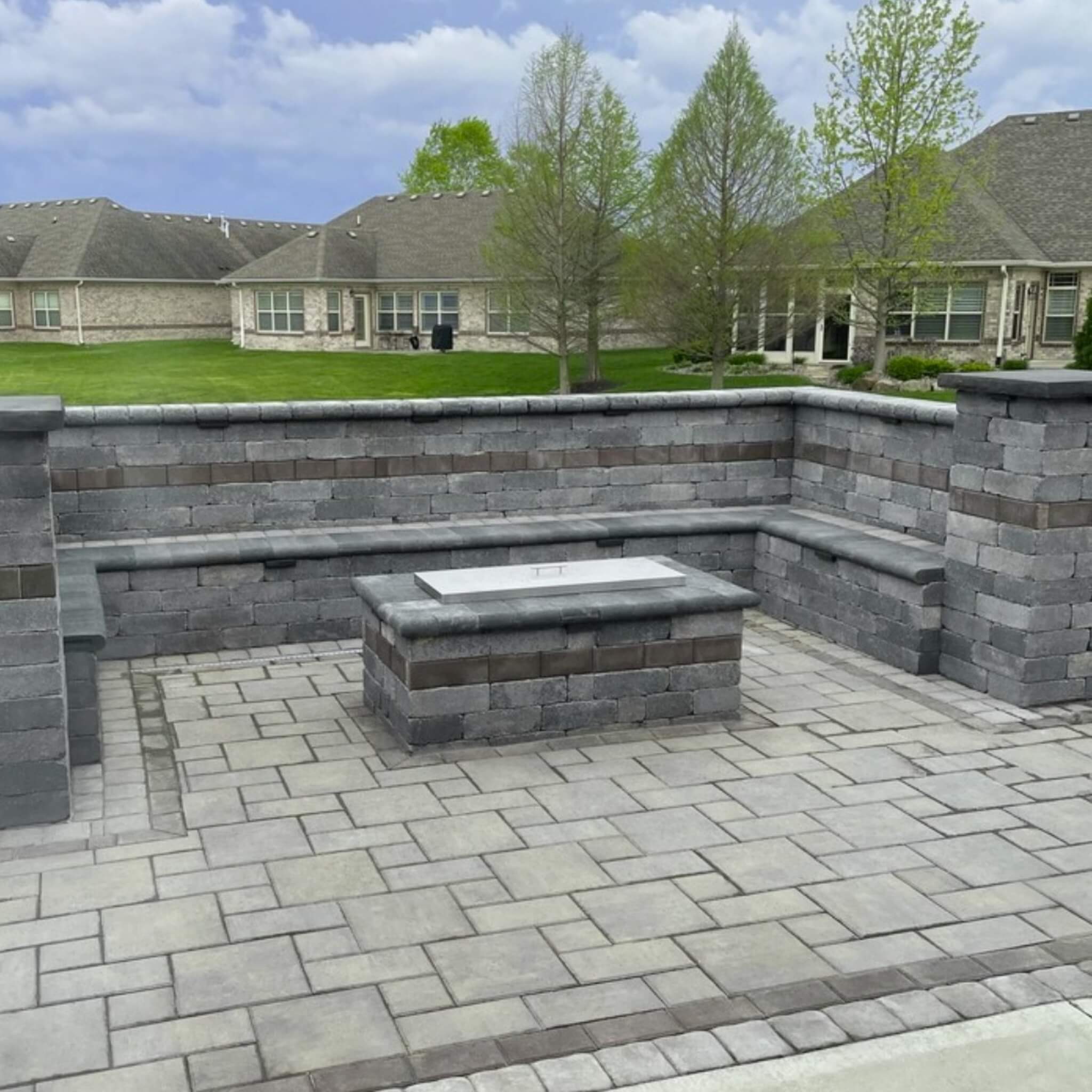 Modern outdoor patio with built-in stone seating and a central fire feature topped with an American Fire Products rectangular stainless steel burner cover—blending durability and sleek design for stylish backyard living.