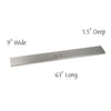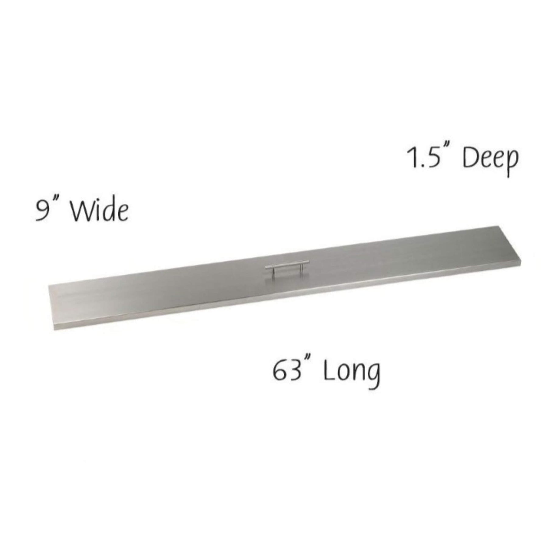 American Fire Products 60x6 linear burner cover in sleek stainless steel, measuring 63" long by 9" wide and 1.5" deep—perfect for protecting linear fire pit burners while adding a clean, modern finish with a centered handle for easy removal.