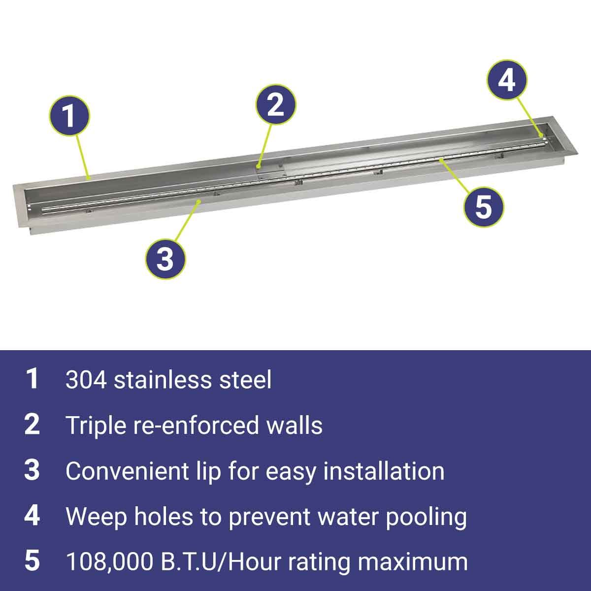 Simple installation and maintenance make this linear pan an excellent choice for both DIY enthusiasts and professionals. Pair it with your preferred burner and fire media to create a stunning focal point in your outdoor living space.