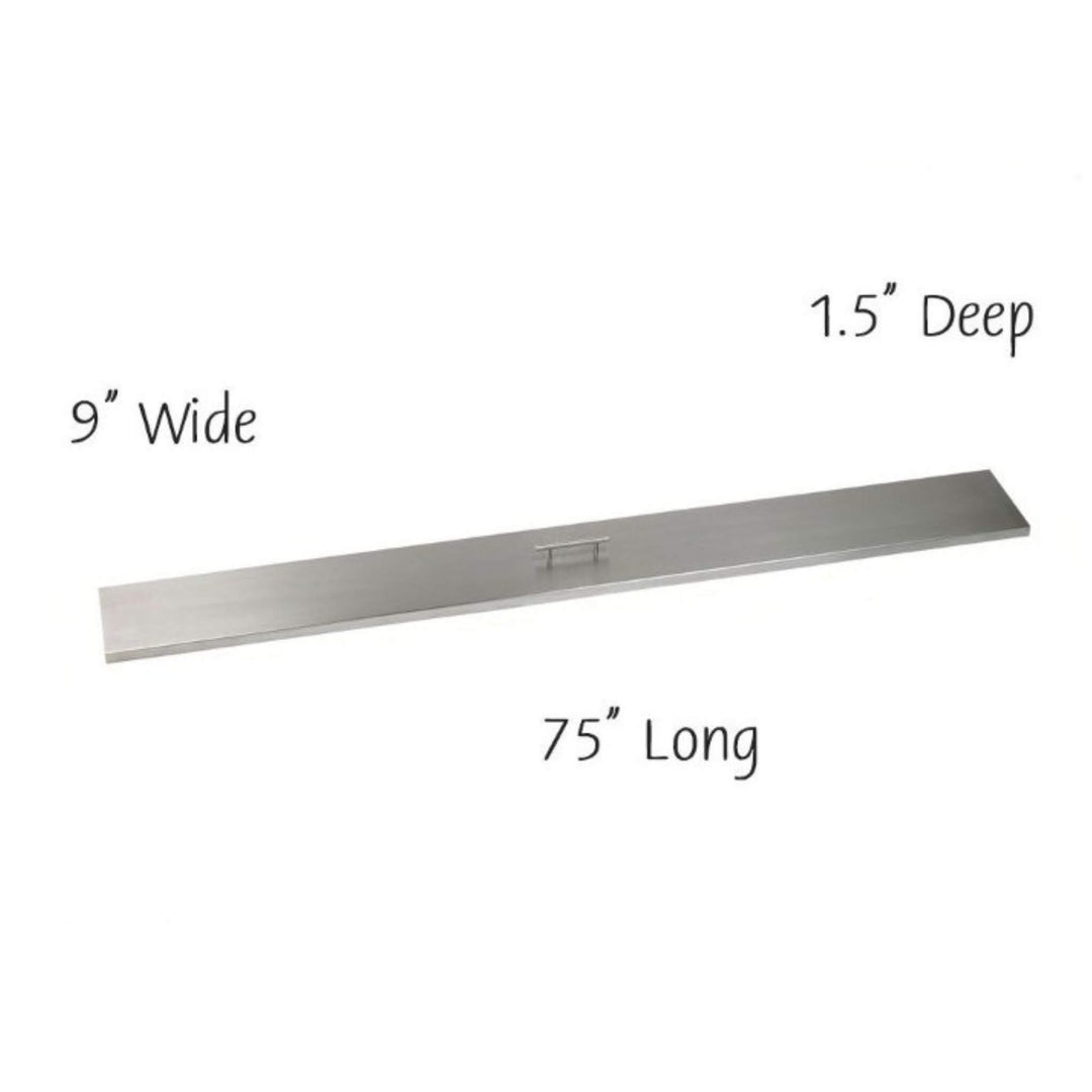 American Fire Products 72x6 linear burner cover crafted from sleek stainless steel, featuring a brushed finish, center handle, and clean profile—measuring 75" long, 9" wide, and 1.5" deep—perfect for modern fire pit protection and style.