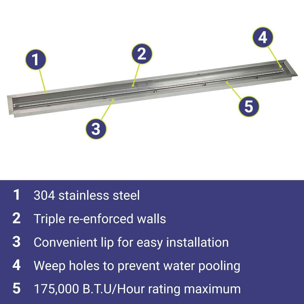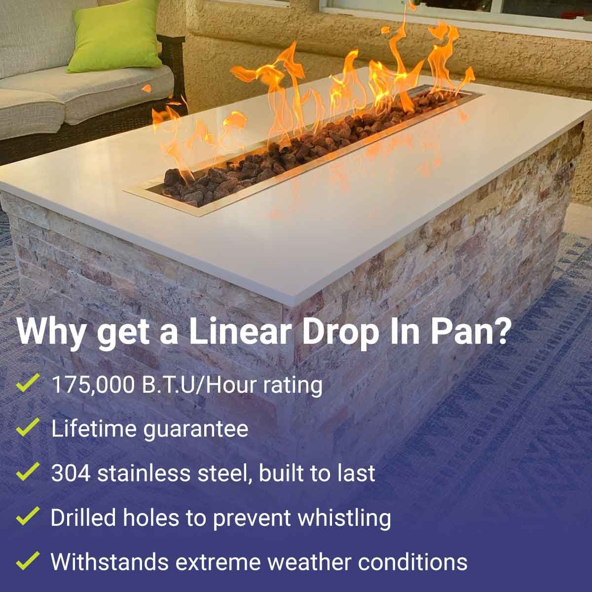 Simple installation and maintenance make this linear pan an excellent choice for both DIY enthusiasts and professionals. Pair it with your preferred burner and fire media to create a stunning focal point in your outdoor living space.