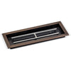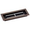 Close-up of a rectangular oil-rubbed bronze fire pit burner filled with natural lava rocks and smooth stones, set against a rustic wood tabletop for a contemporary outdoor fire feature.